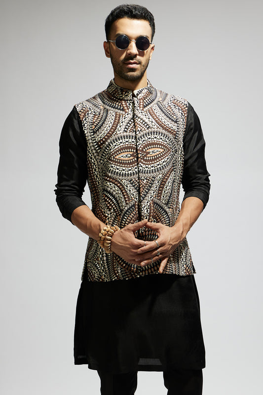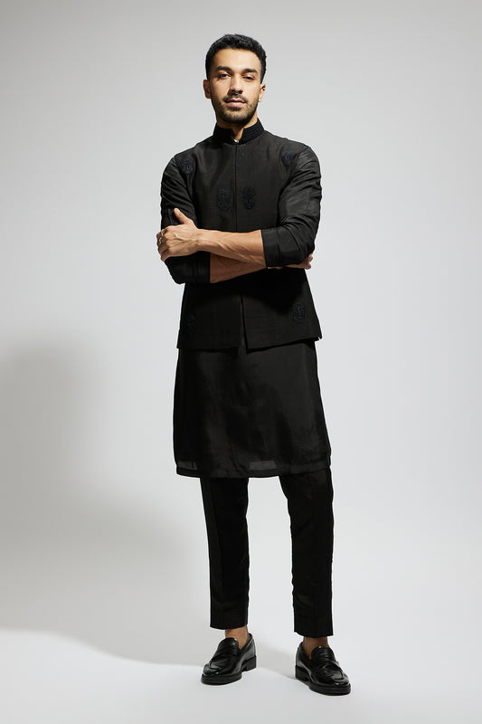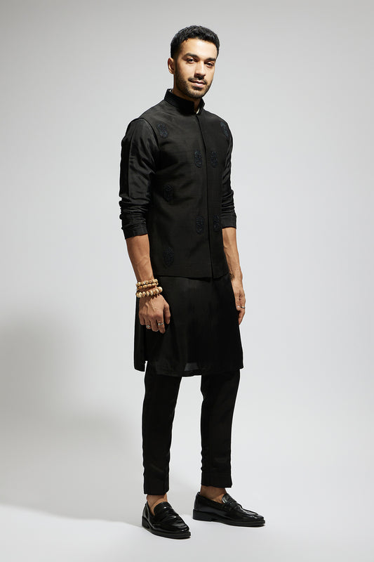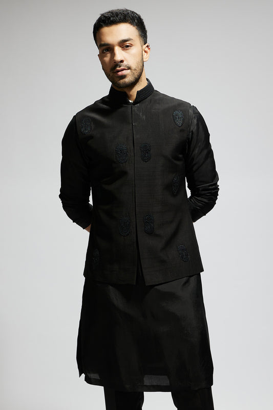 Black Mask Threadwork Bundi with Black Kurta and Pants