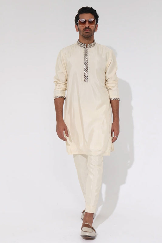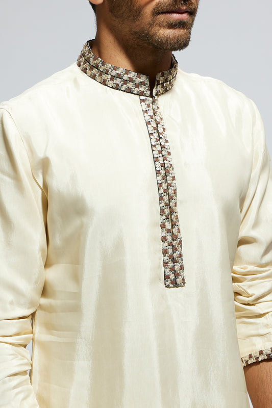 Beige Solid Kurta with Embellished Collar and Kurta Patti