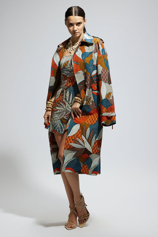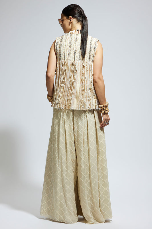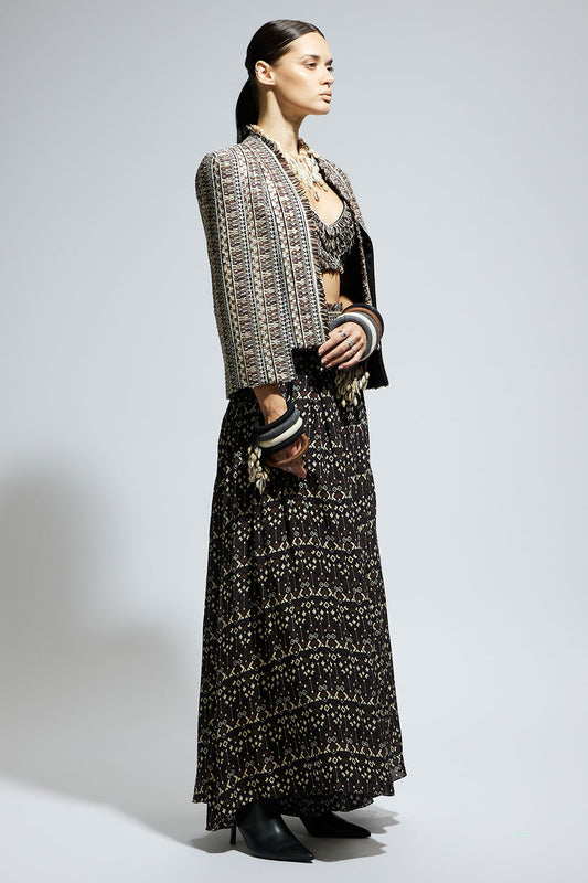 Ivory Mask Printed Box Pleated Skirt with Pockets Teamed with A Textured Bustier