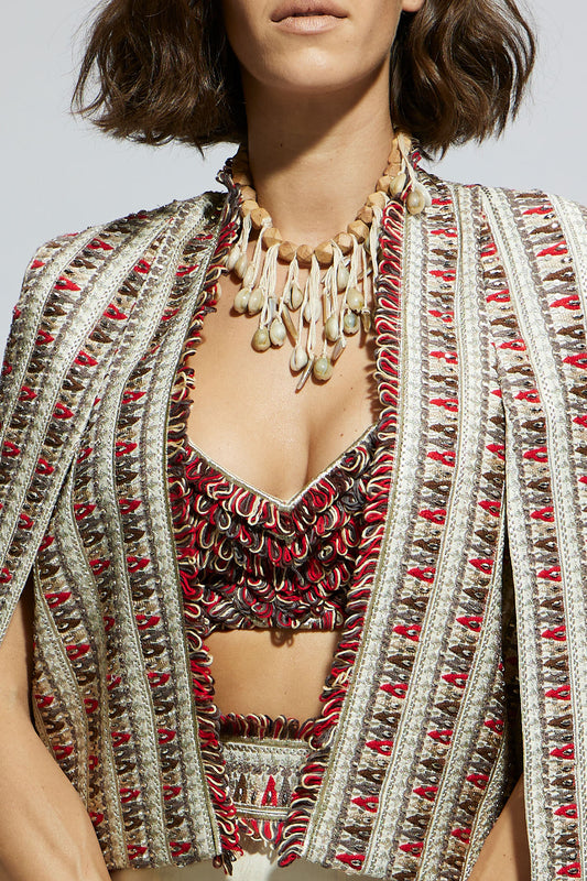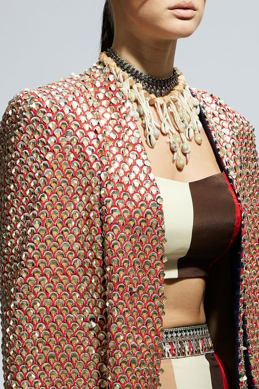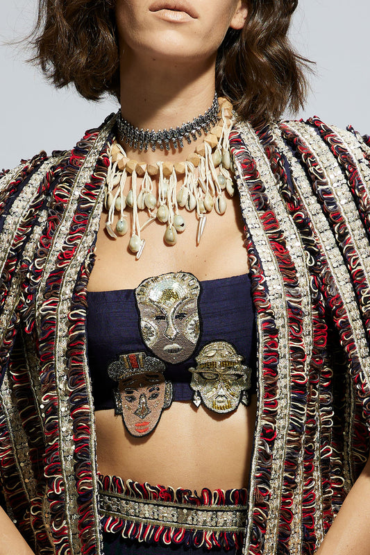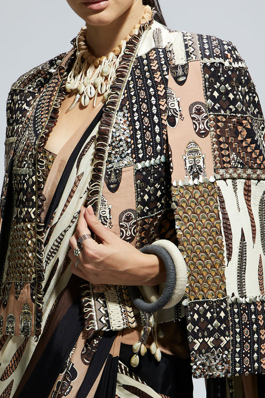 Mask and Feather Print Cascade Saree Paired with Metallic Scallop Bustier with Patchwork Cape Jacket