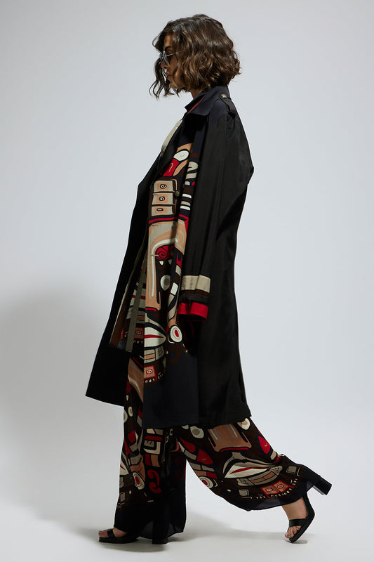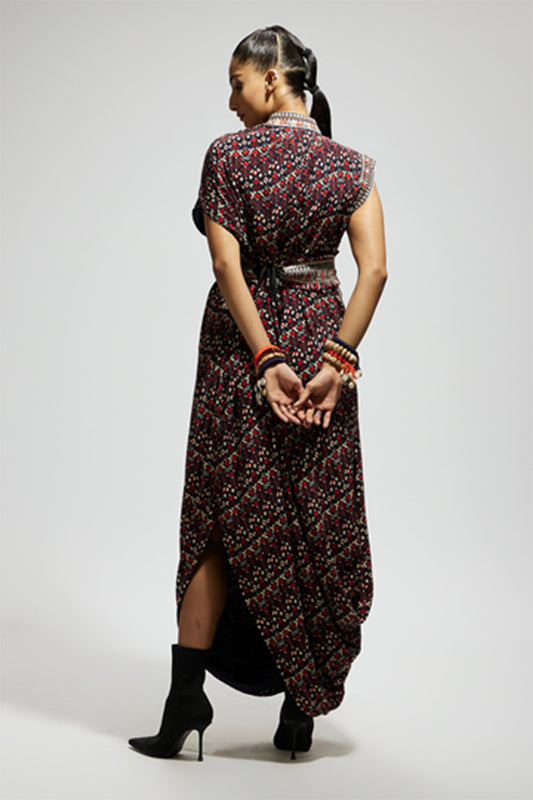 Color Block Mask Print Cascade Sari Paired with Black Abstract Embellished Blouse
