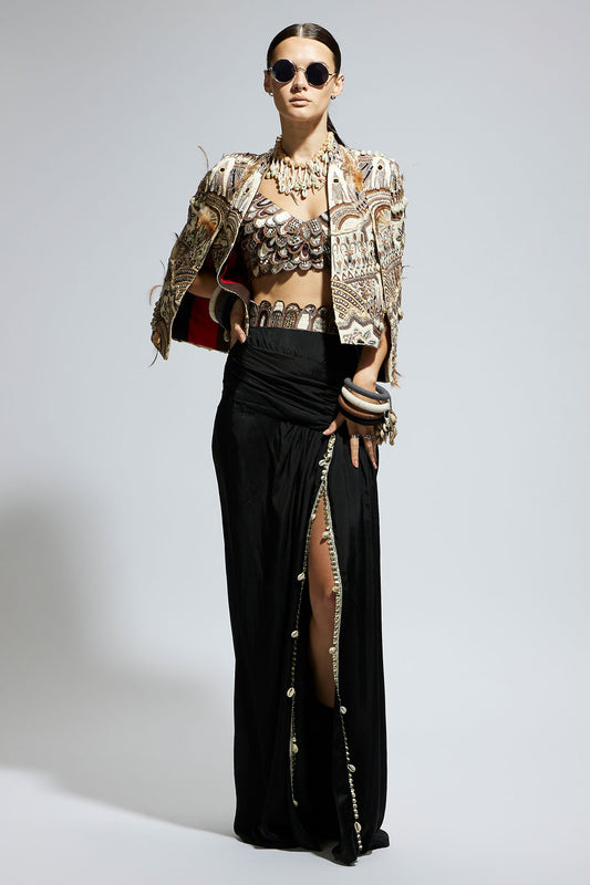Ivory Abstract Feather Cape Jacket Paired with 3 D Scallop Bustier and Black High Slit Skirt