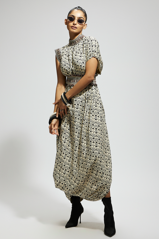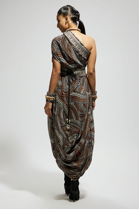 Zentangle Printed One Shoulder Cowl Dress Teamed with A Belt