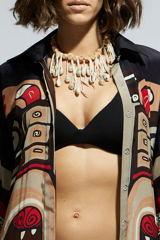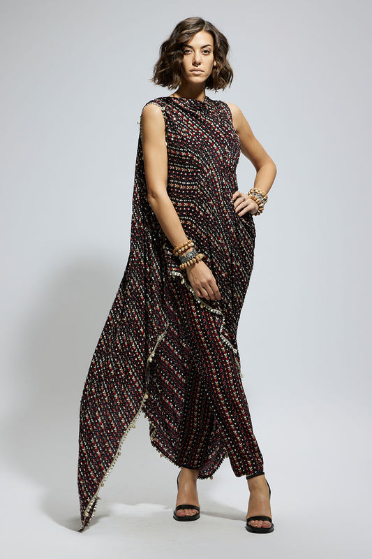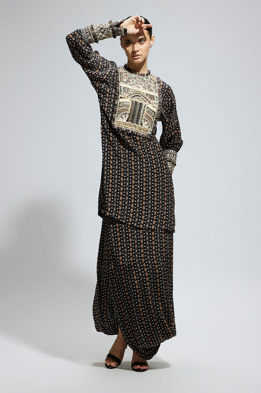 Black Boho Printed Yoke Embroidered Kurta with Drape Skirt