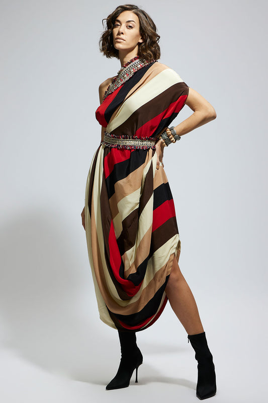 Samsara Stripe One Shoulder Cowl Dress Teamed with A Belt