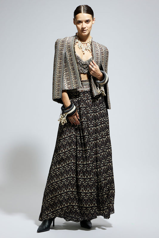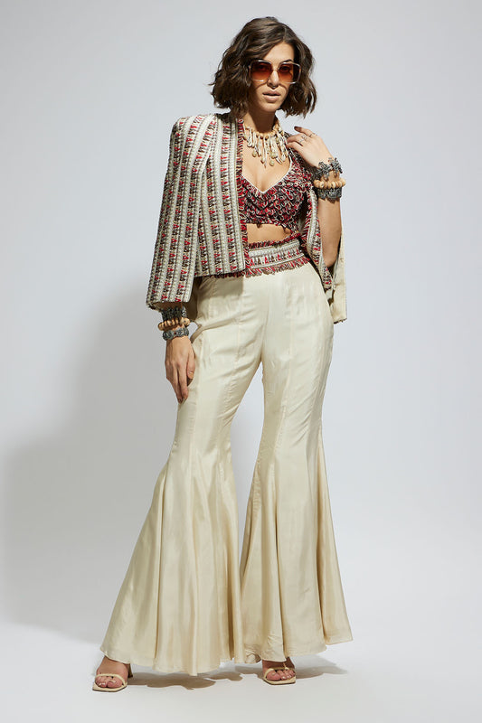 Ivory Embellished Cape Jacket Paired with Textured Bustier and Sharara Pants