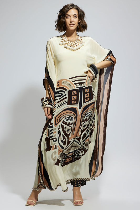 Black Mask Front Open Kaftan with Mask Printed Pants