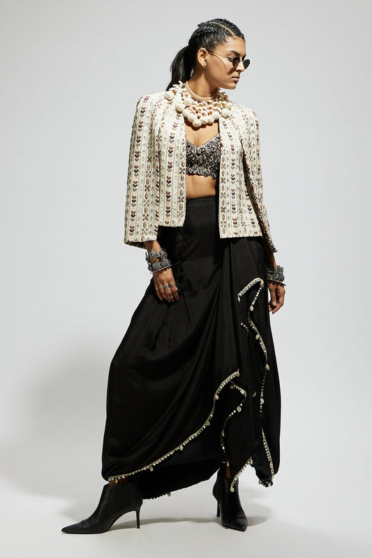 Ivory Embellished Cape Jacket Paired with Textured Bustier and Drape Skirt