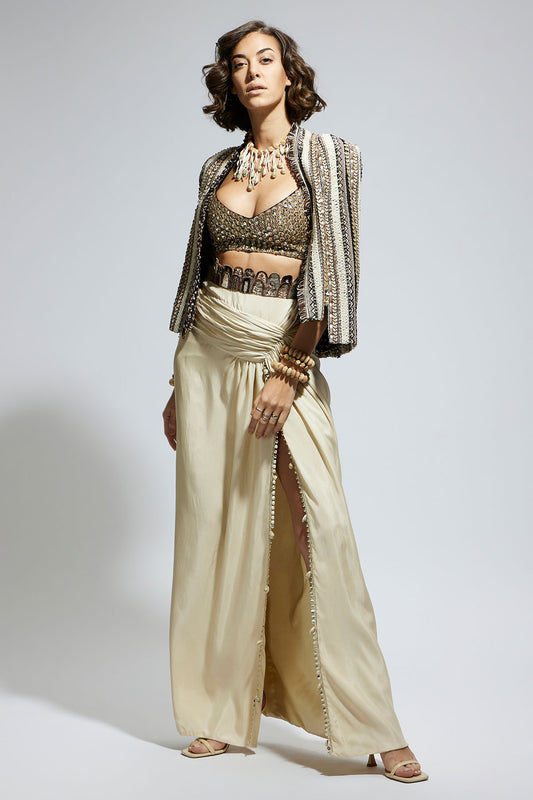 Embellished & Textured Cape Jacket Paired with Metallic Scallop Bustier and Ivory High Slit Skirt