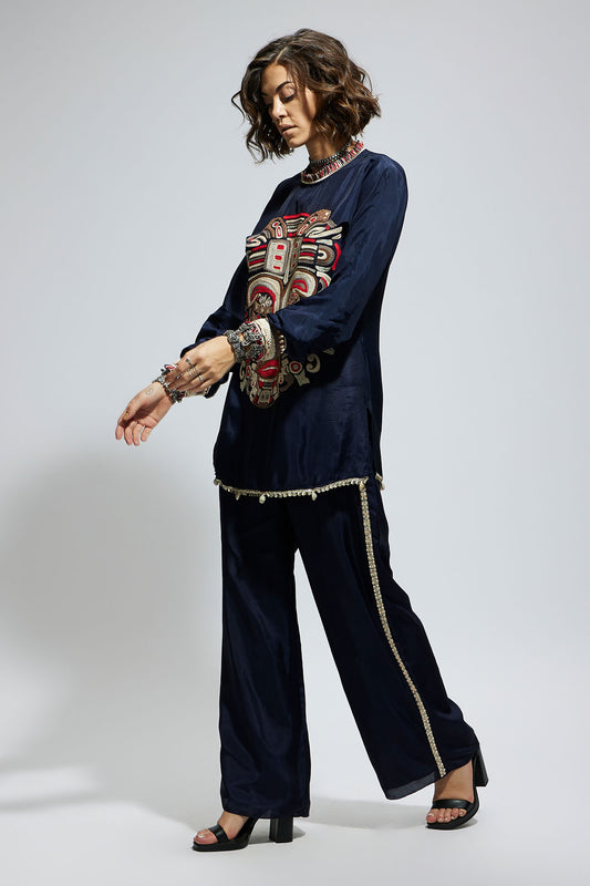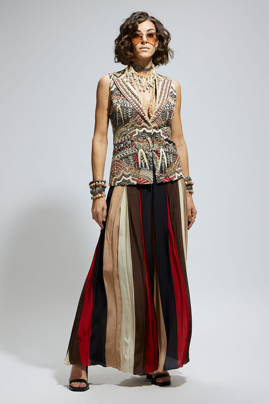 Blue Abstract Embellished Jacket Paired with Samsara Stripe Flared Pants
