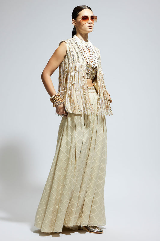 Ivory Threadwork Fringe Jacket Paired Wth Scallop Metallic Bustier and Ivory Aztec Flared Pants