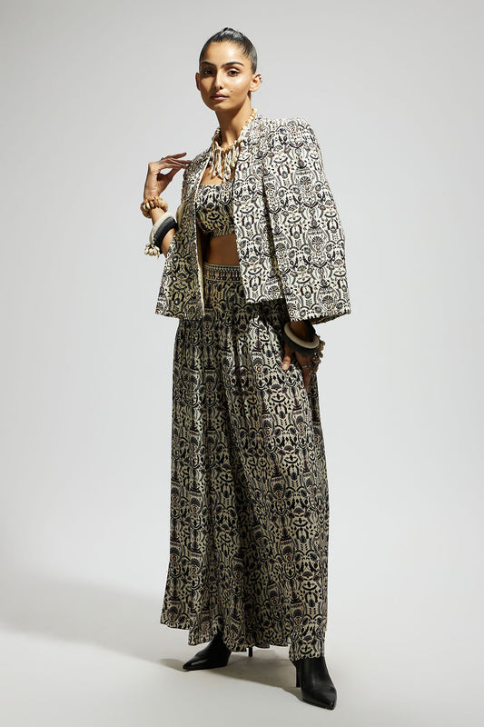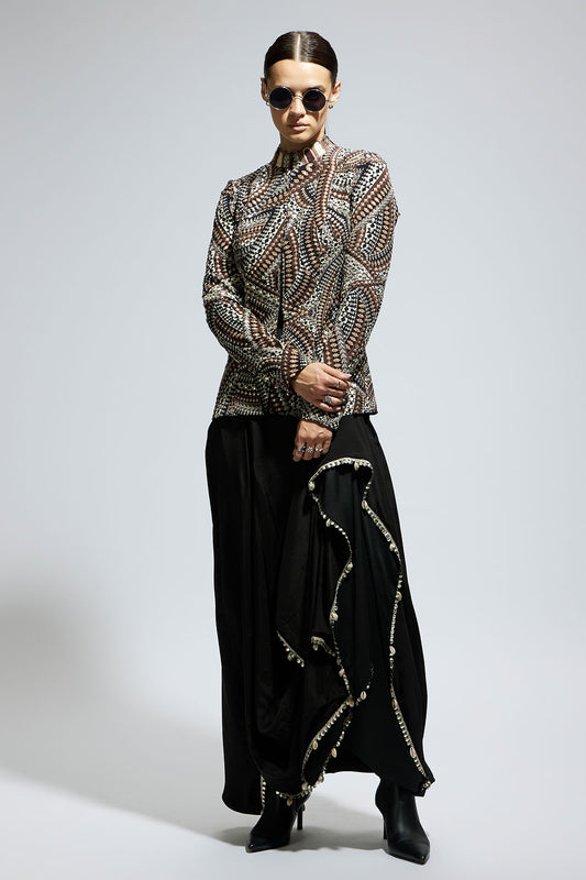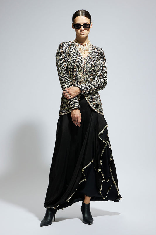 Zentangle Embellished Jacket Paired with Black Solid Nushrat Skirt