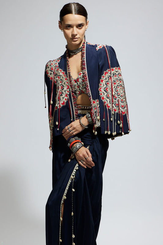Blue Asymetric Threadwork Cape Jacket Paired with An Embellished Bustier and High Slit Skirt