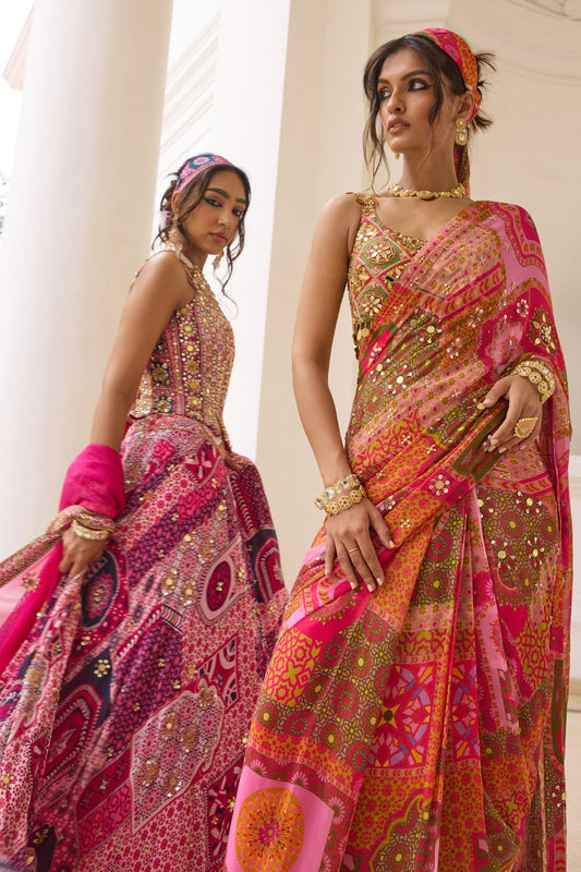 SAGE BUTTA PRINT AND HIGHLIGHTED ONE-SHOULDER BLOUSE WITH YELLOW-FUSCHIA PRE-DRAPED CLASSIC SAREE SET