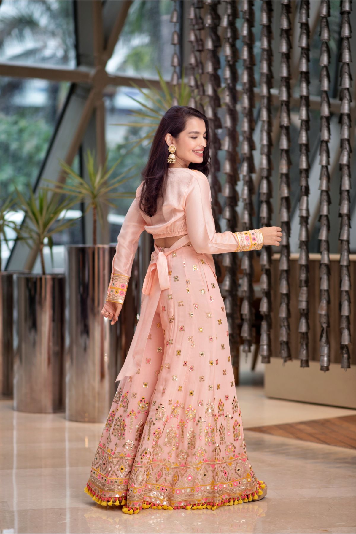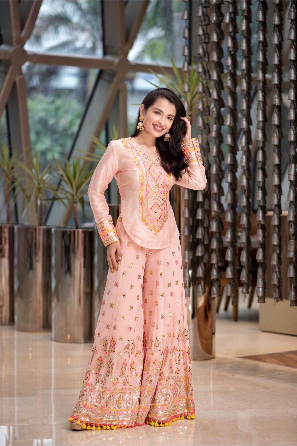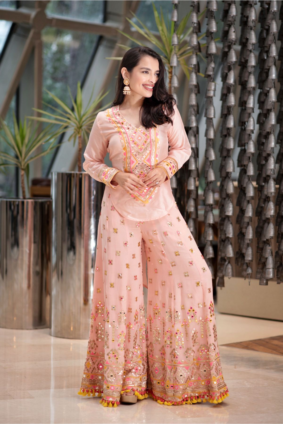 The Embroidered, Flared Pants With A Pretty Pink Shirt Yolk A Stunning Ensemble That Combines Traditional Craftsmanship With Contemporary Design. This Ensemble Features Intricate Mirror Work, Pompoms, And Tassels, Along With Detailed Hand And Machine Embroidery, Making It A True Work Of Art. A Smart And Stylish Set!