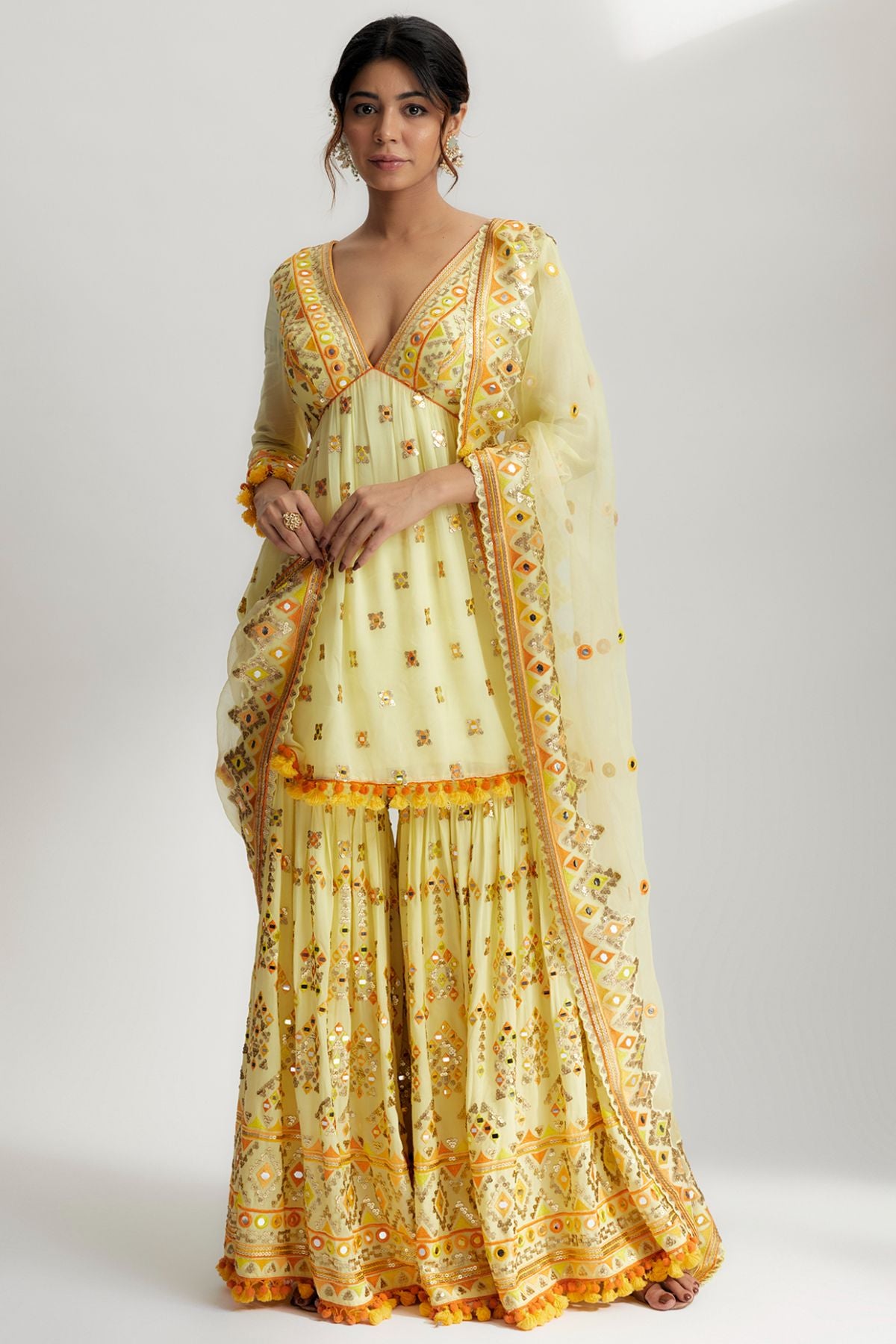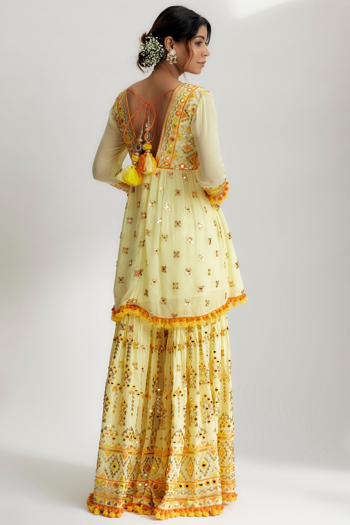 The Peplum with Sharara is not just a garment; it is a work of art. Its beauty and elegance make it perfect for special occasions, weddings, and festive celebrations. Step into the spotlight and embrace your inner glamour with this beautiful, pretty, and glamorous ensemble that will leave a lasting impression on everyone who sees it.