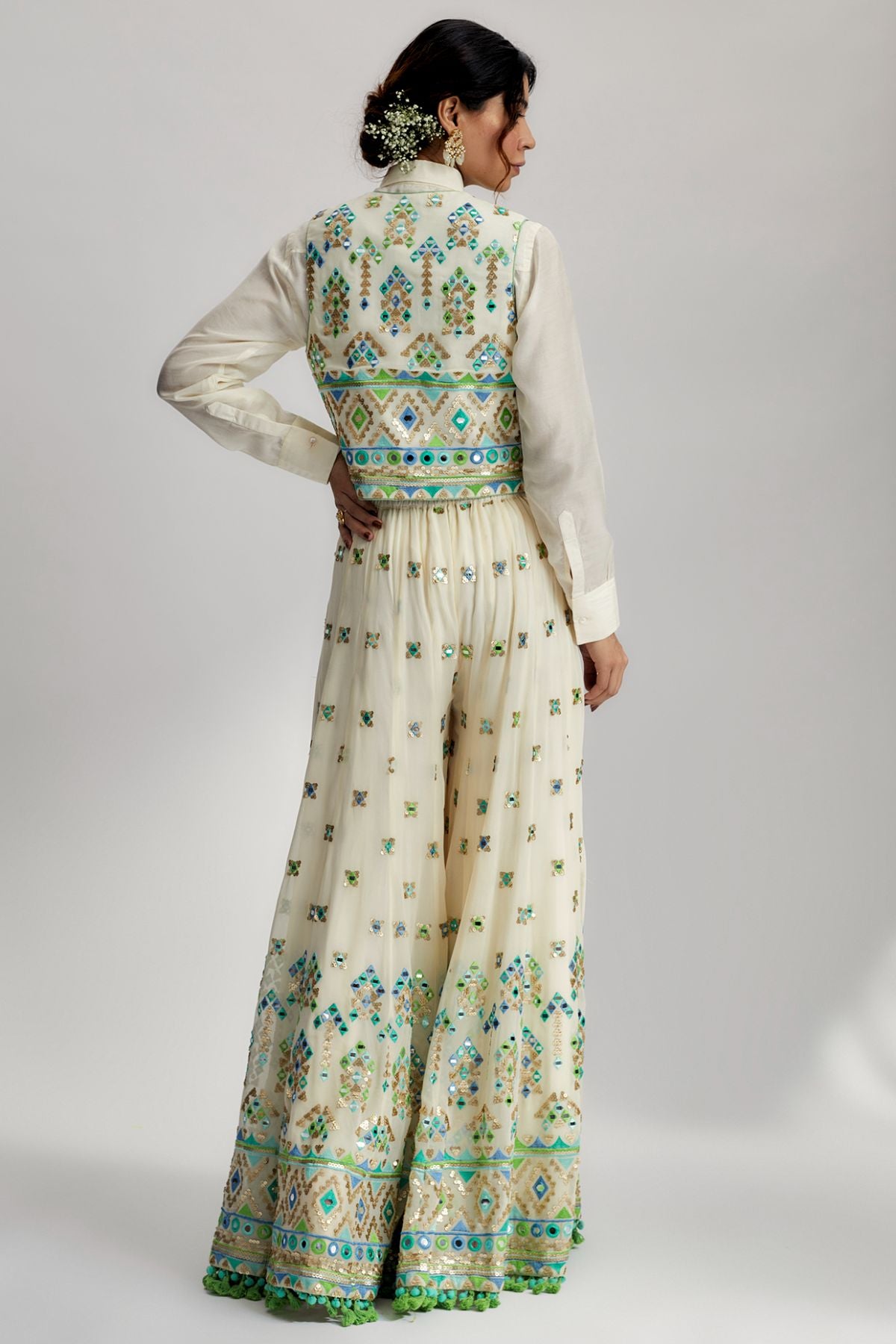 Introducing the exquisite Amara Jacket Set with Flared Pants, a stunning ensemble that combines traditional craftsmanship with contemporary design. This ensemble features intricate mirror work, pompoms, and tassels, along with detailed hand and machine embroidery, making it a true work of art.