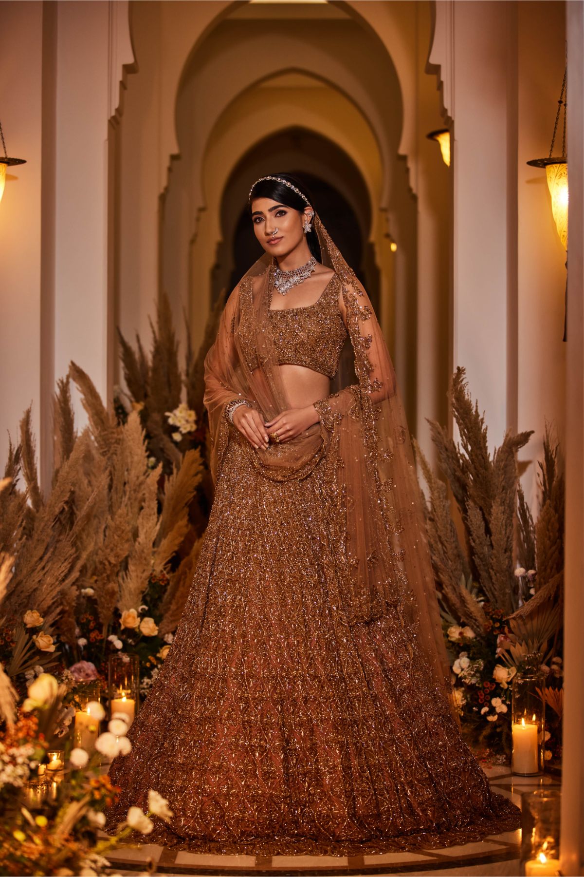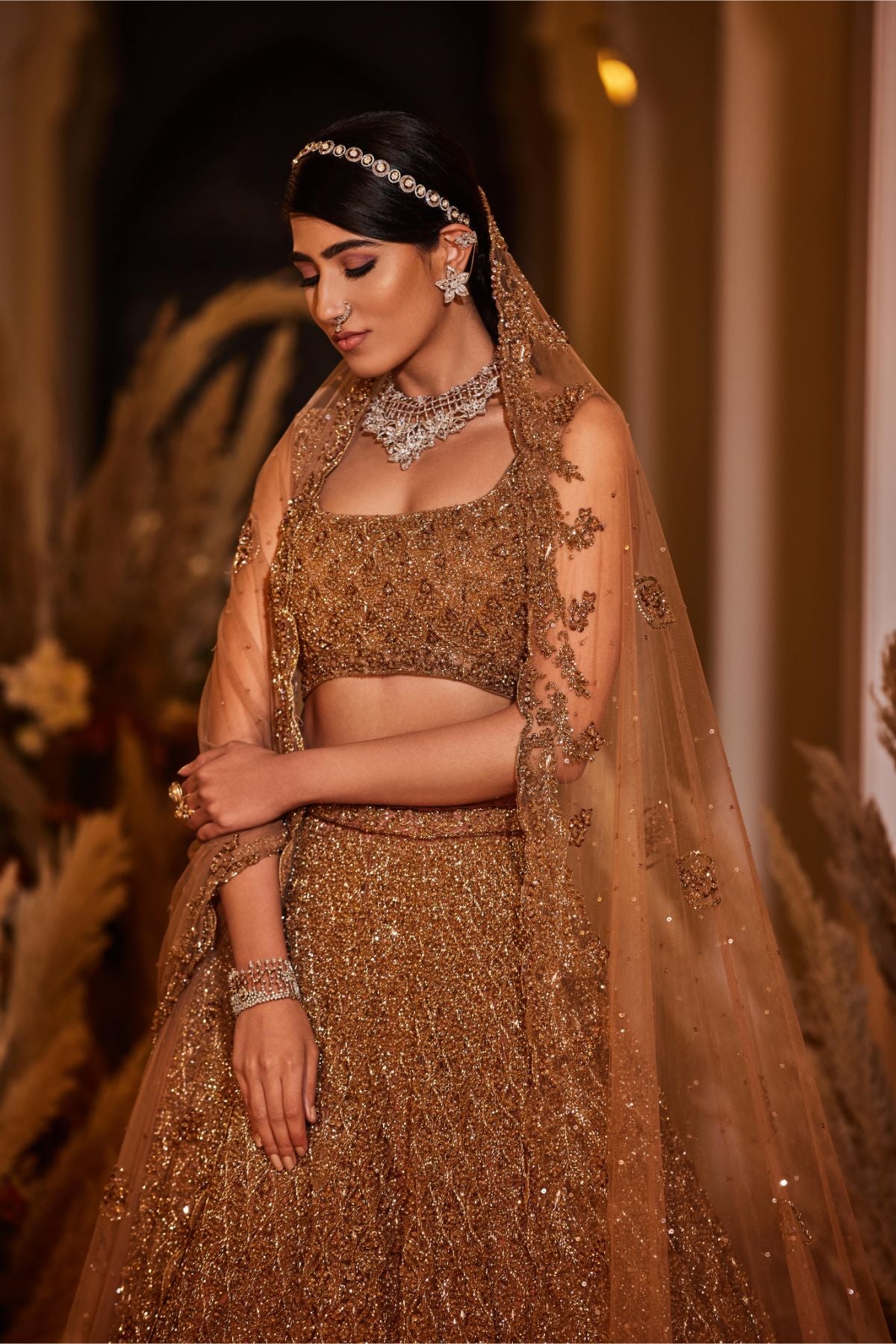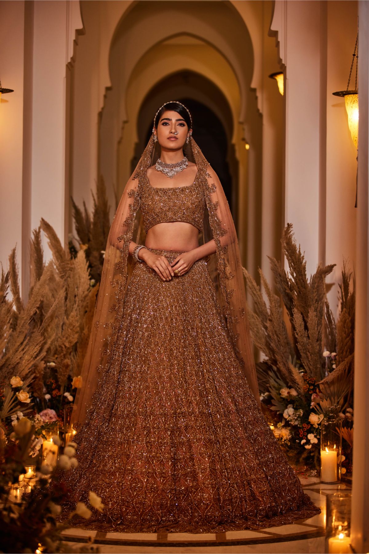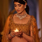 16 kalis lehenga set with dabka, sequin, crystal, and cutdana work done entirely by hand on tulle fabric. A tulle dupatta with dabka, sequin, crystal, and cutdana details completes this elegant lehenga combination.