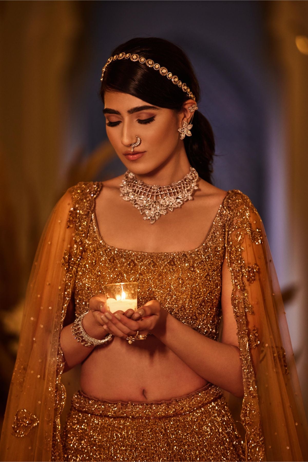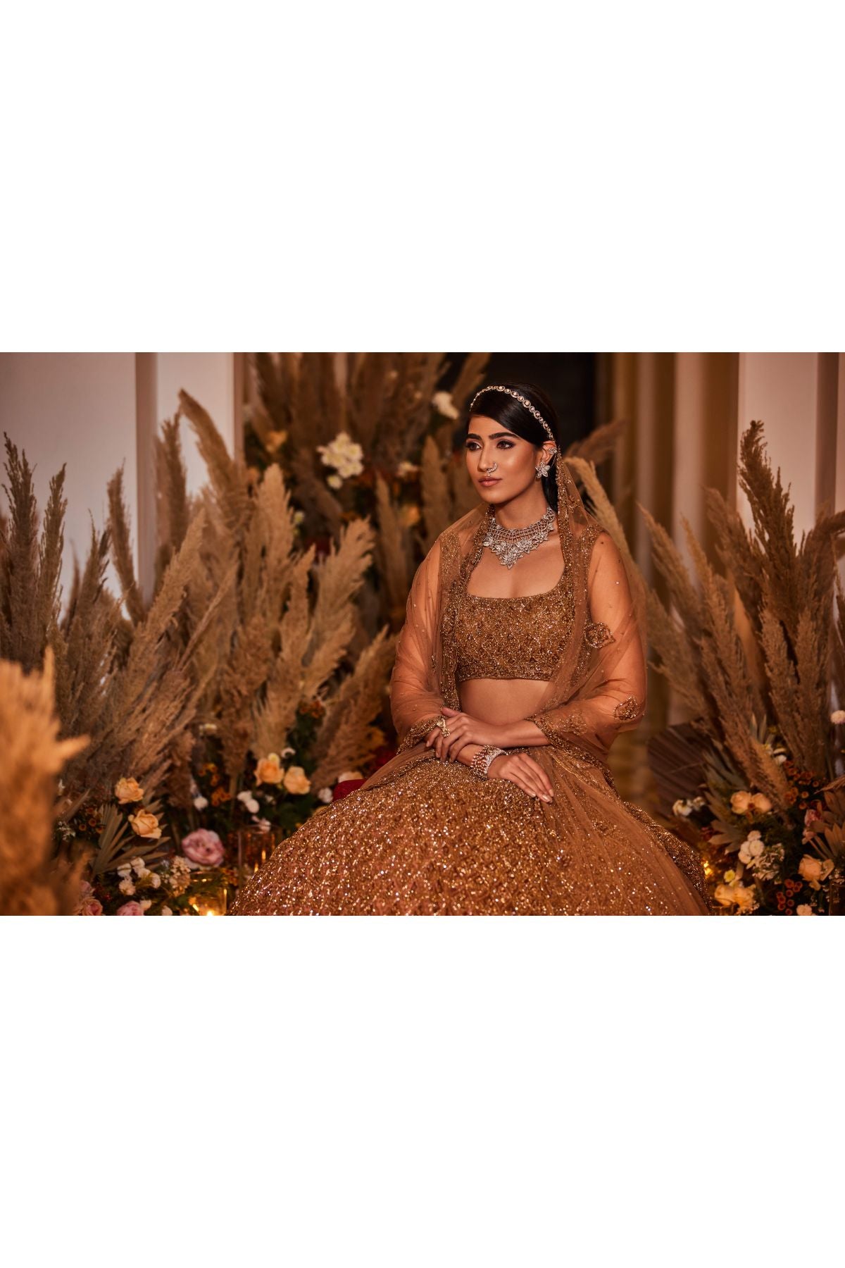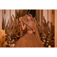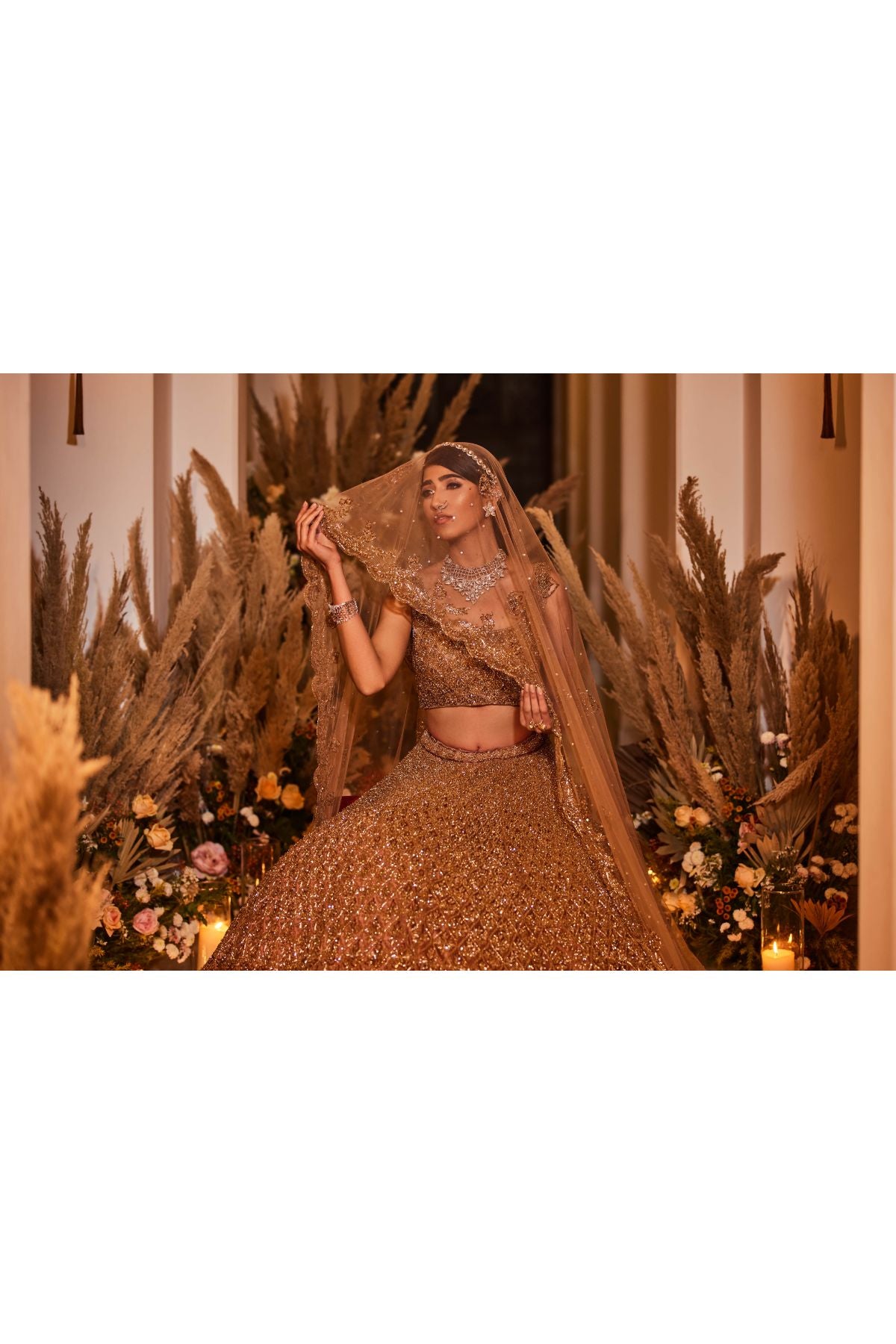 16 kalis lehenga set with dabka, sequin, crystal, and cutdana work done entirely by hand on tulle fabric. A tulle dupatta with dabka, sequin, crystal, and cutdana details completes this elegant lehenga combination.