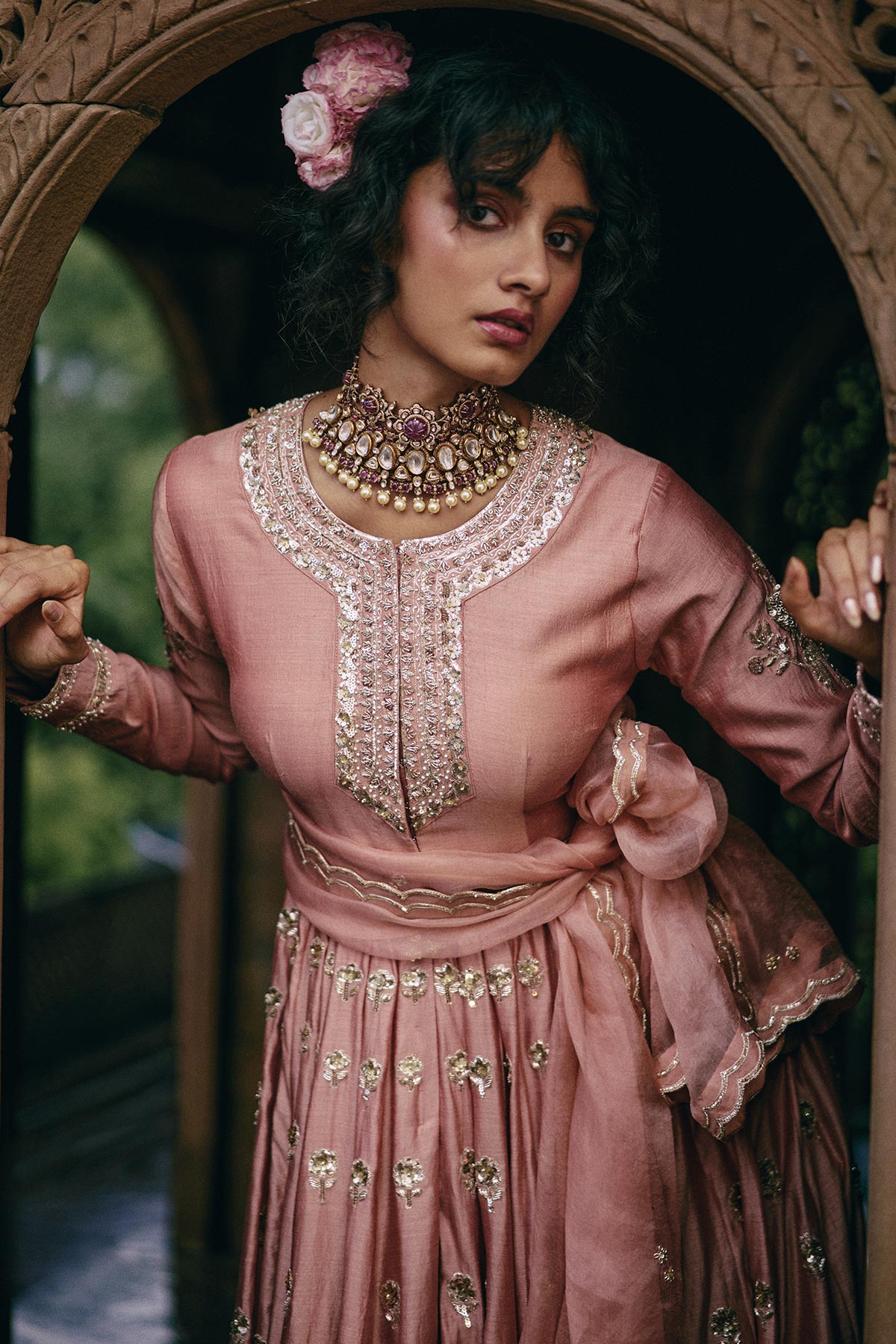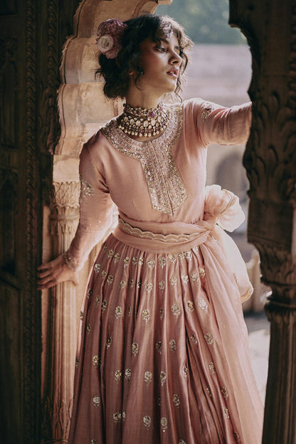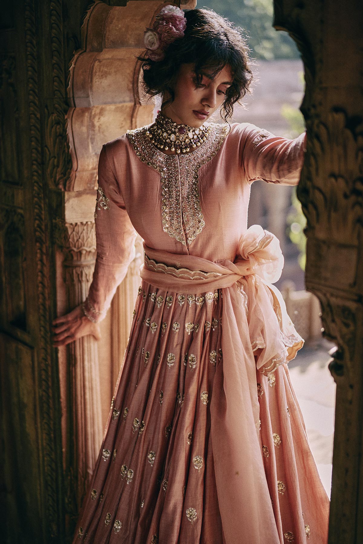 Fabric: Anarkali : Chiniya [dyed] Dupatta : Banarasi organza [dyed] Skirt : Chiniya silk [dyed] Lining : Santoon [dyed] Satin : dyed
