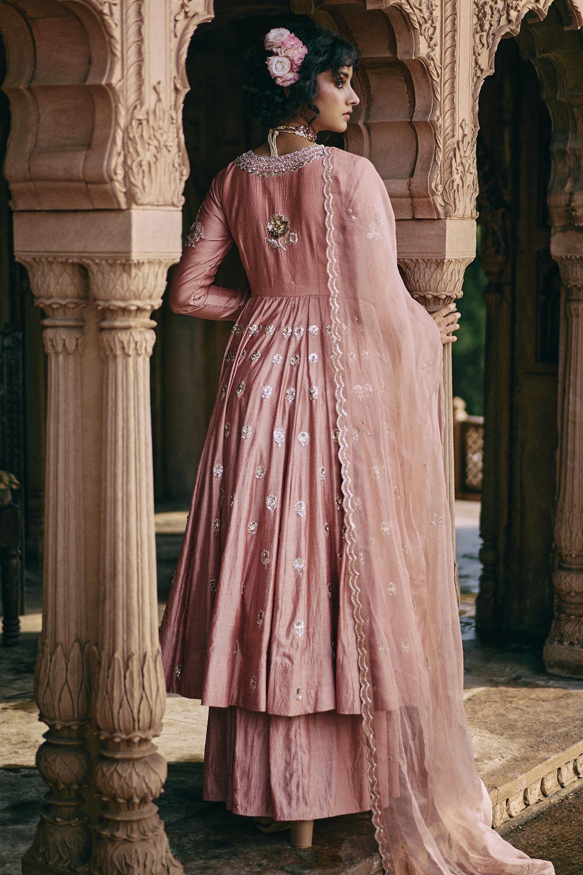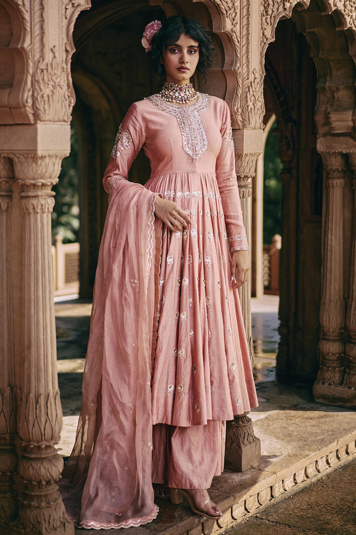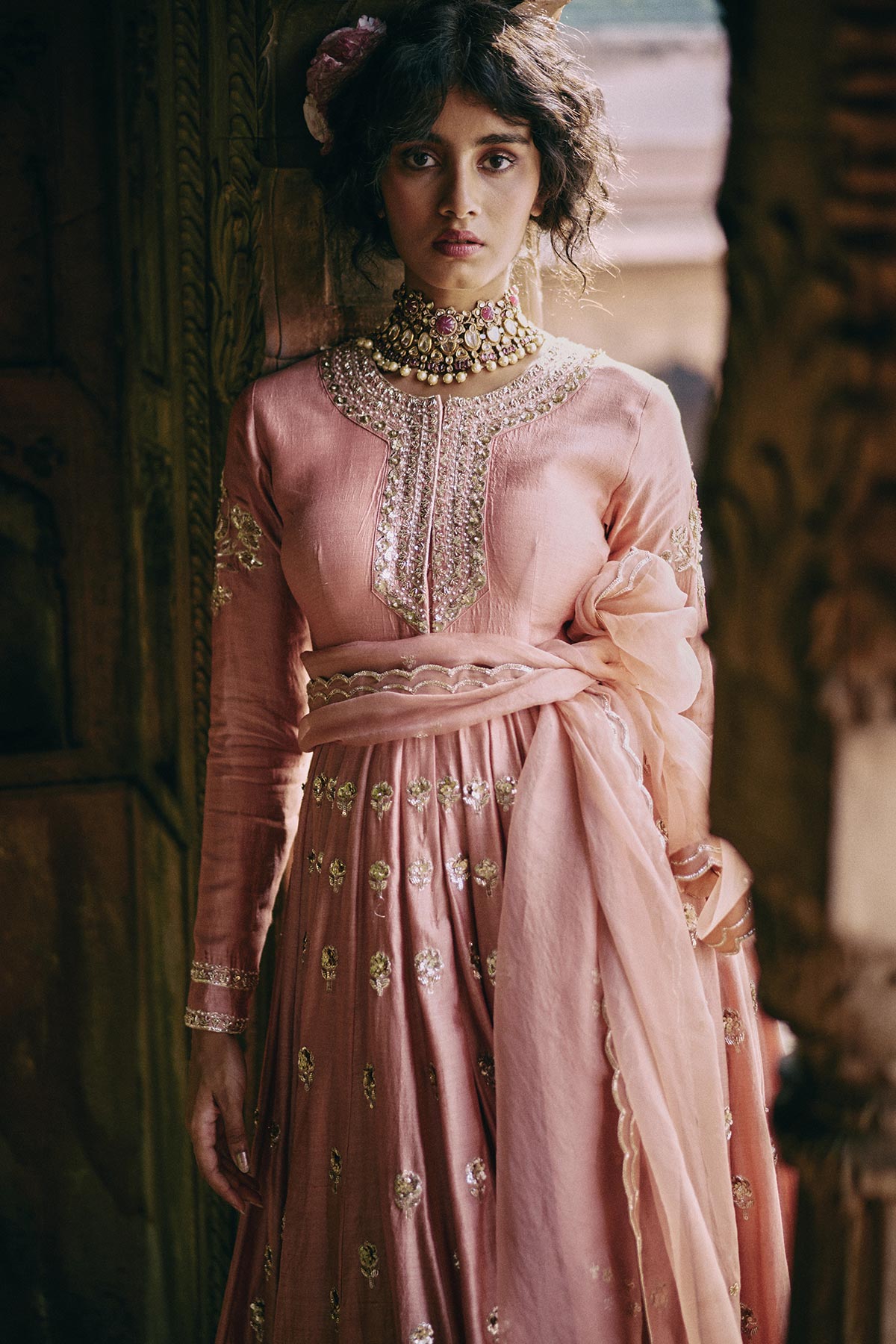 Fabric: Anarkali : Chiniya [dyed] Dupatta : Banarasi organza [dyed] Skirt : Chiniya silk [dyed] Lining : Santoon [dyed] Satin : dyed