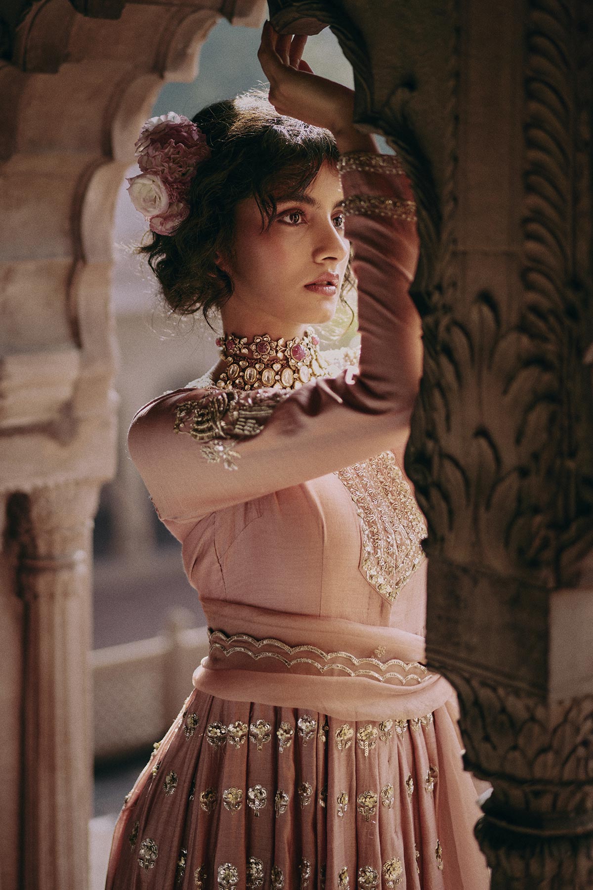 Fit: Anarkali : - Padded - Attached lining - Front hook opening -Fitted at bust and underbust Skirt : - It has drawstring and zip opening - attached lining - Fitted at waist