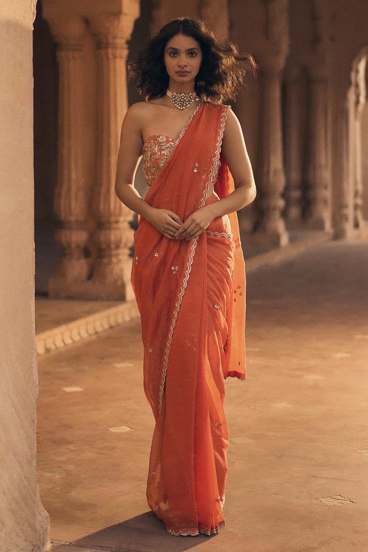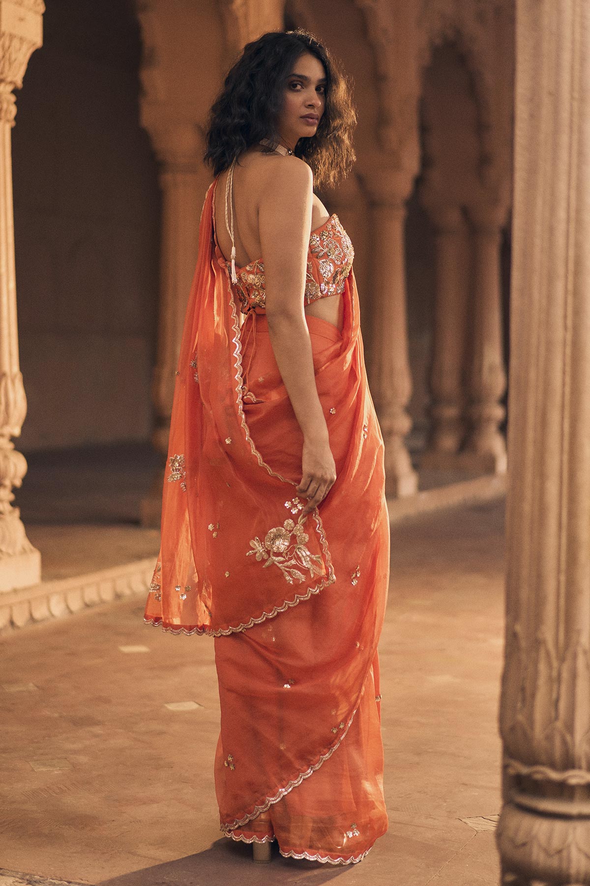 Fit: Blouse : - It has criss cross strings opening at back - Padded - Attached lining - Fitted at bust Saree : No can can Side zip opening Fitted at waist Attached lining