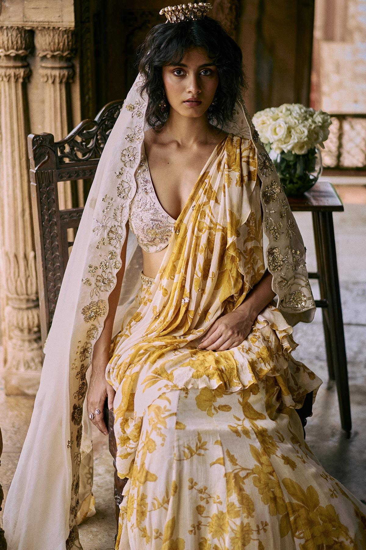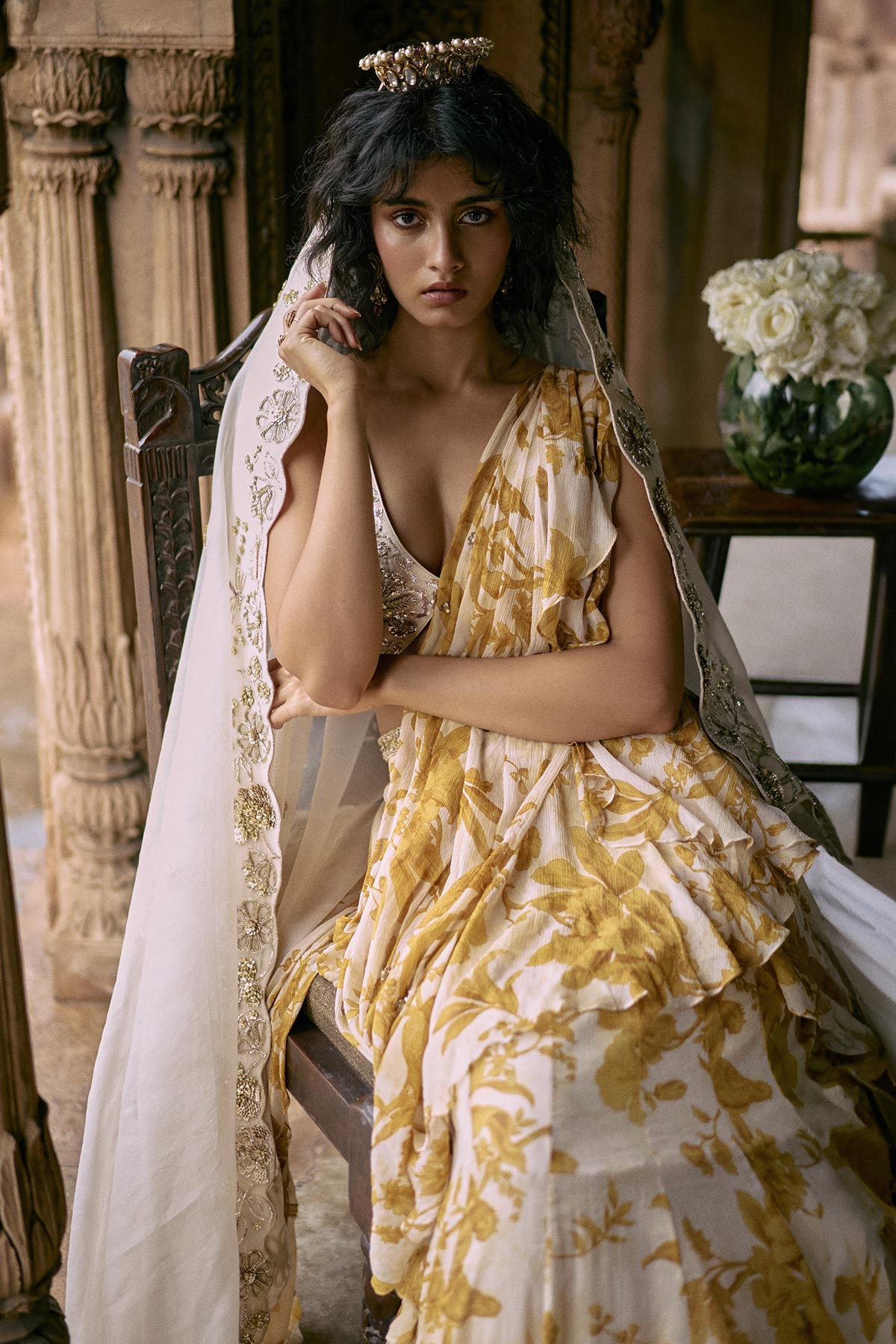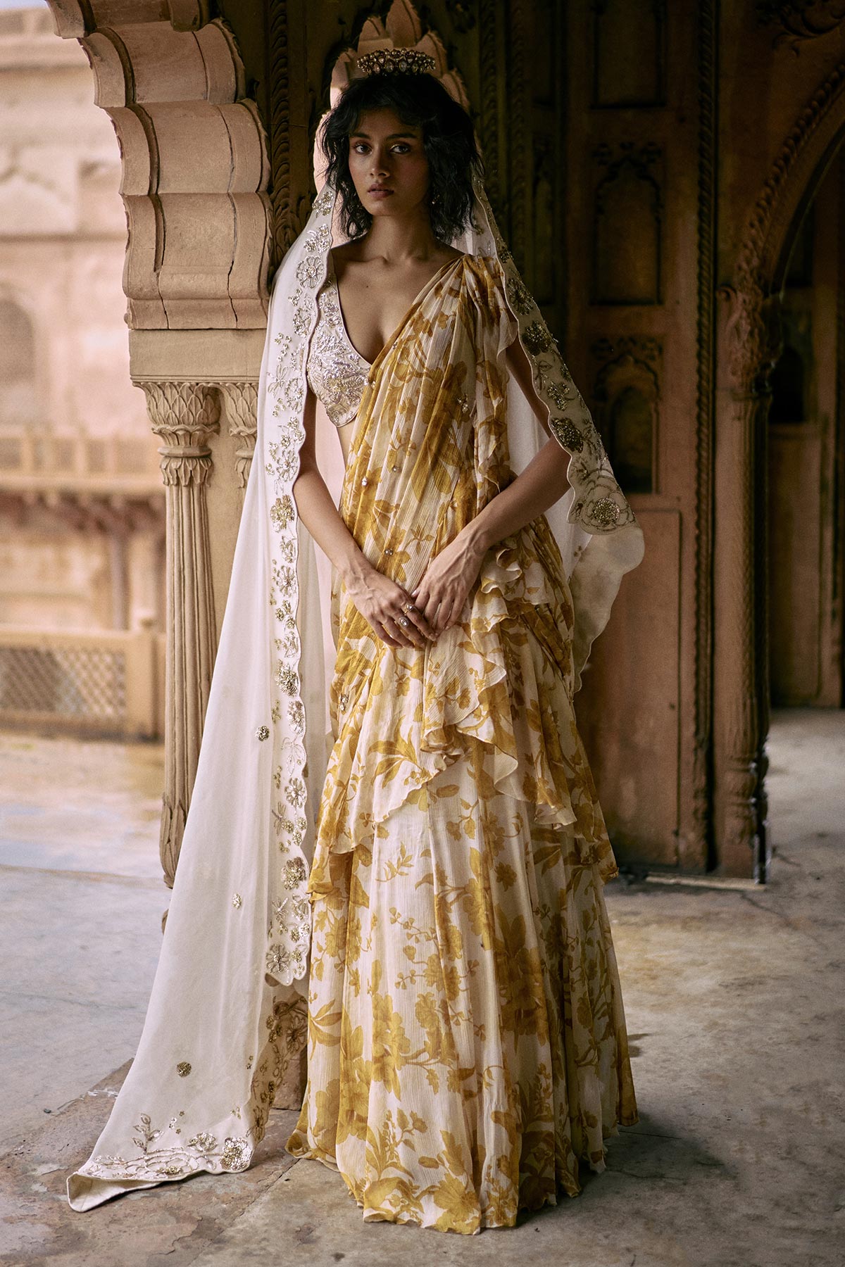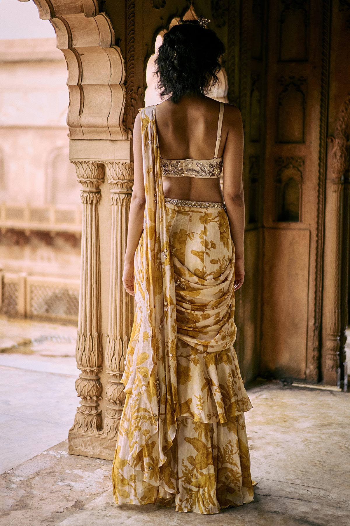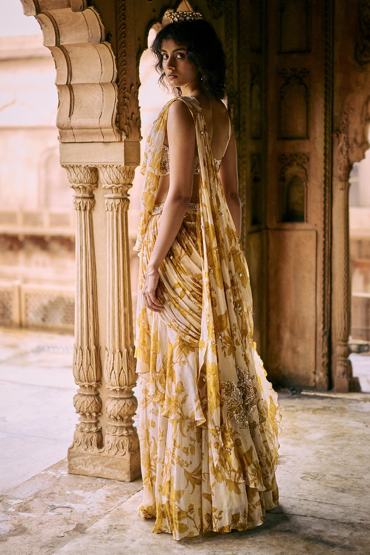 Fabric: Blouse : chiniya [dyed] Saree : Banglori chiffon [print] Belt : chiniya [dyed] Dupatta : Banarasi organza [dyed] Lining : Santoon [dyed] Satin : dyed