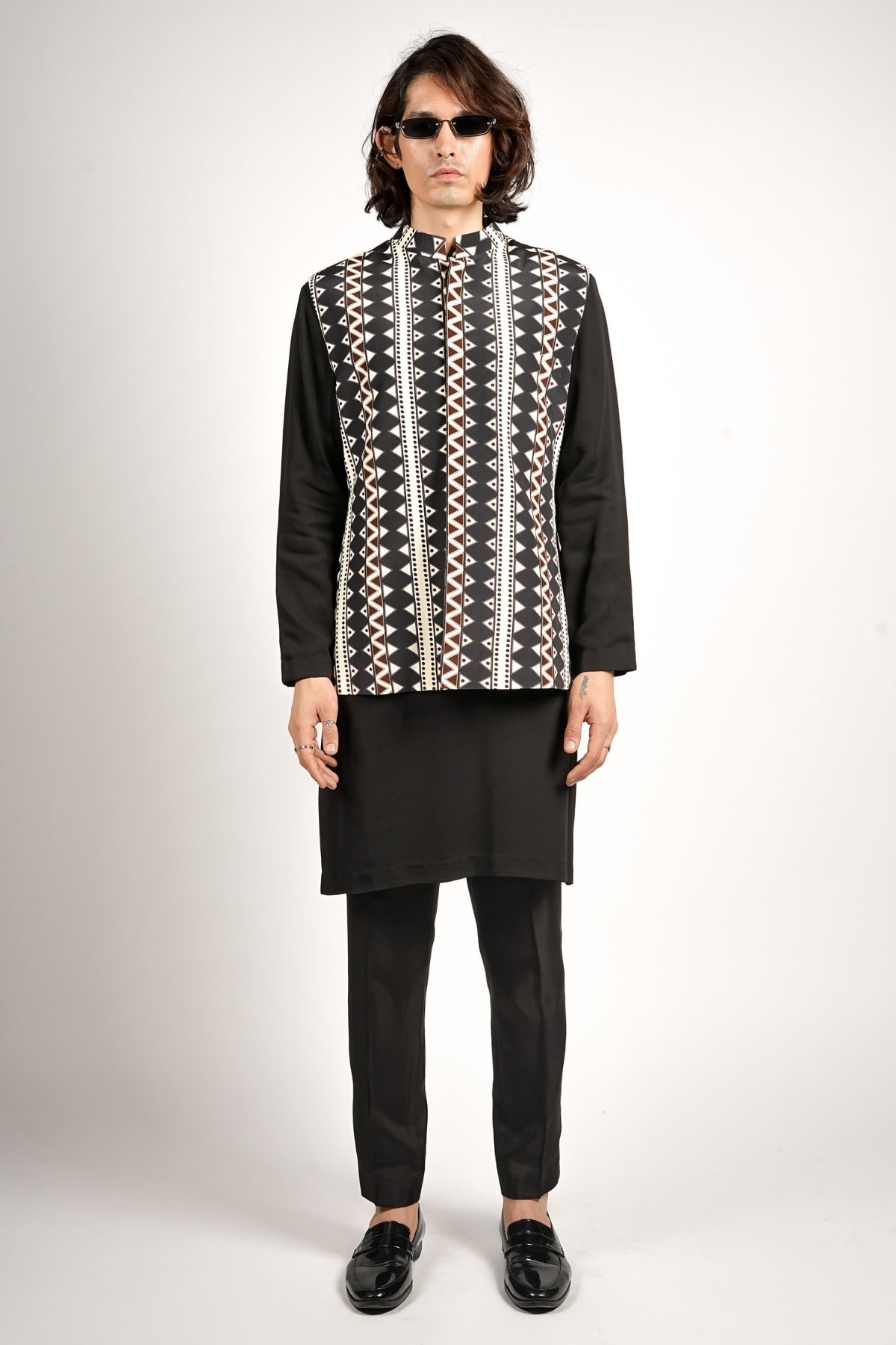 Black bundi featuring bold geometric tribal print, arranged vertically to create a striking elongating effect. Paired with black kurta and pants.