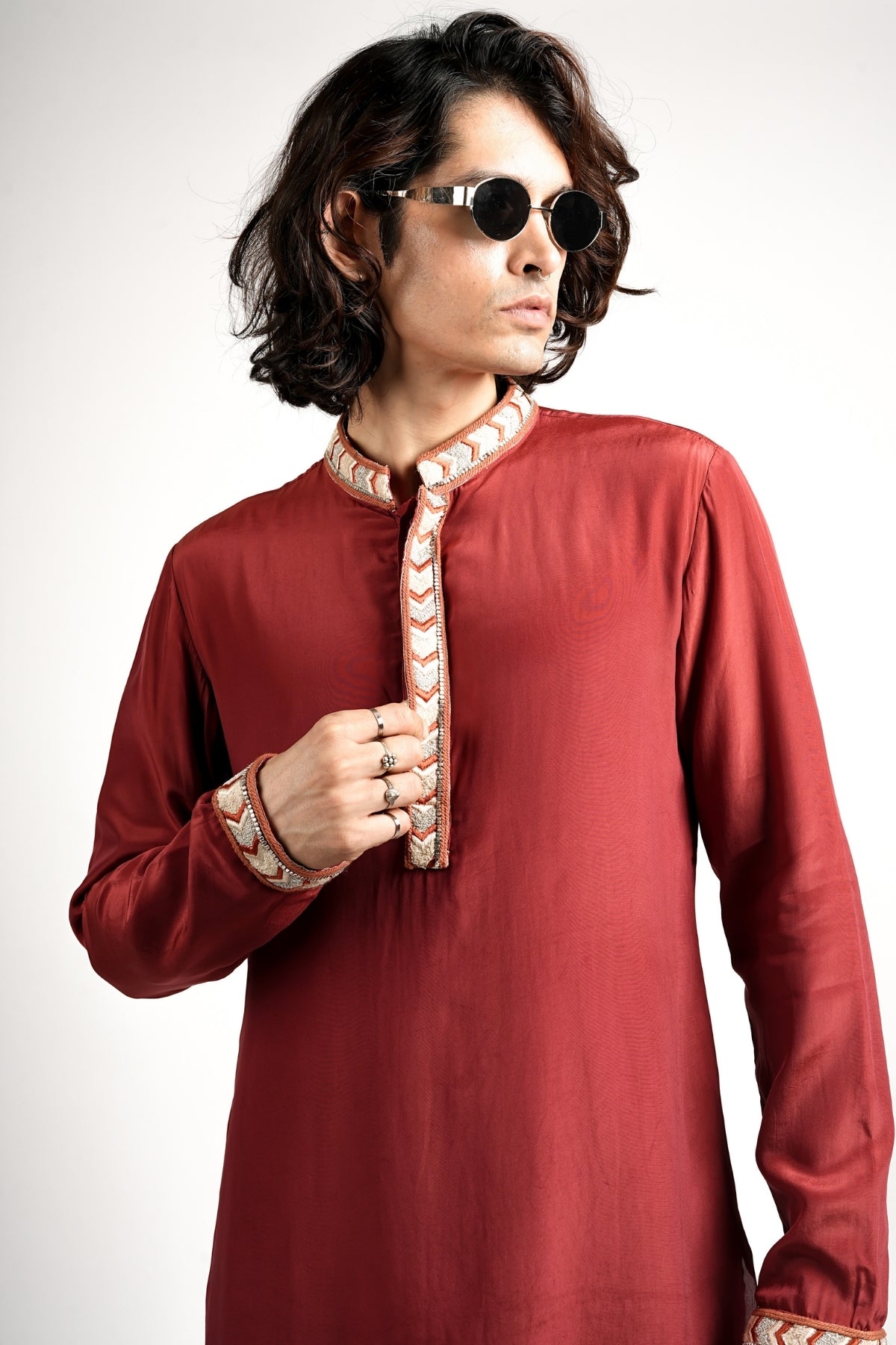 This is a comfortable yet festive set featuring a long-sleeved kurta in a maroon fabric. The kurta is detailed with cream and gold embroidery on the band collar and cuffs. It is traditionally paired with voluminous, pleated ivory Patiala pants, offering a classic, relaxed, and eye-catching look for daytime celebrations.