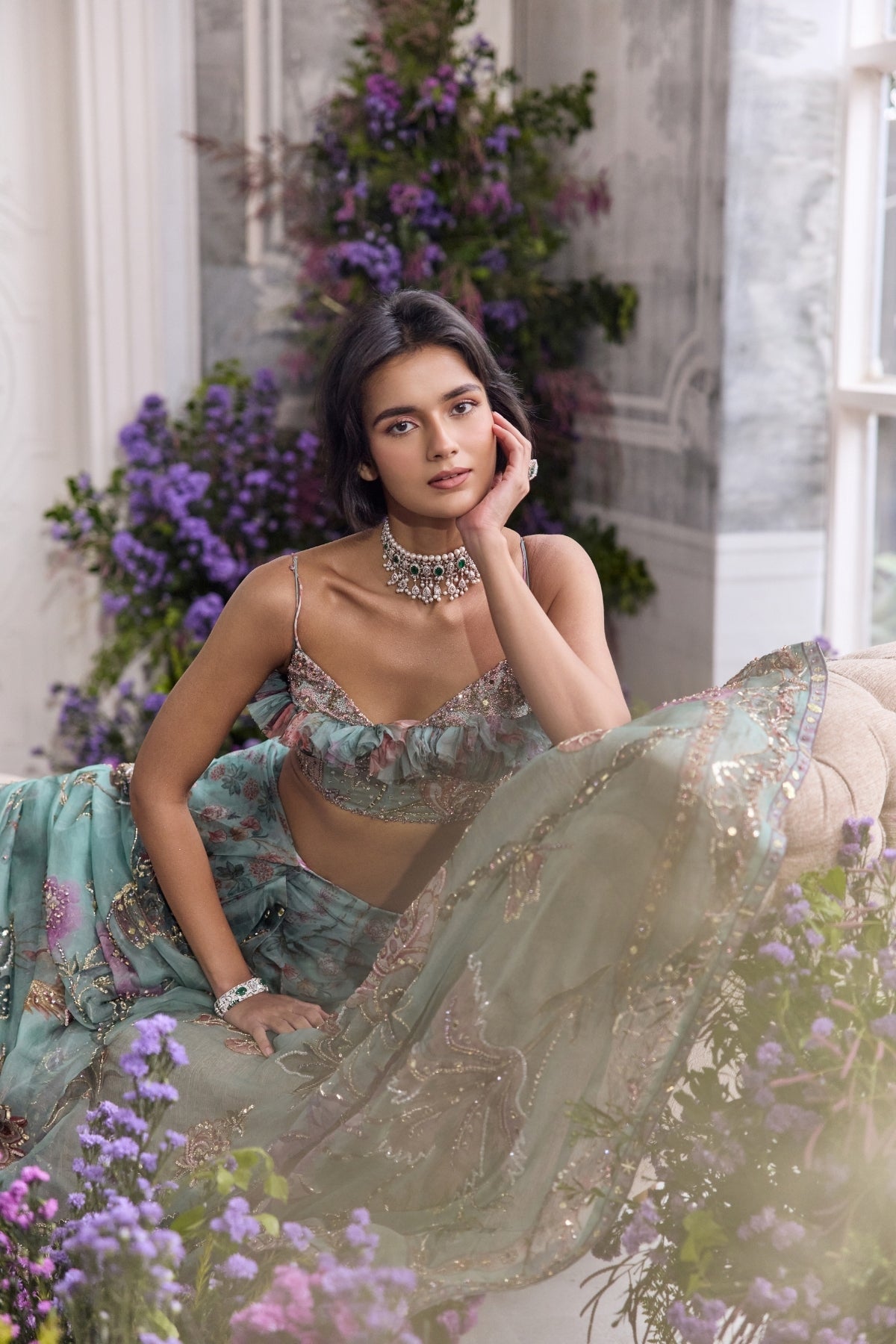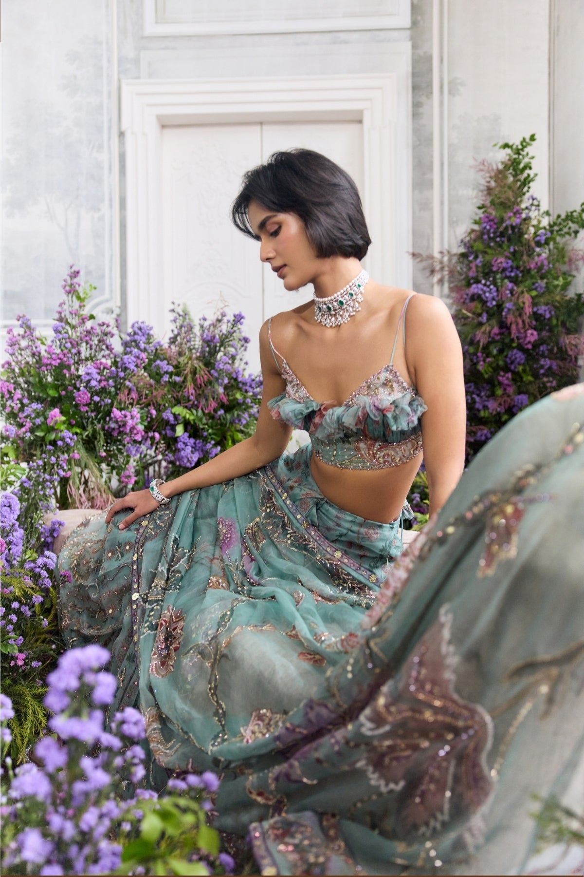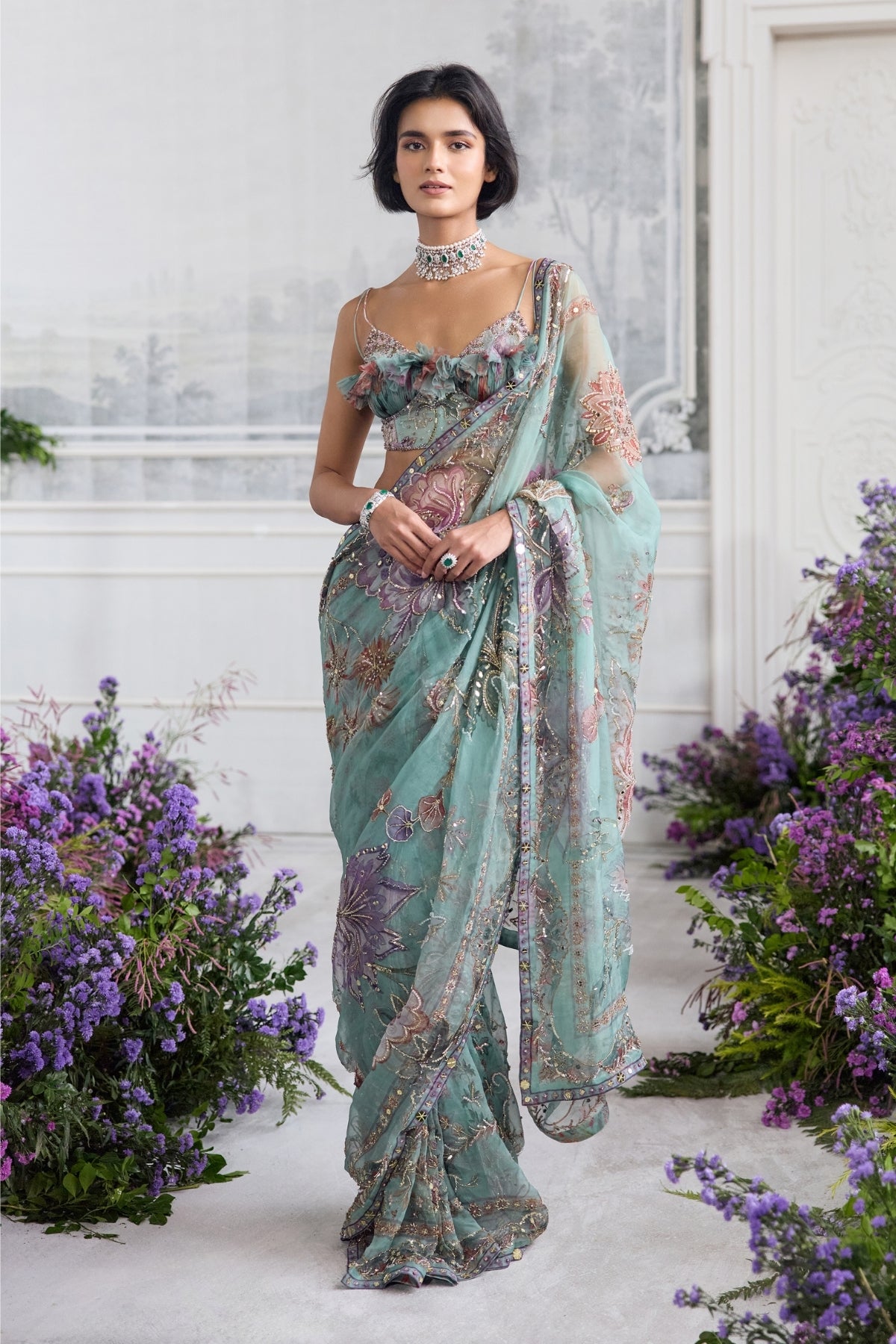 Hand Embroidered Ruffled Strappy Blouse Paired With Embroidered Pre-draped Saree