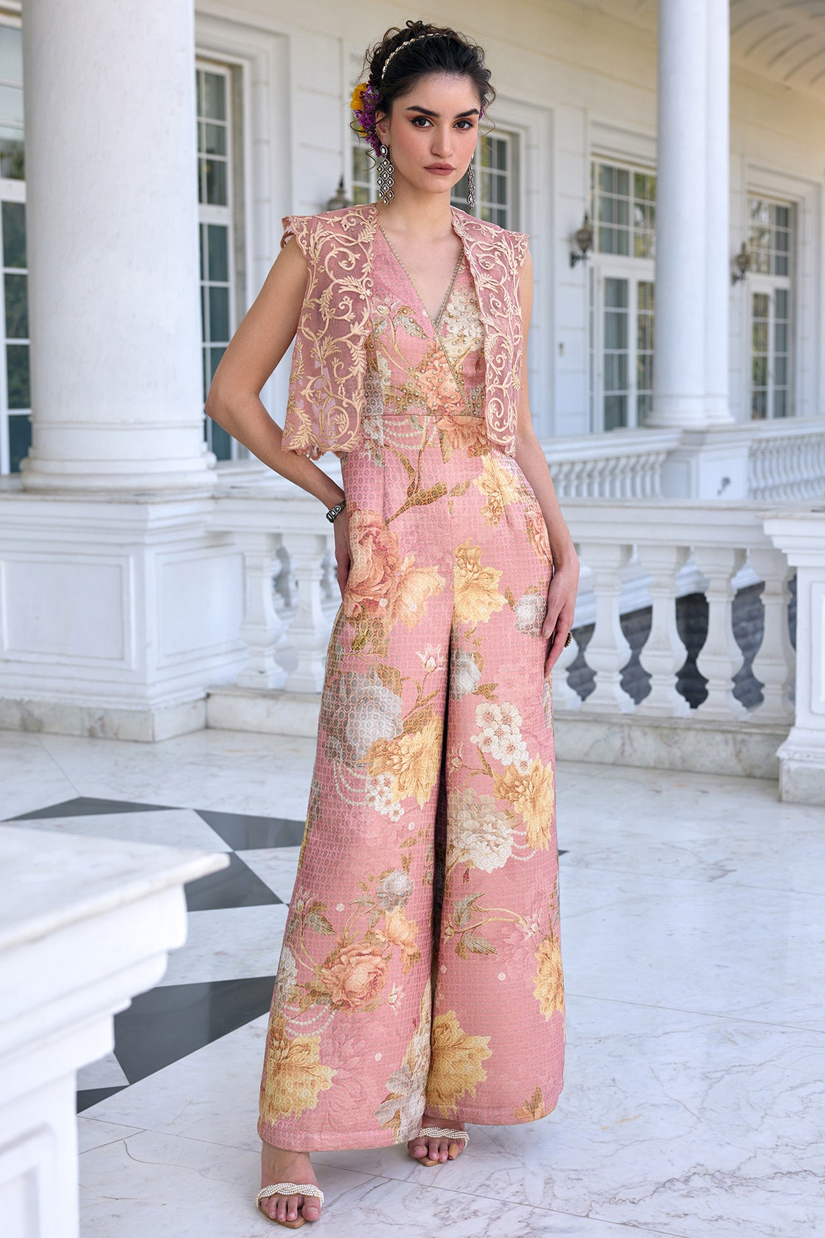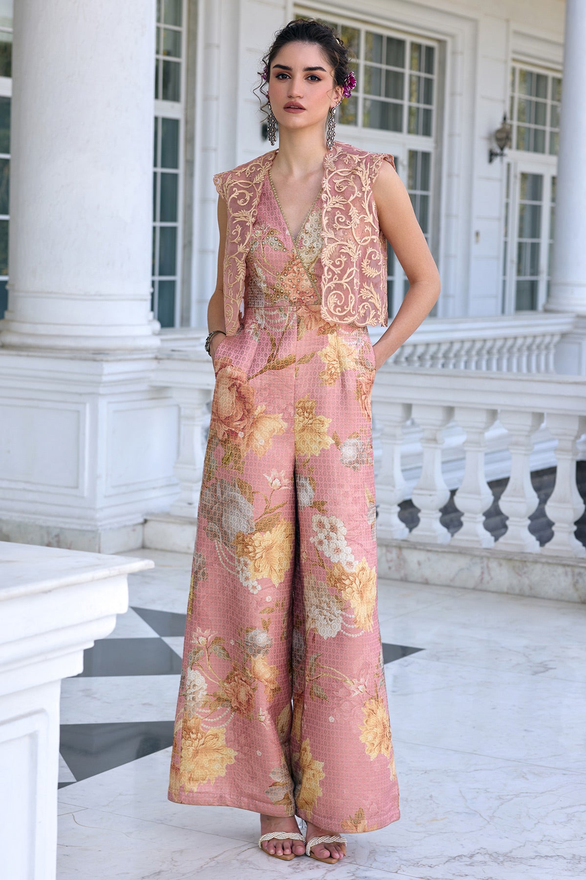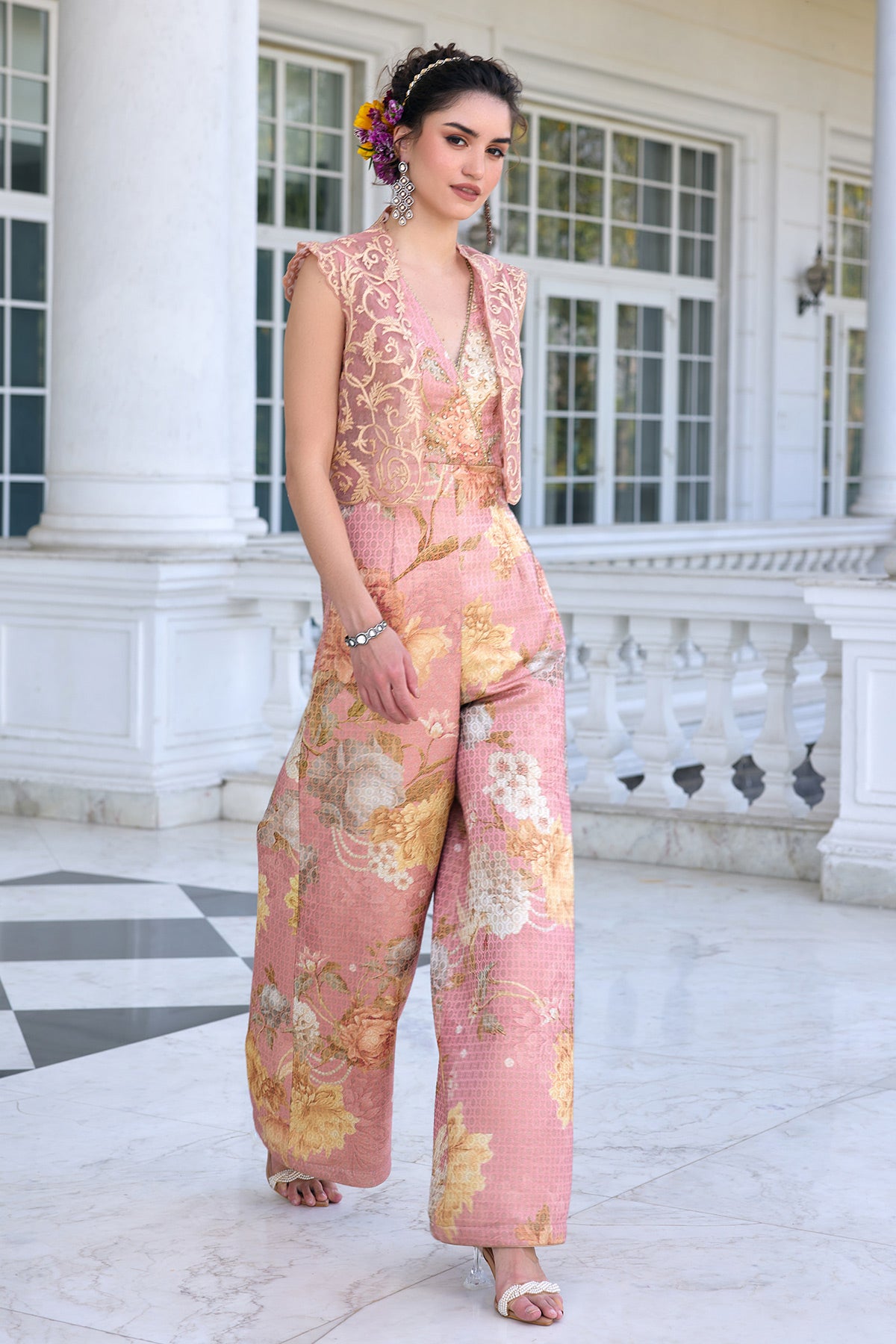 Step Into Sophistication With Alysa Brocade Jumpsuit, Complemented By Short Jacket .The Soft Intricate Detailing Of Embroidery On Jacket And Yoke To Flaunt Modern Allure And Charm.Perfect For Uber Chic Party Look.