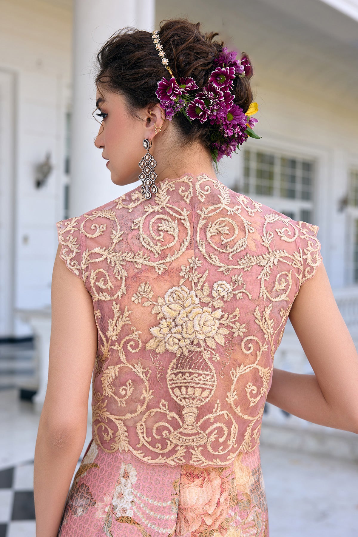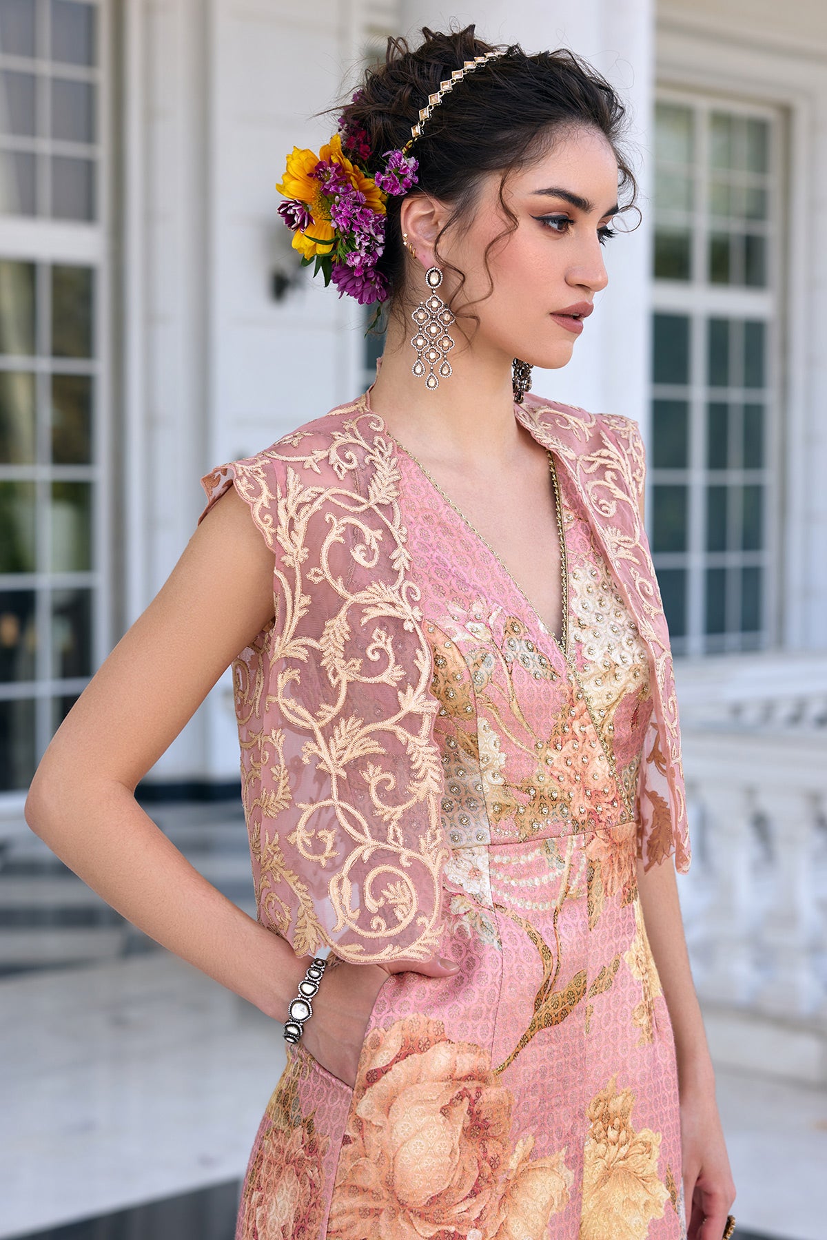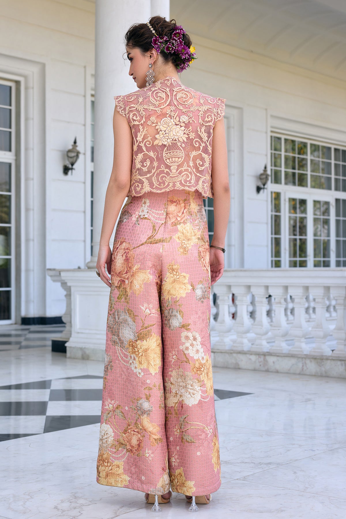 Step Into Sophistication With Alysa Brocade Jumpsuit, Complemented By Short Jacket .The Soft Intricate Detailing Of Embroidery On Jacket And Yoke To Flaunt Modern Allure And Charm.Perfect For Uber Chic Party Look.