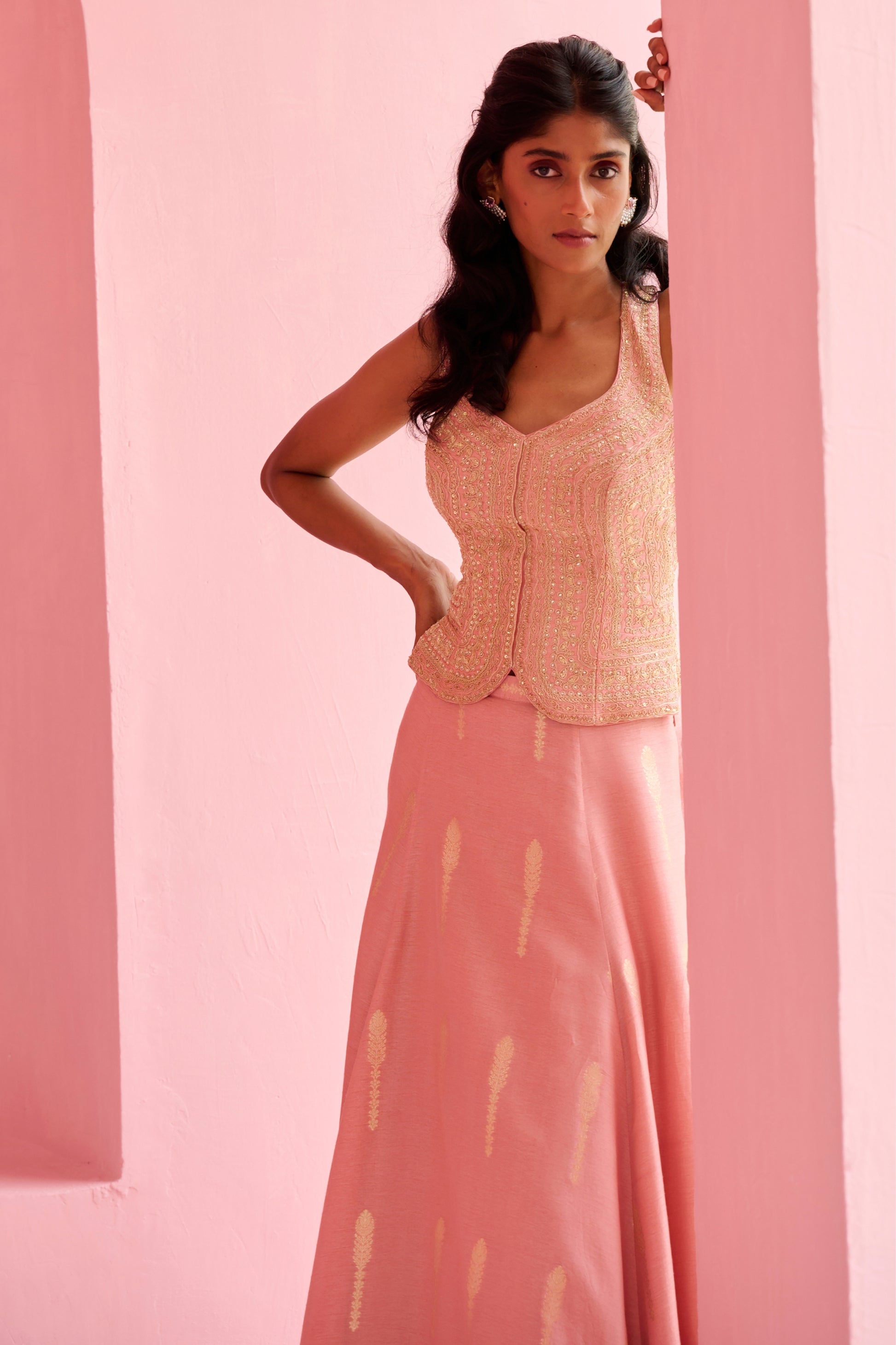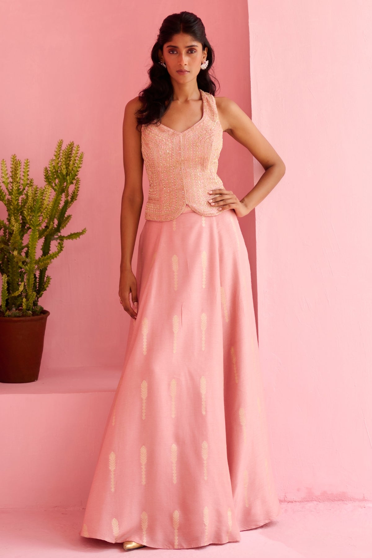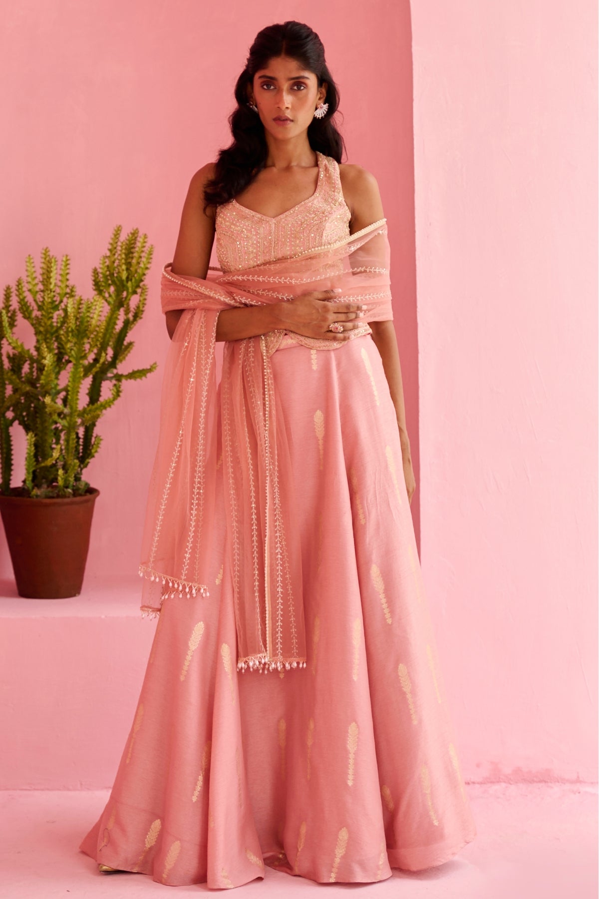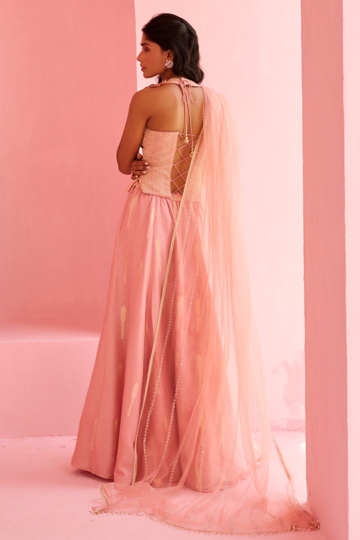 Jamewar Lehenga with woven buttis paired with zari, sequence and zardozi embroidered halter neck blouse and embellished tulle dupatta