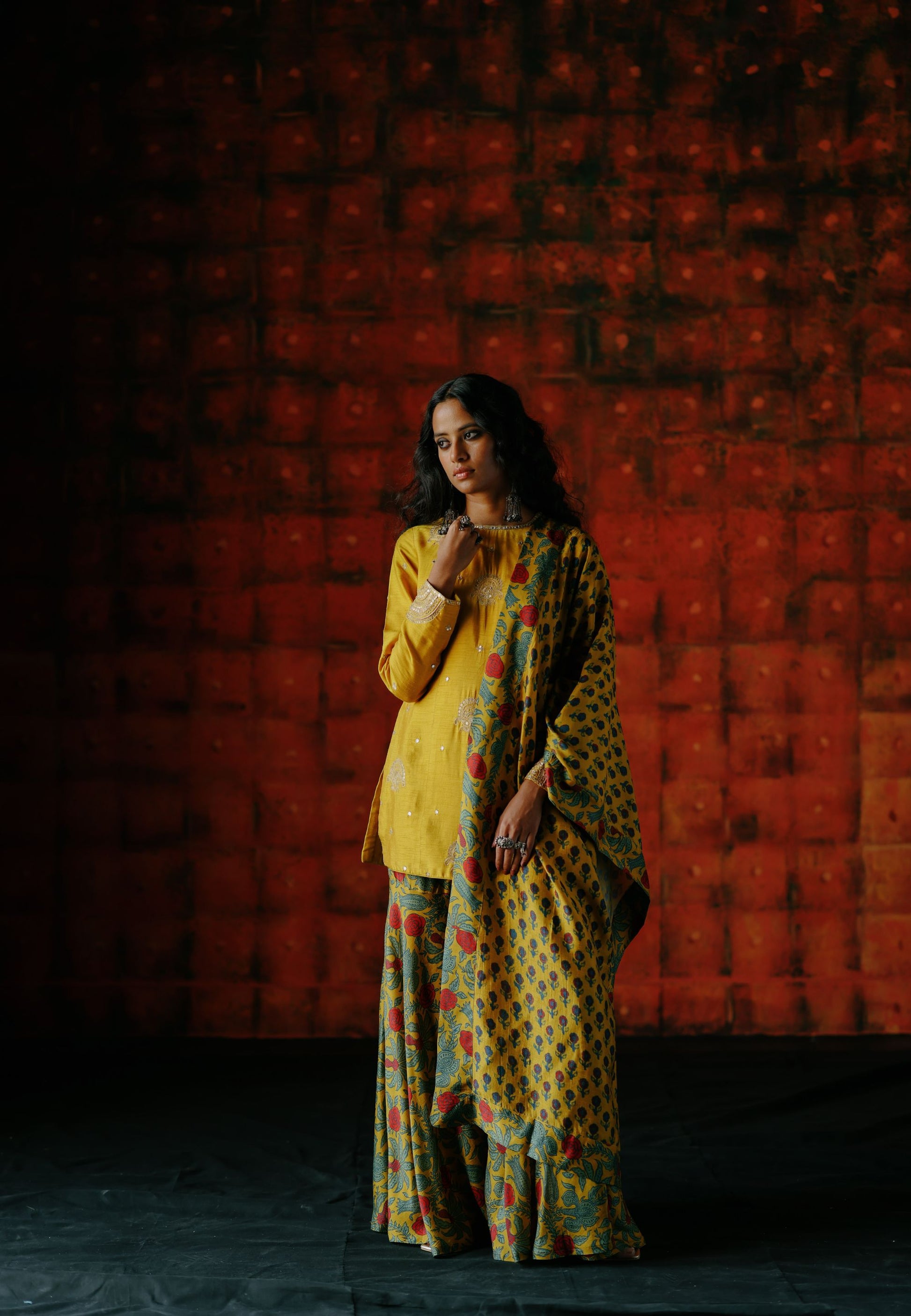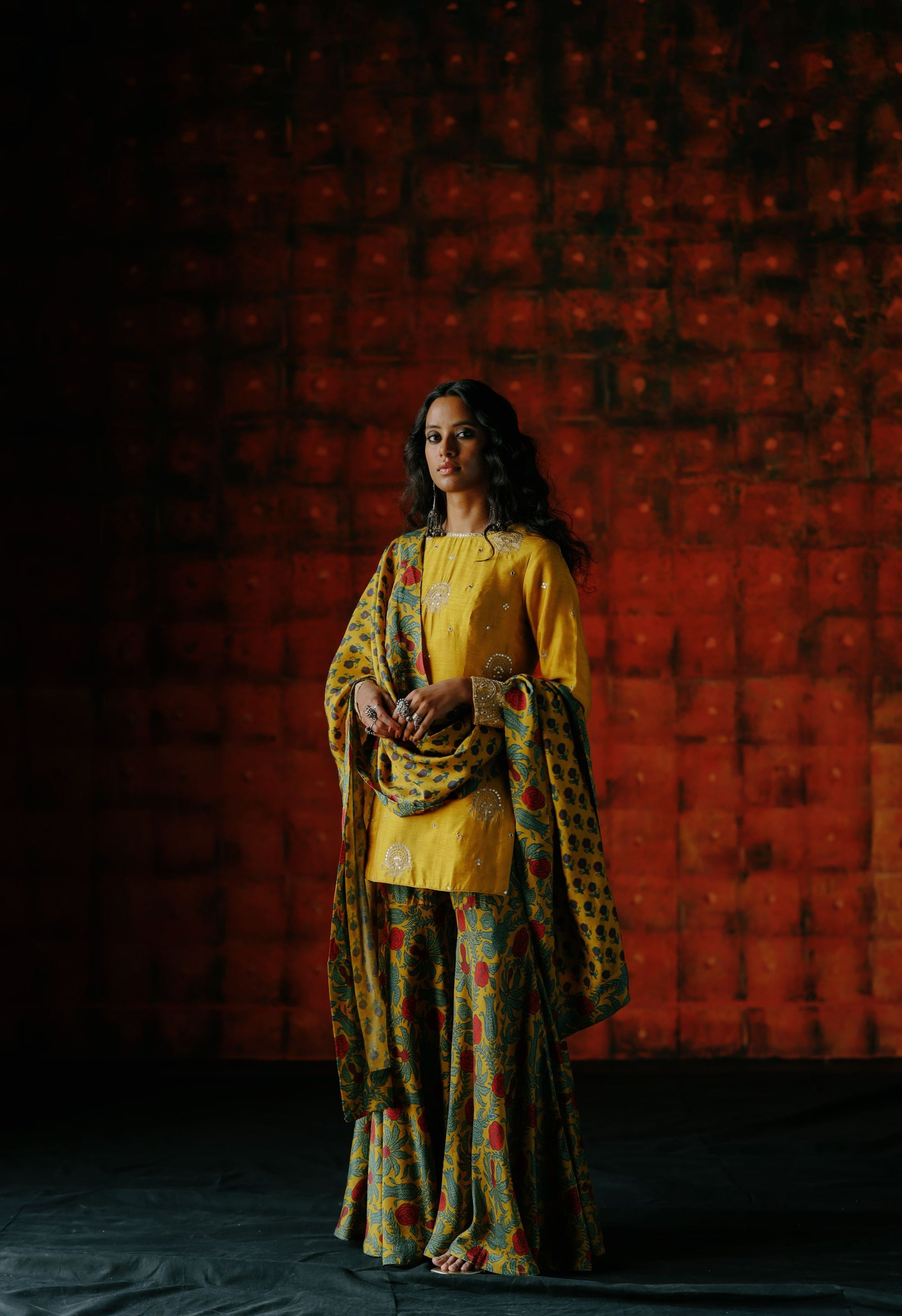 Featuring an amber embroidered tunic paired with a printed flared pant and a complimenting mix print dupatta.