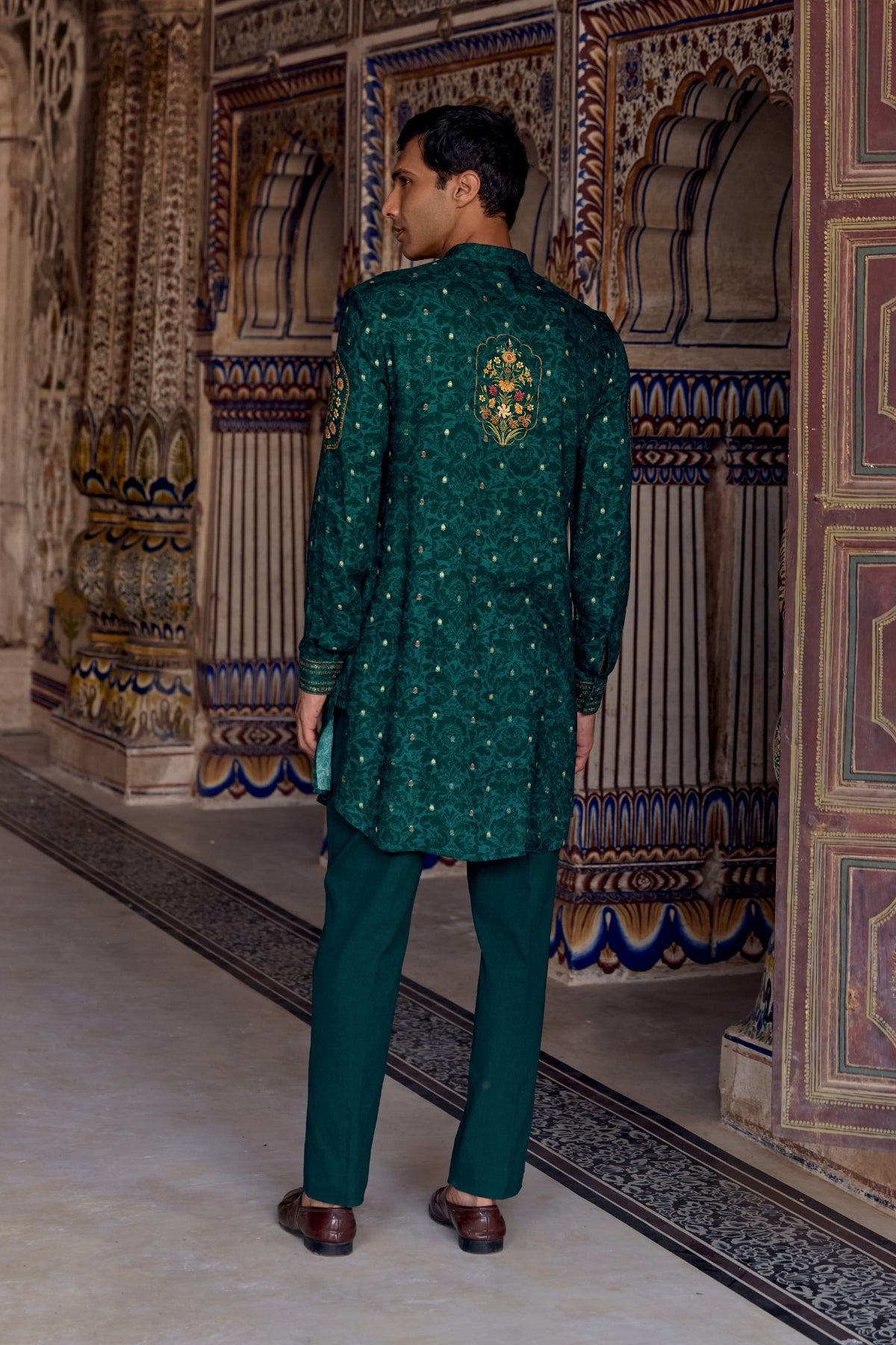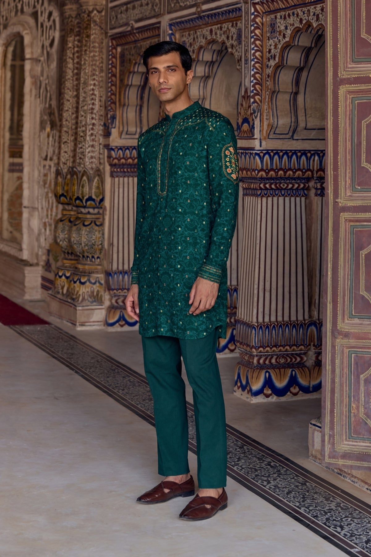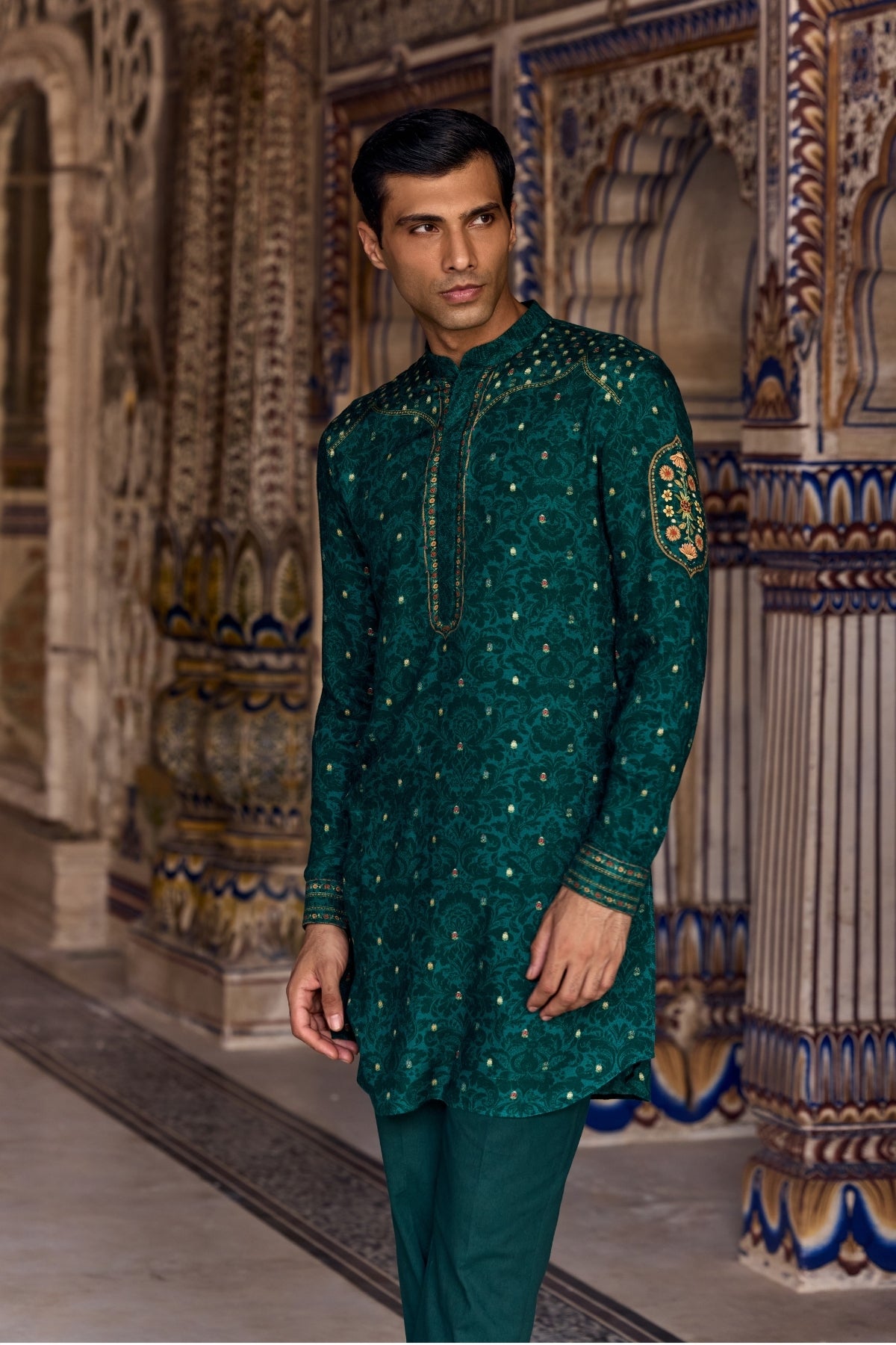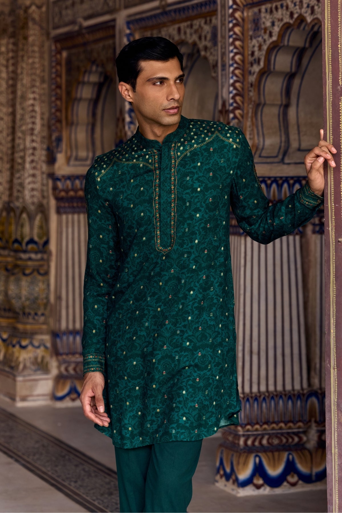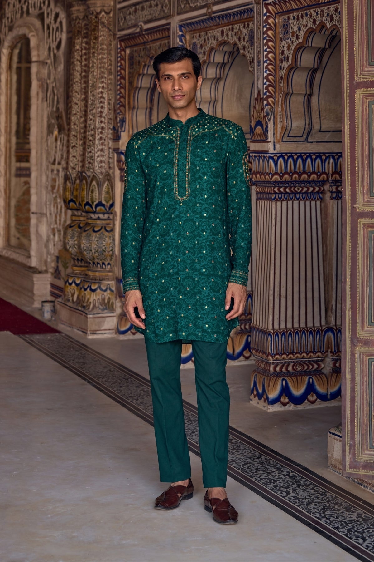 Featuring Aryan Kurta Set with Multi colour paisley mini floral motifs. Paired with same colour pants. Designed to keep you dapper and suave at occasions and festivities.