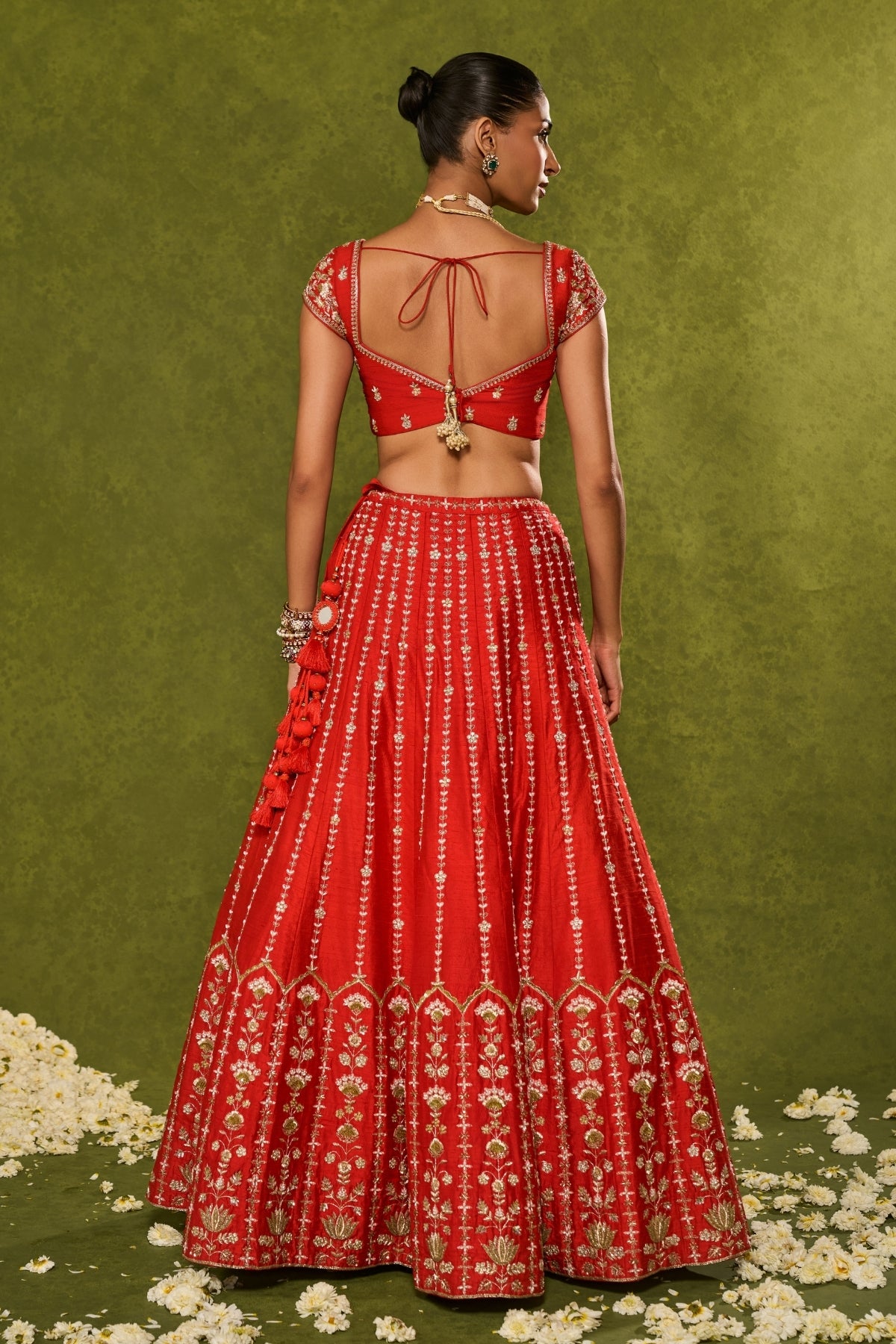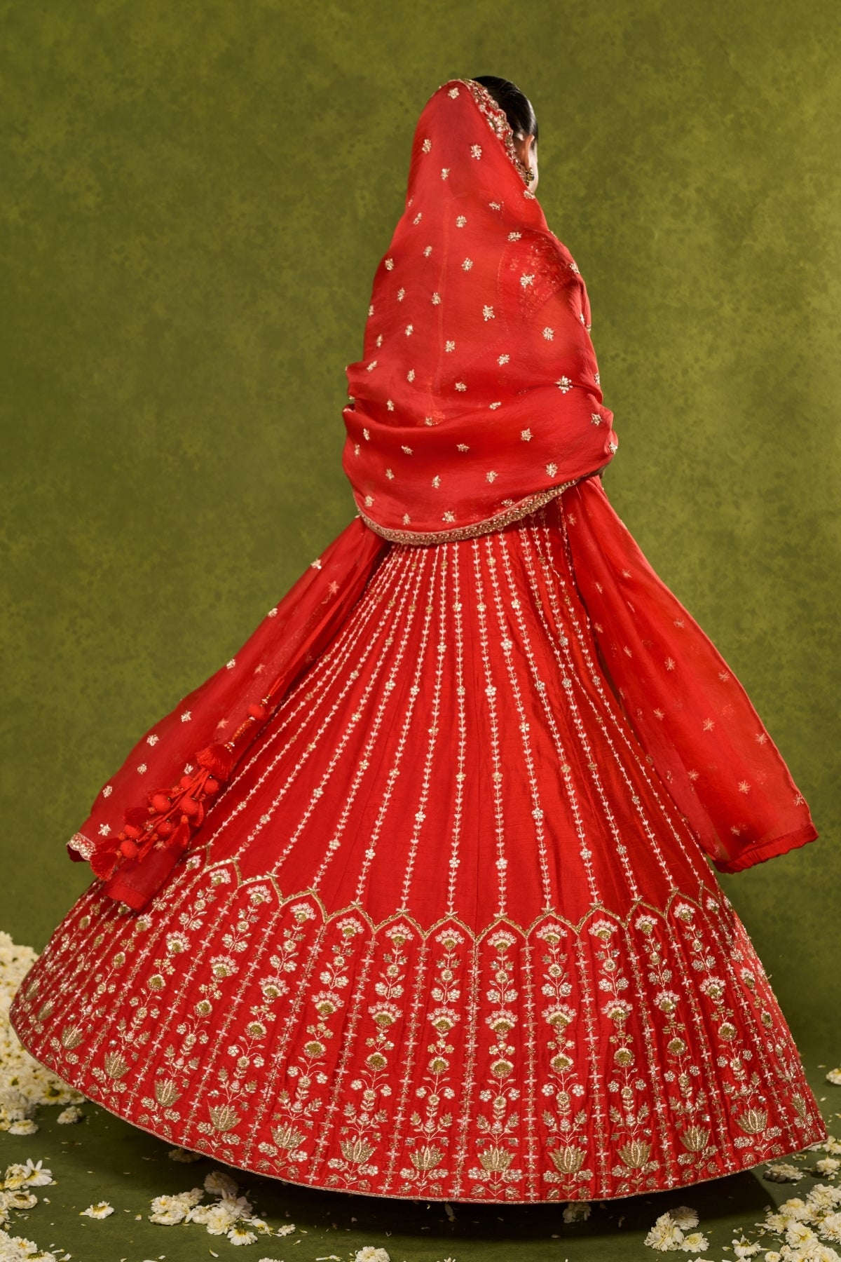 Red raw silk lehenga meticulously crafted with intricate resham, zardozi, pearl and glass beadwork paired with a zardozi-embellished floral work cap sleeve blouse and organza dupatta, with intricately embellished floral borders