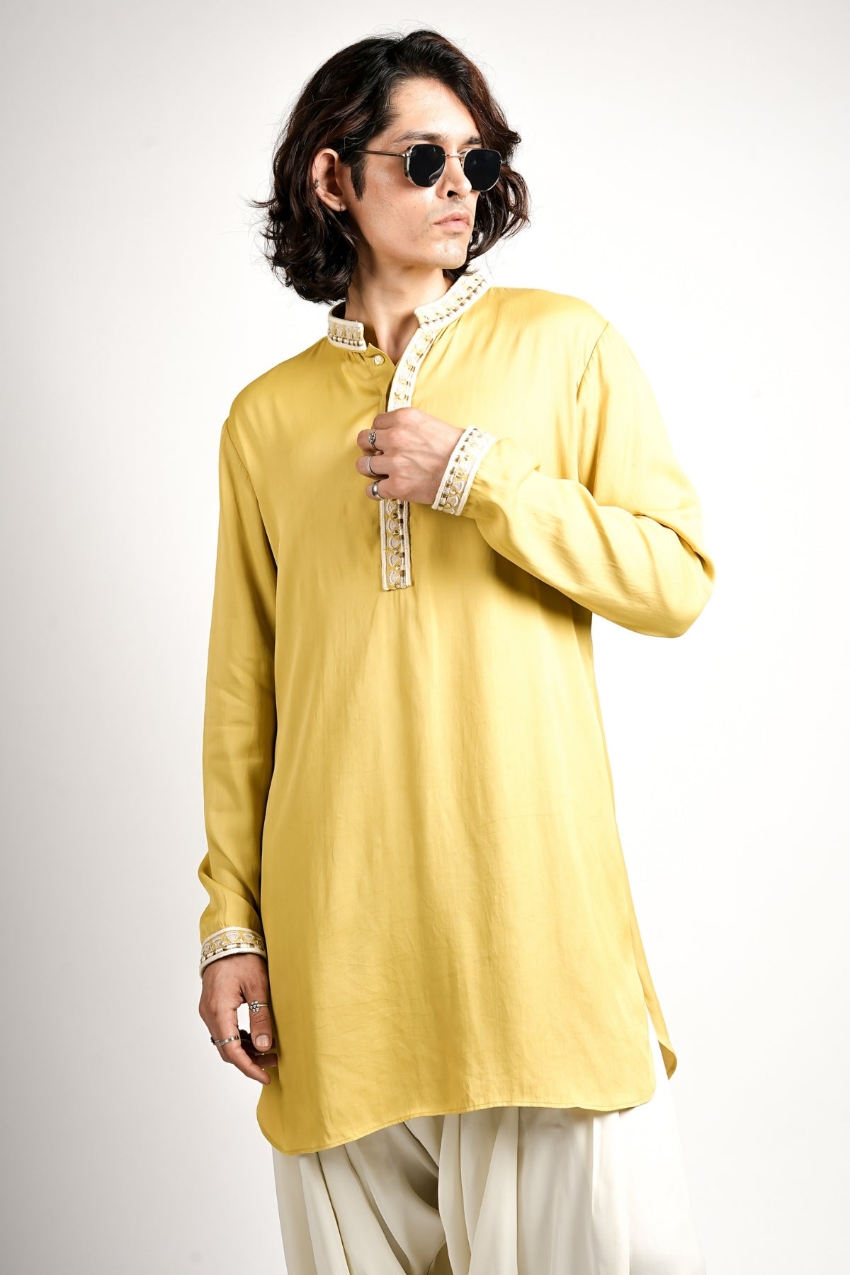This is a comfortable yet festive set featuring a long-sleeved kurta in a chartreuse fabric. The kurta is detailed with cream and gold embroidery on the band collar and cuffs. It is traditionally paired with voluminous, pleated ivory Patiala pants, offering a classic, relaxed, and eye-catching look for daytime celebrations.