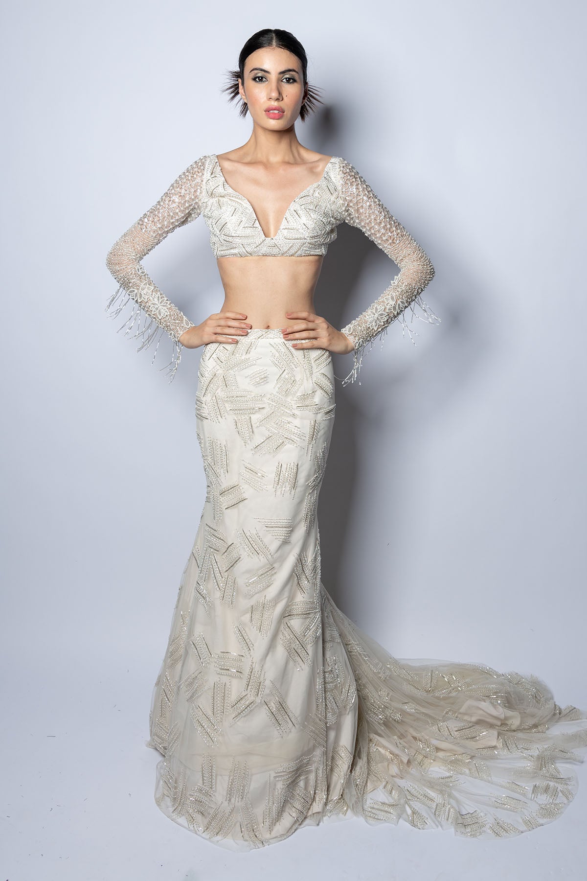 Ivory, crystal abstract cascading mermaid lehenga with an extended trail, styled with sheer full-sleeves, crystal tassels detail blouse