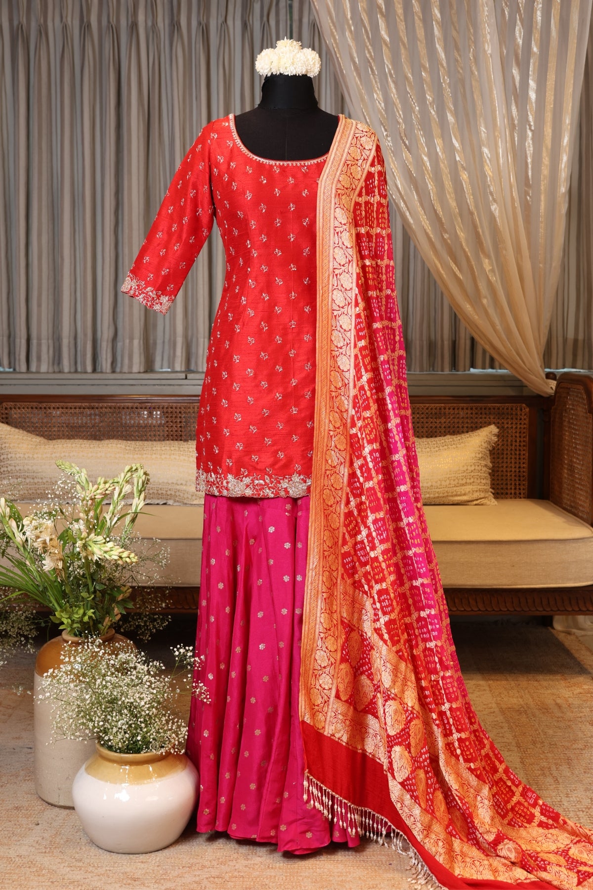 Red zardozi and glassbeads embroidered scoop neck kurta paired with jamewar sharara and complimenting bandhani dupatta