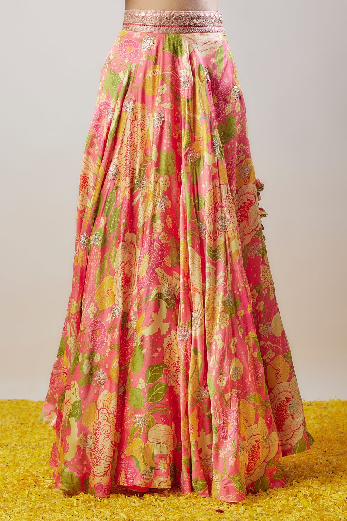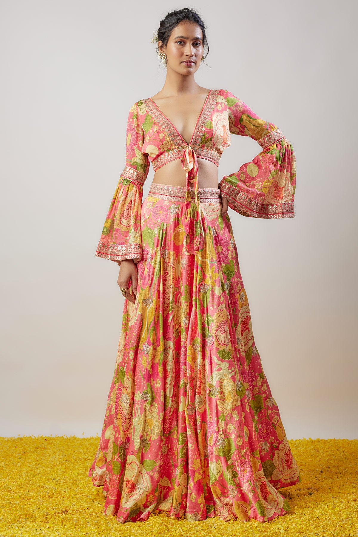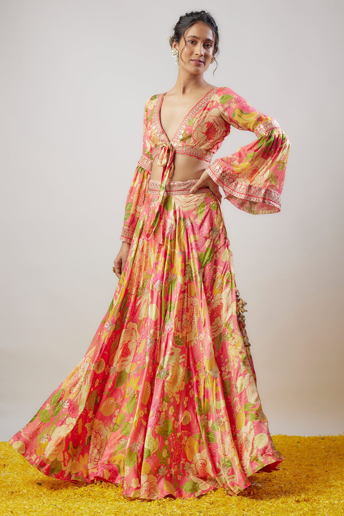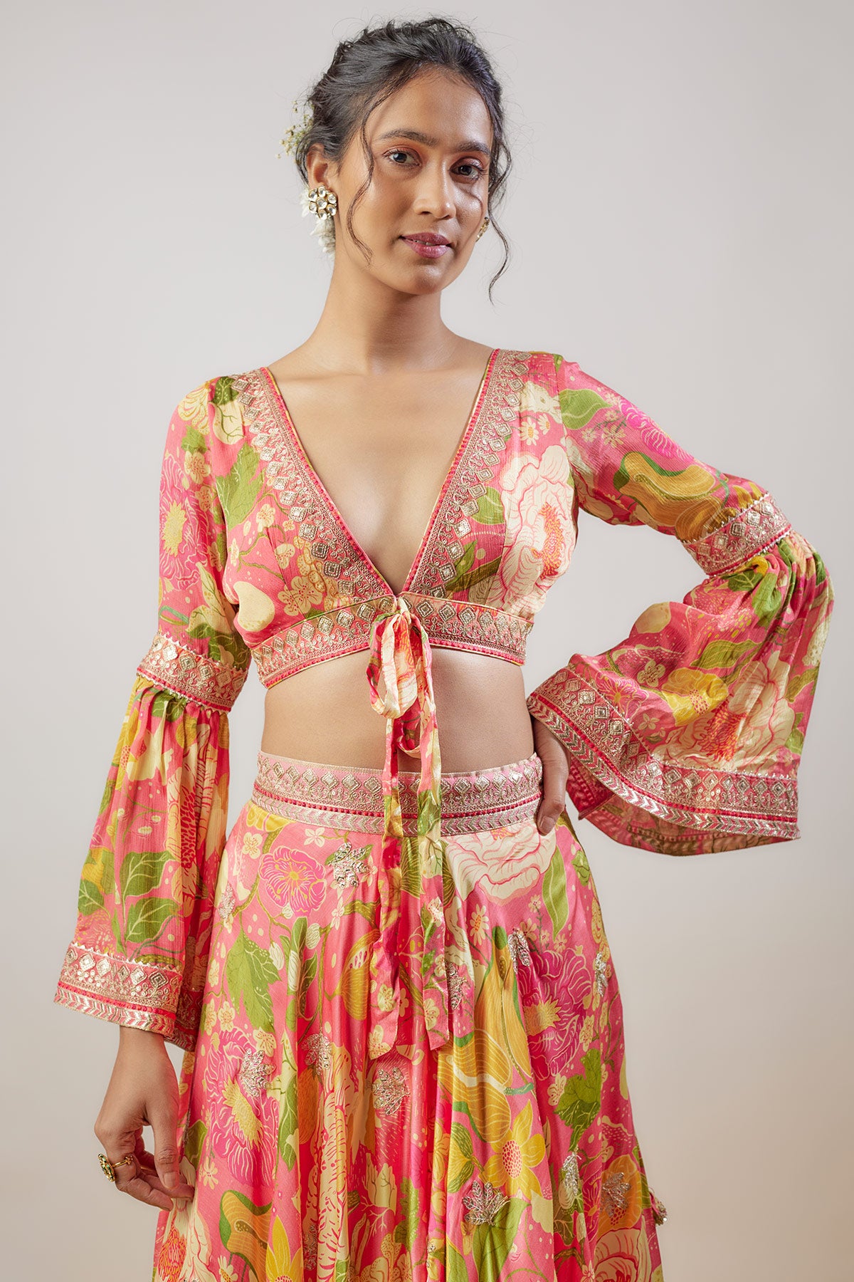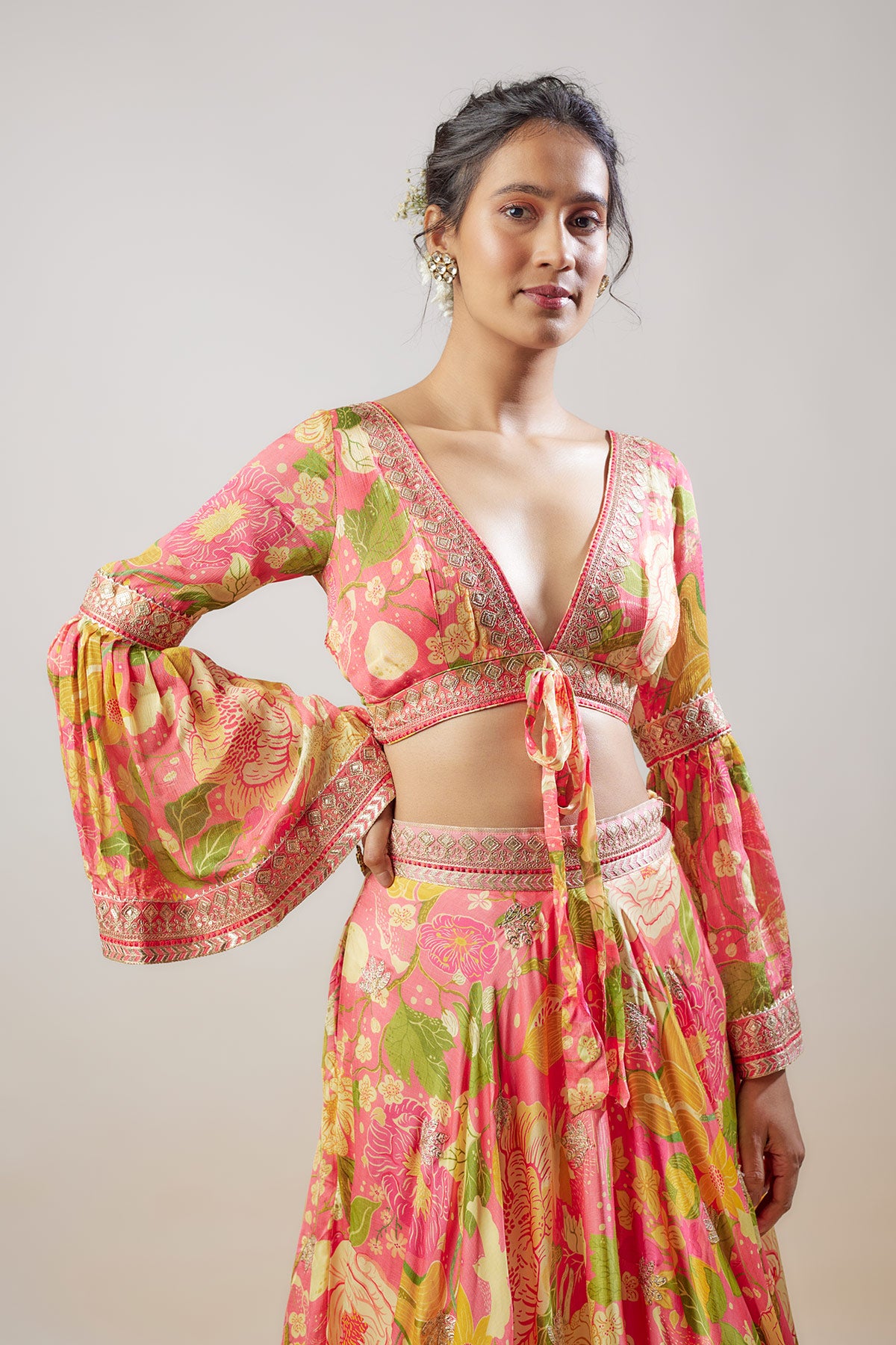 This floral-printed V-neck blouse features a delicate front tie-up, paired with a voluminous Victorian skirt for a perfect blend of romance and elegance. A timeless outfit ideal for making a graceful statement at special occasions.