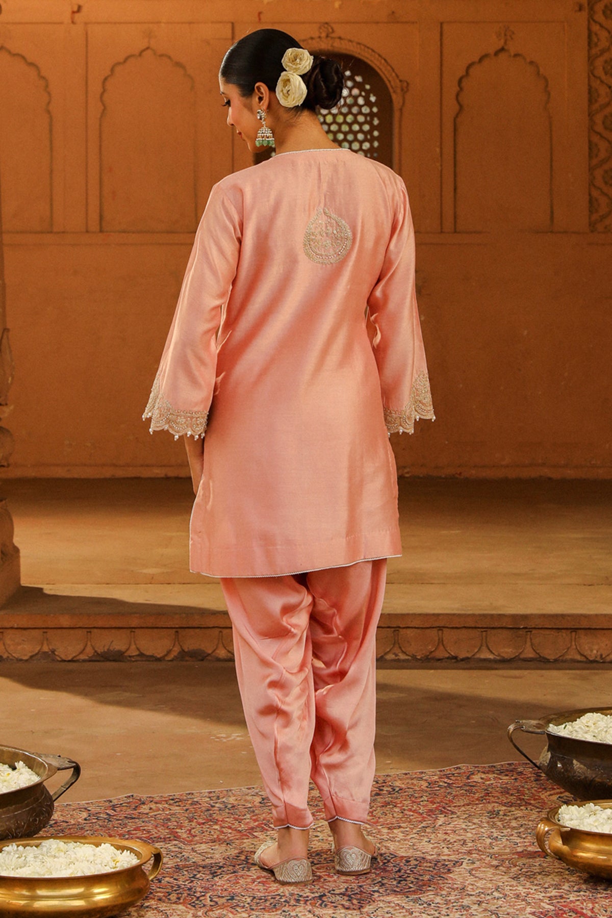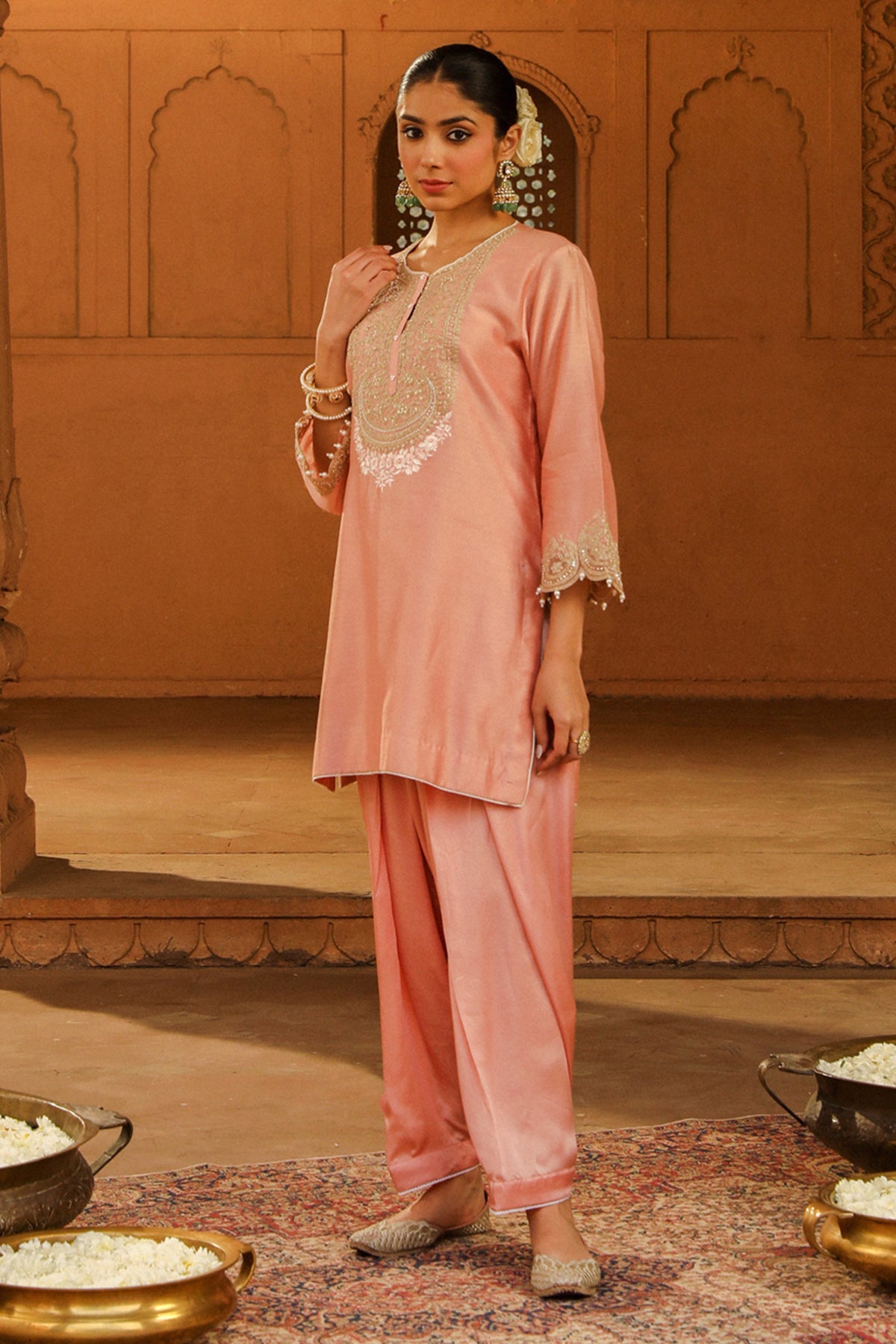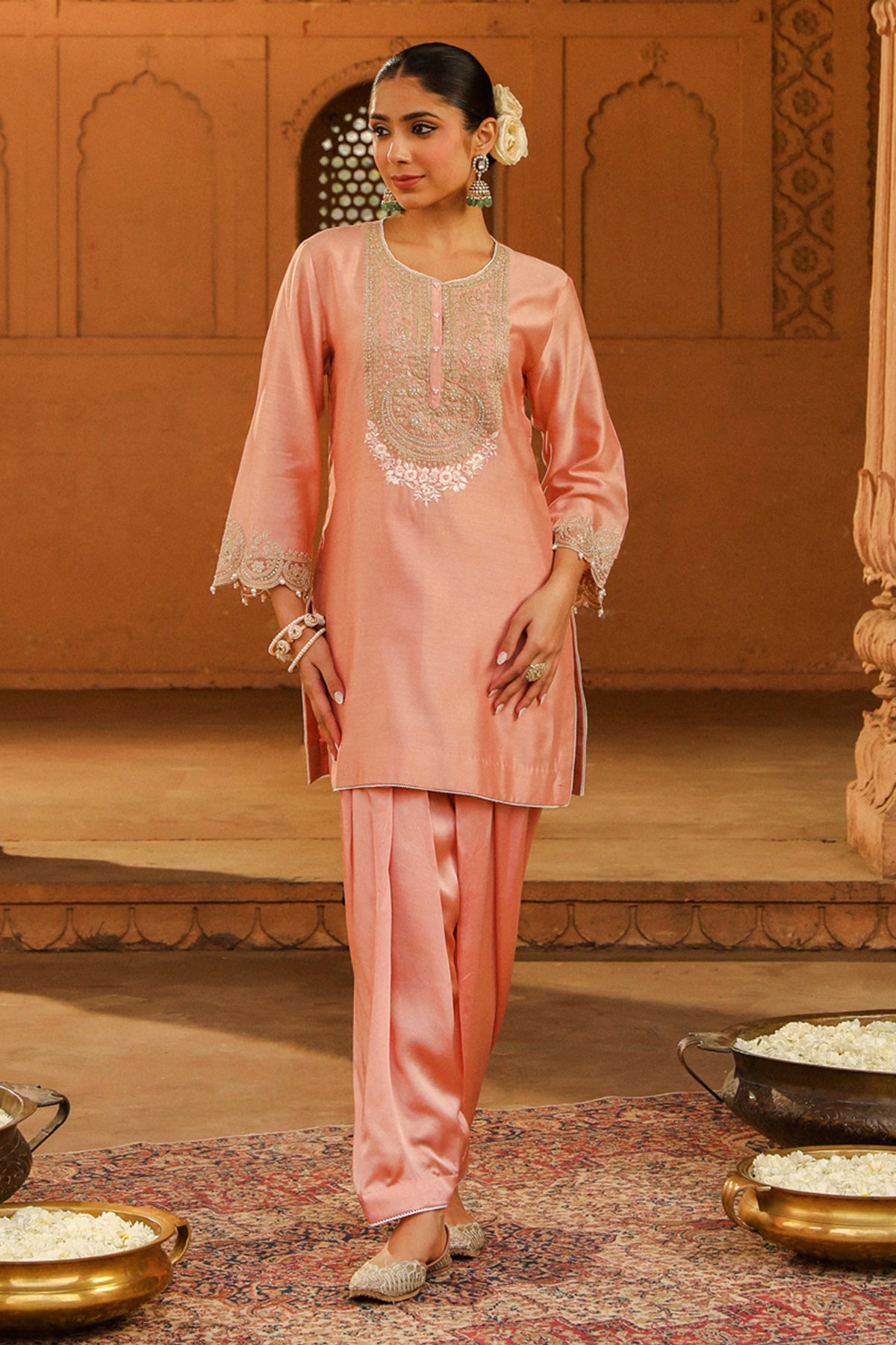 The Arisa short kurta with salwar from our Mehnoor Collection is made in silk chanderi with a Dogri salwar. The kurta is having a zero neck with placket and three-quarter bell sleeves. The kurta is adorned with Kashmiri tilla and parsi gara embroidery highlighted with basra moti. The sleeves of the kurta is a having an organza detailing. The outfit is finished with scallop detailing.