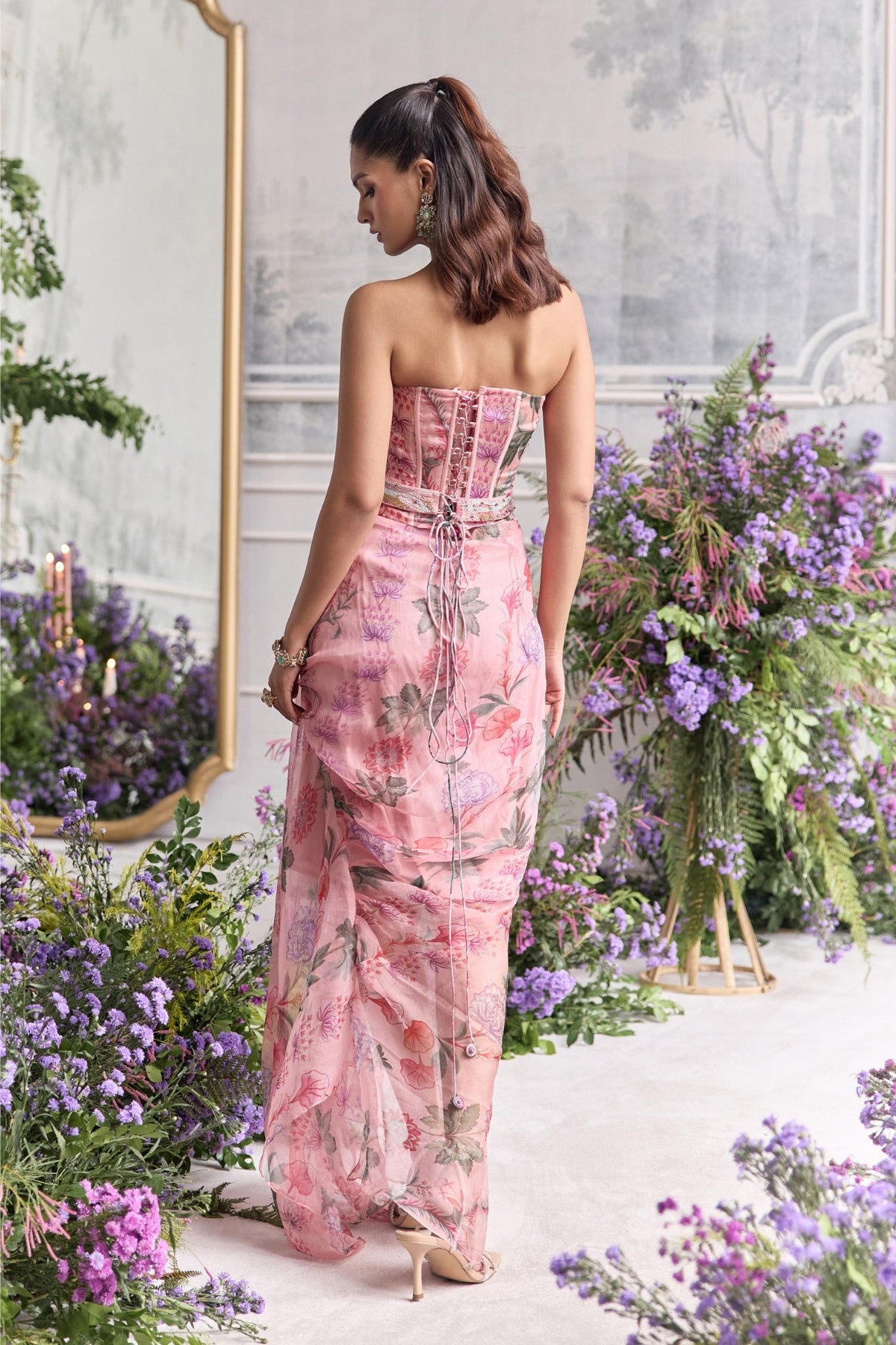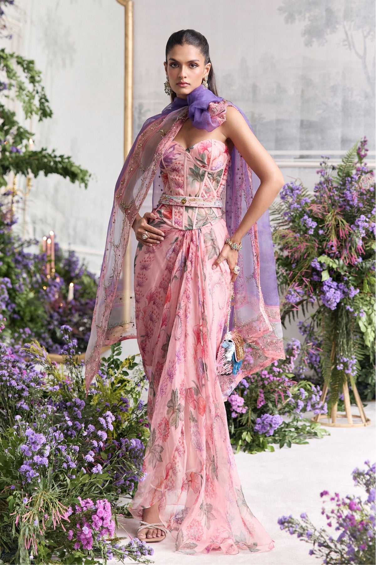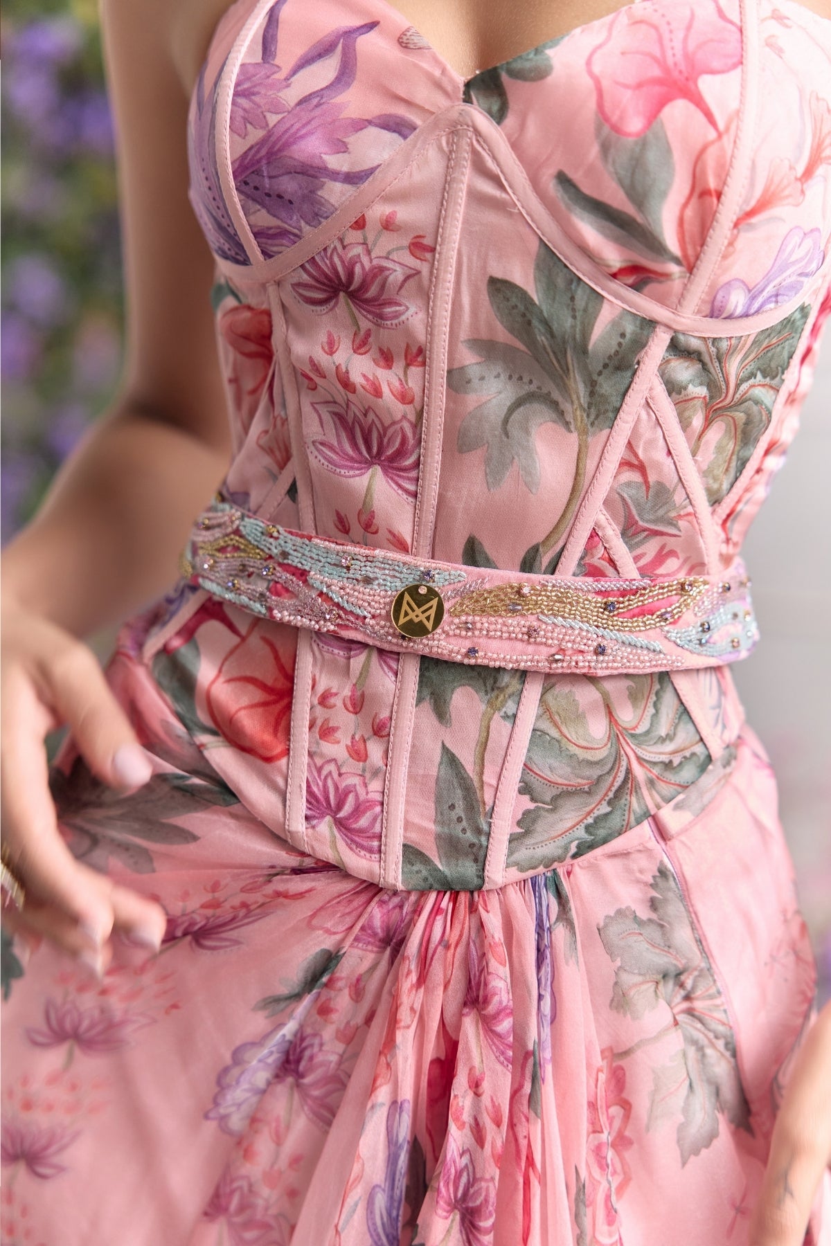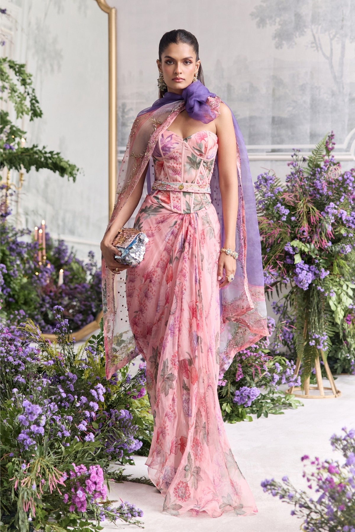 Panelled Corset With Draped Skirt Paired With Dupatta And Belt