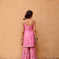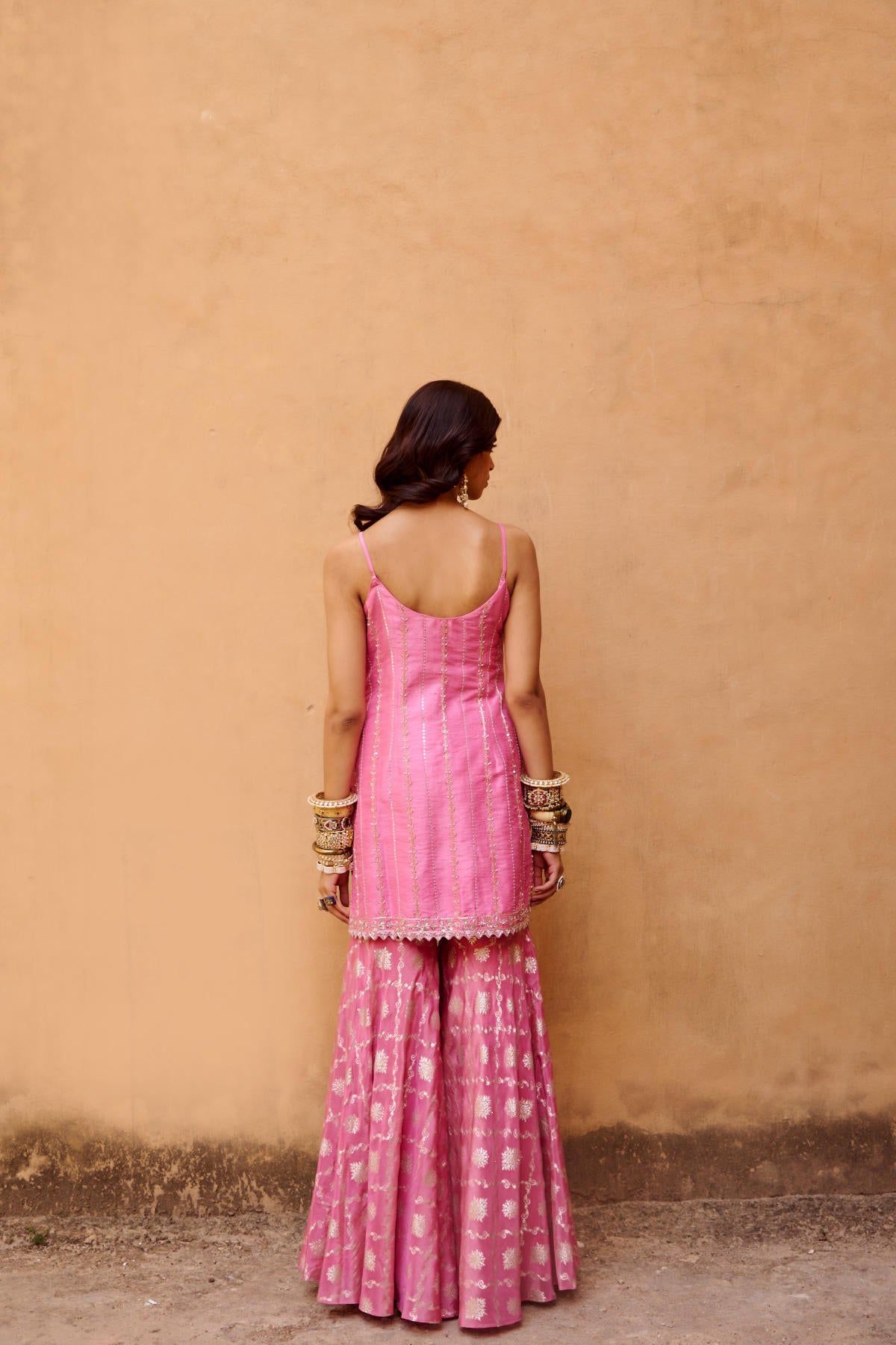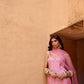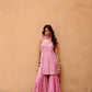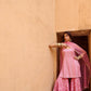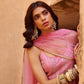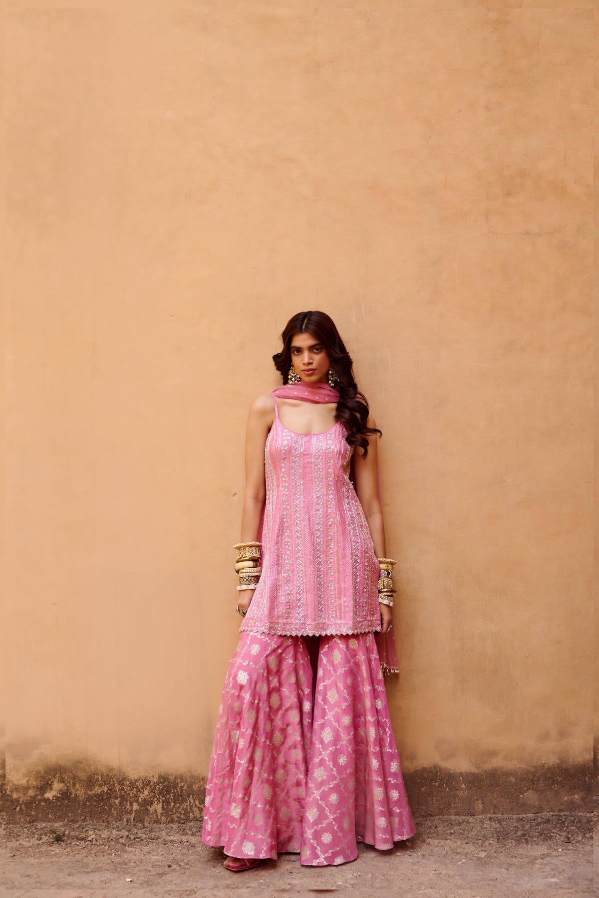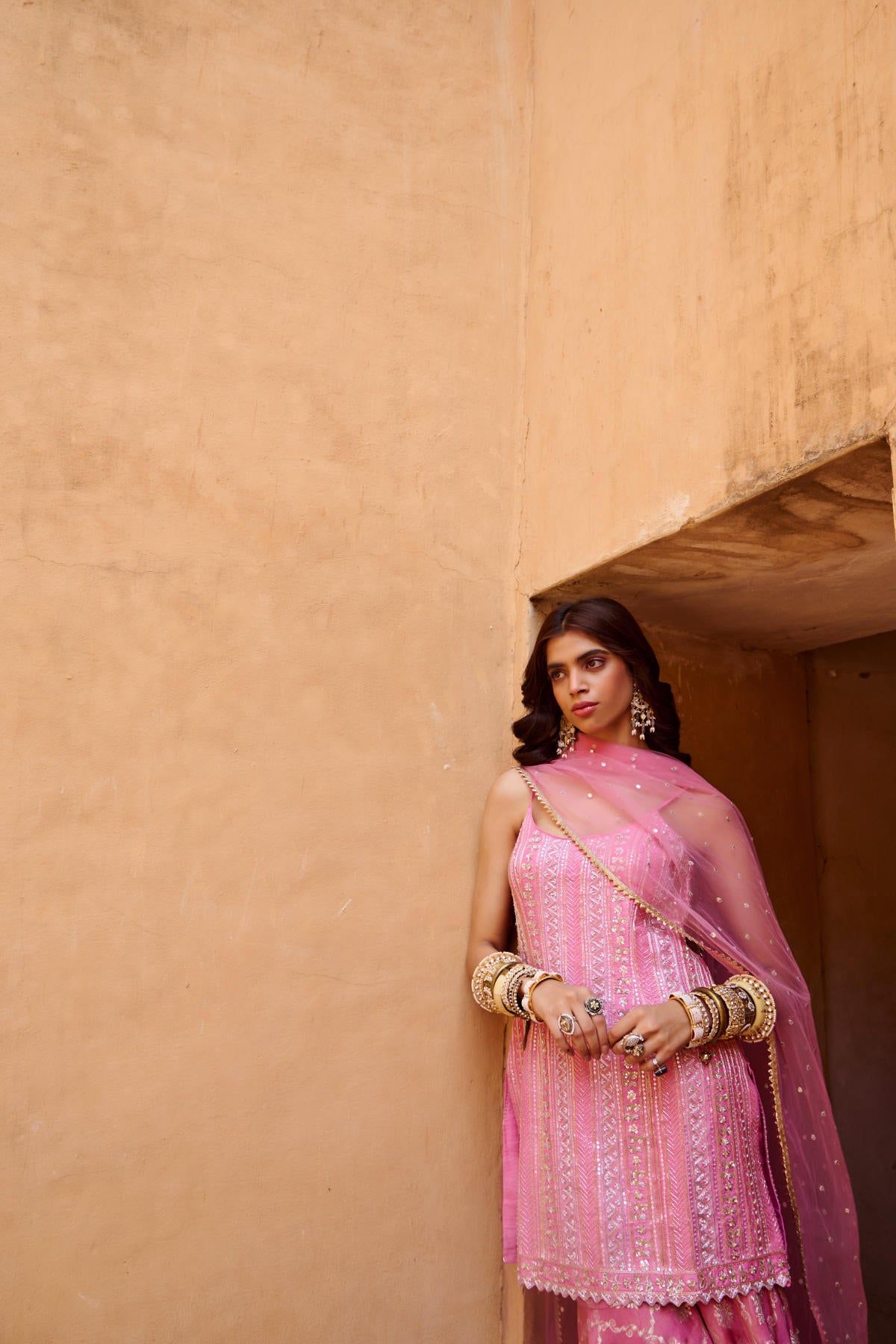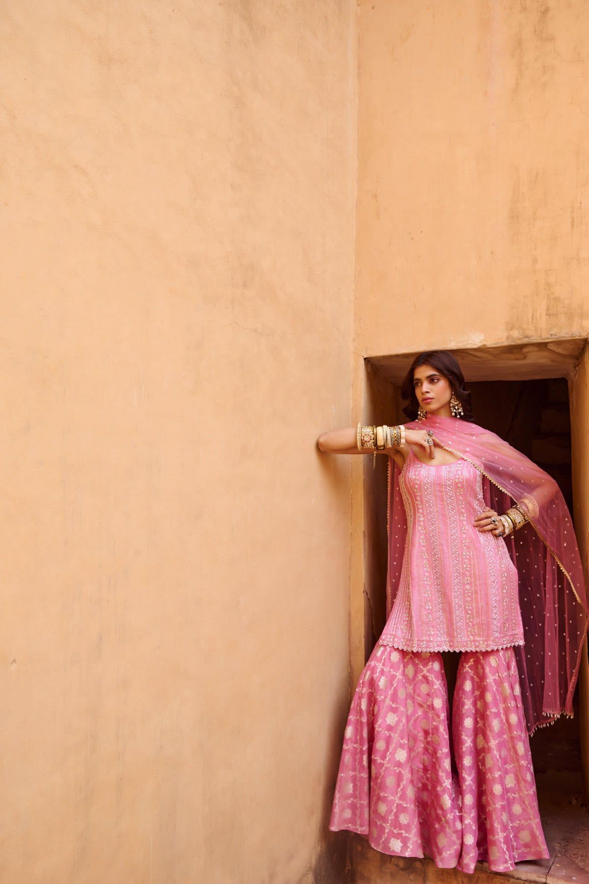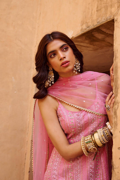 Crepe Kurta With Glass beads, Zardozi And Pearls Embroidery And Jacquard Flared Pants Along With A Tulle Dupatta