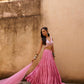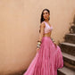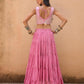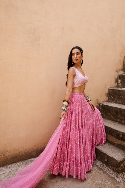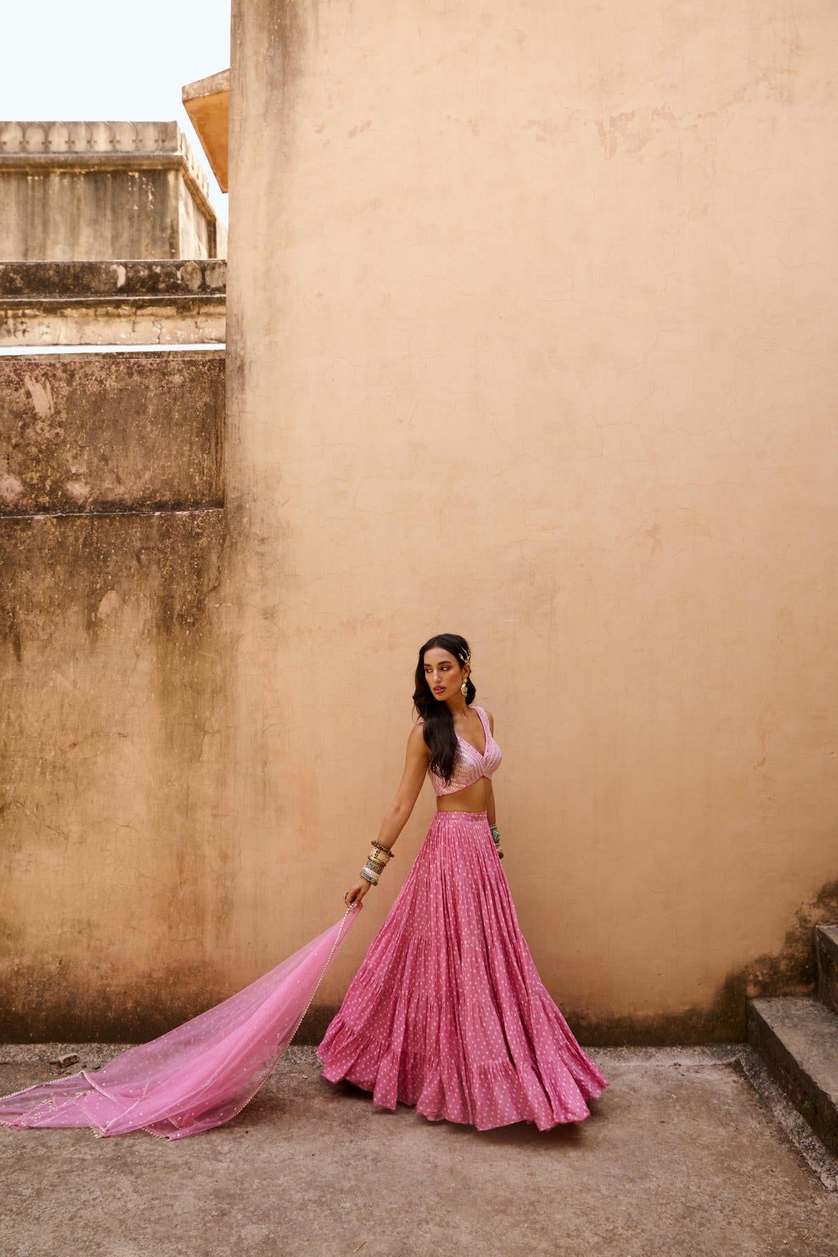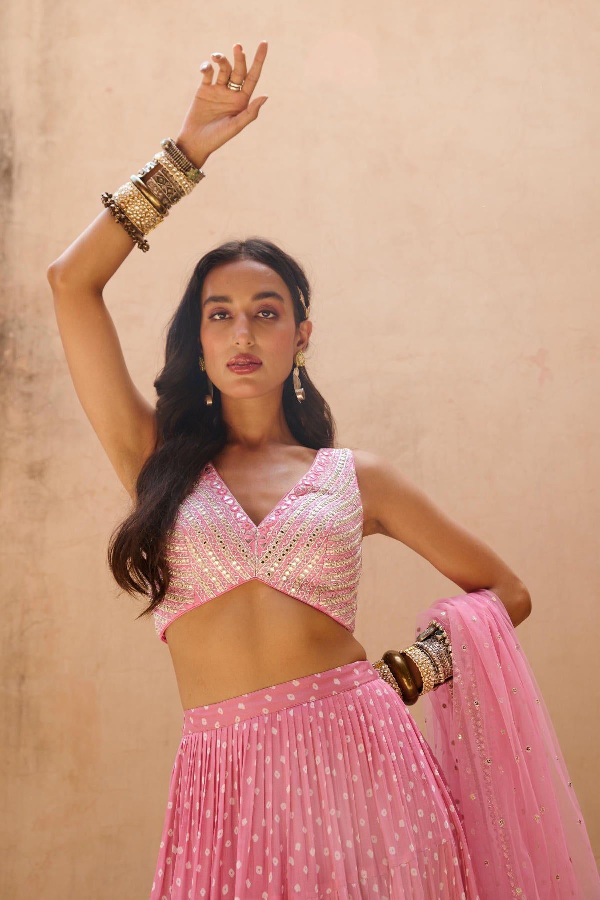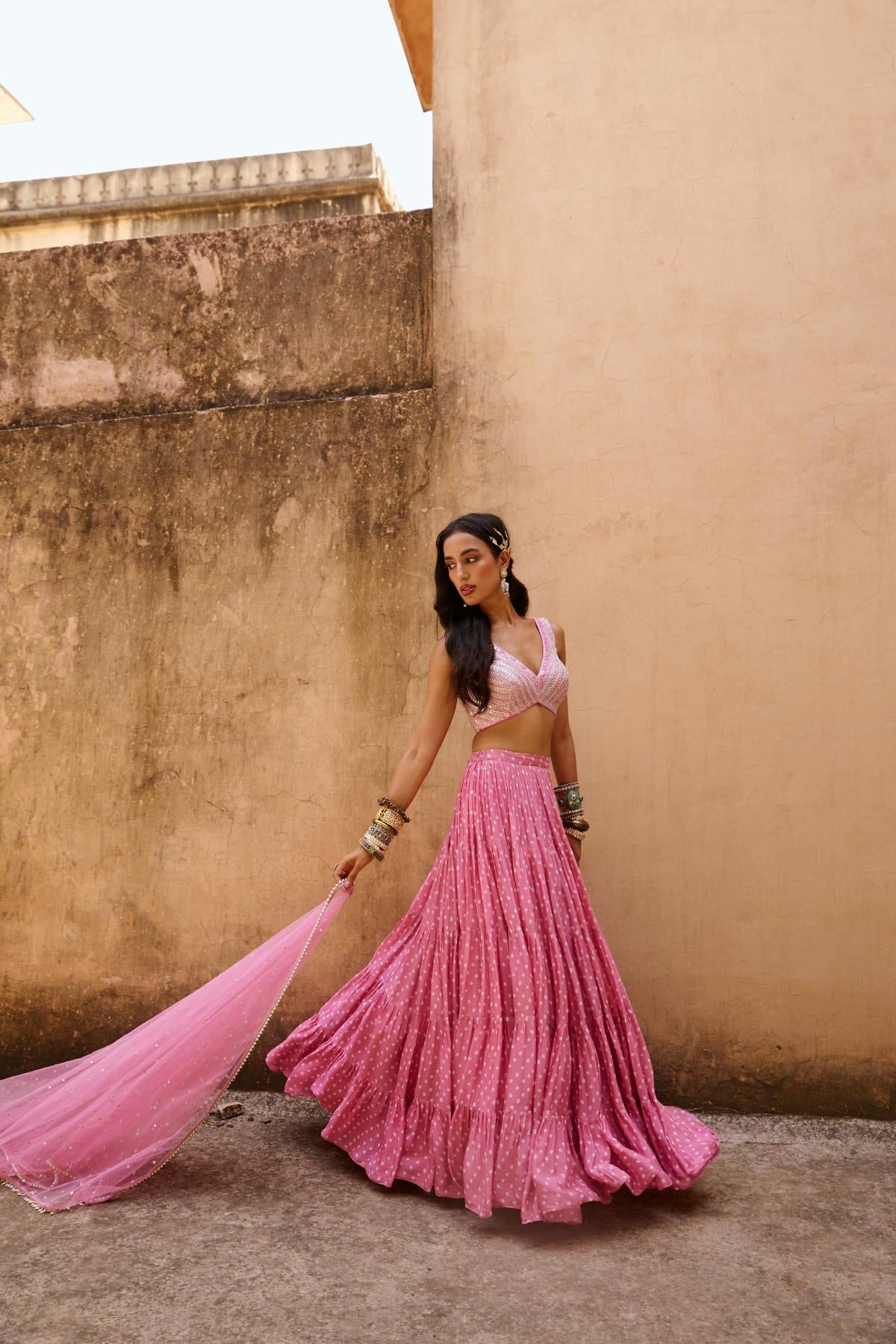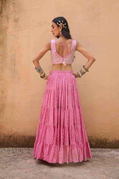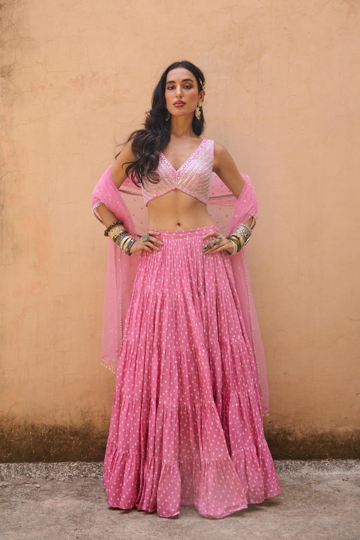 Bandhani Printed Frill Skirt With Mirror And Leather Applique Blouse With Tulle Dupatta