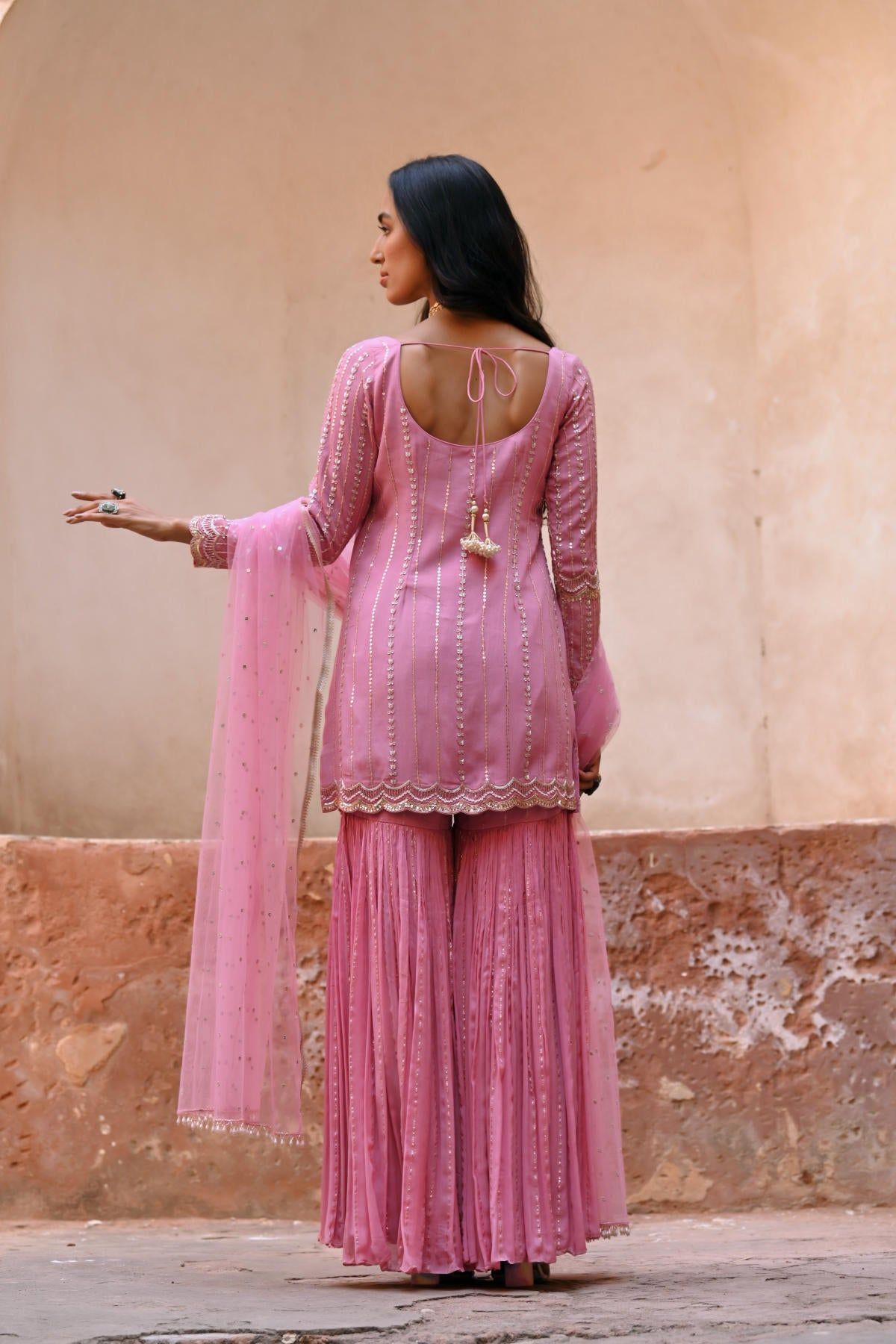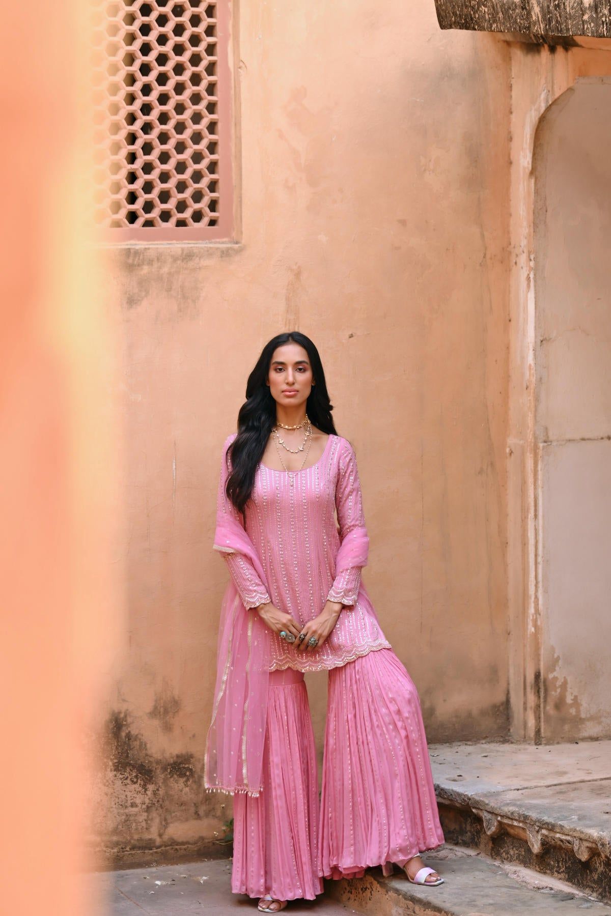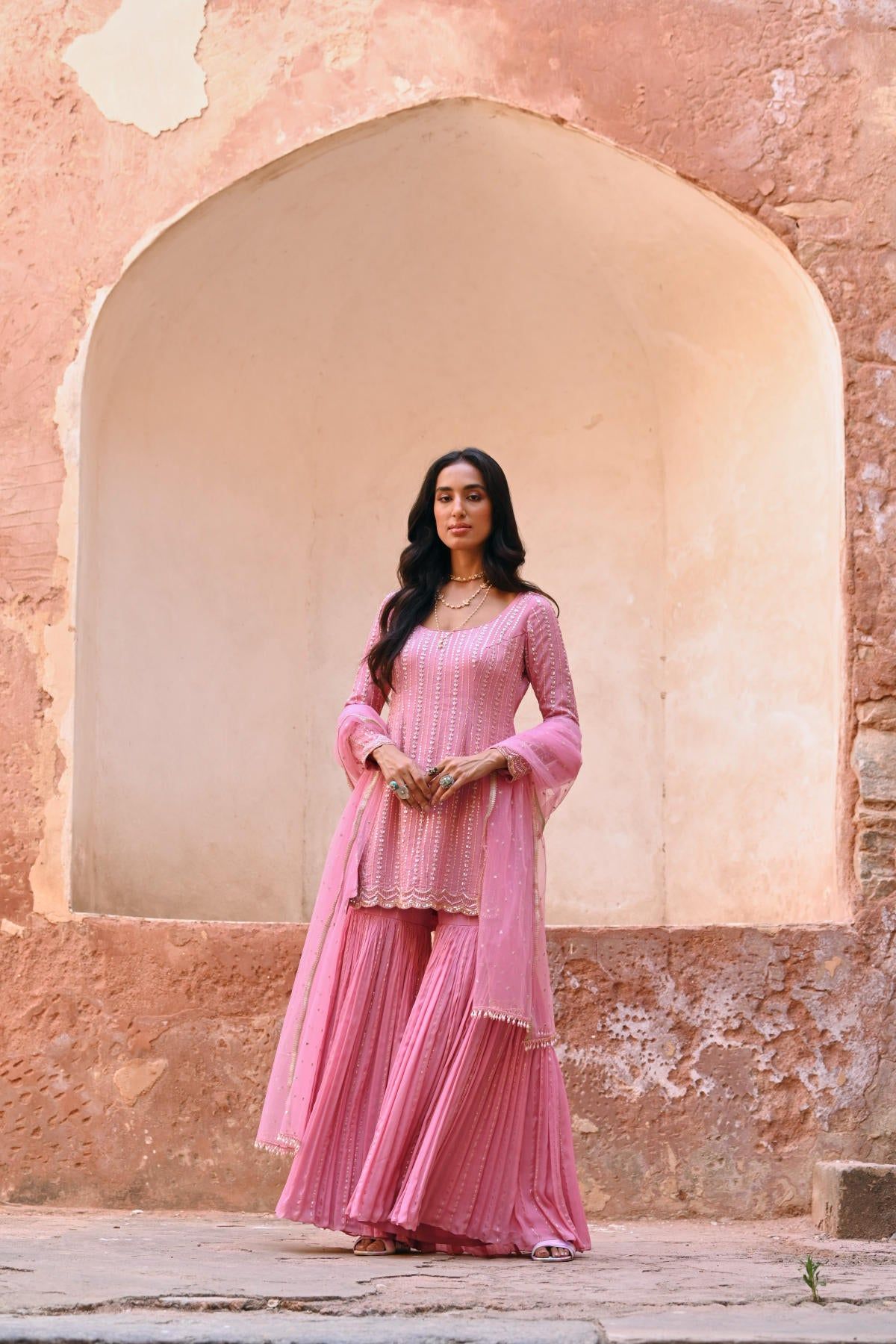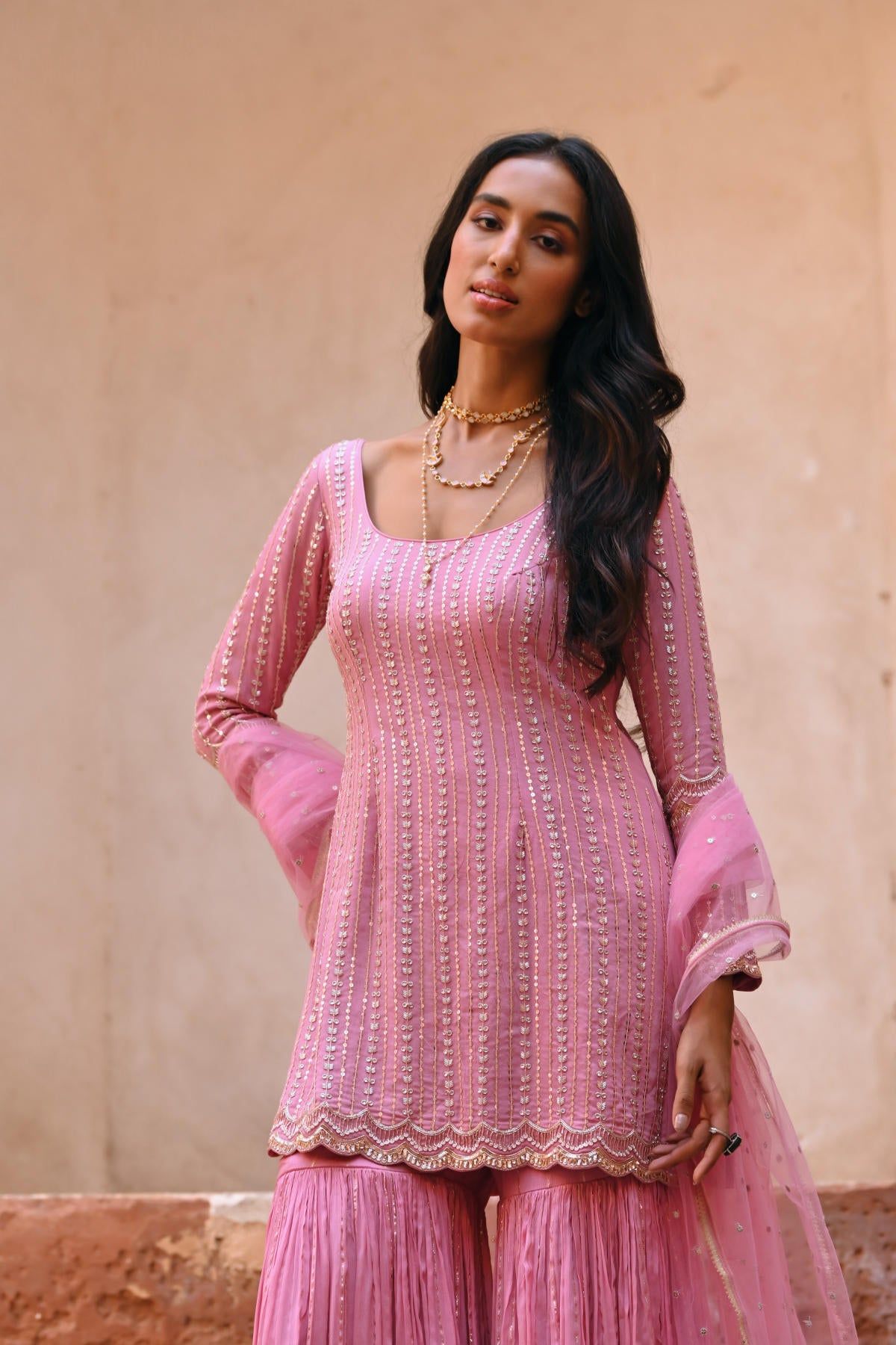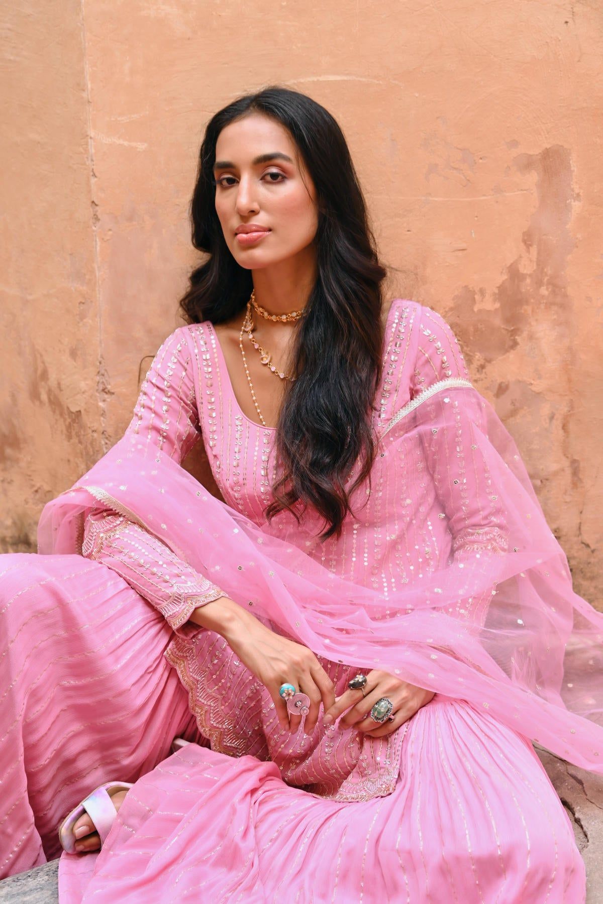 Crepe Kurta With Glass beads And Zardozi Embroidery Paired With Flared Pants And Tulle Dupatta