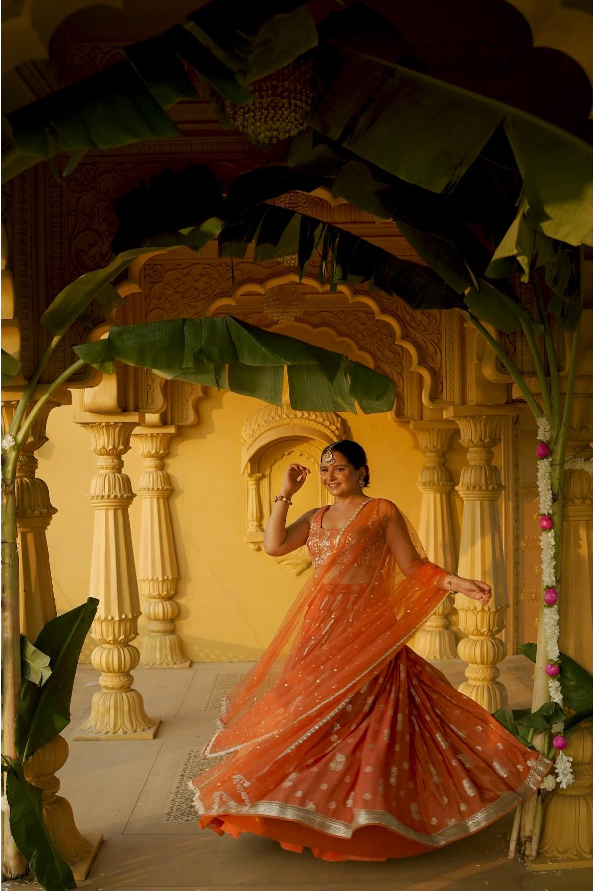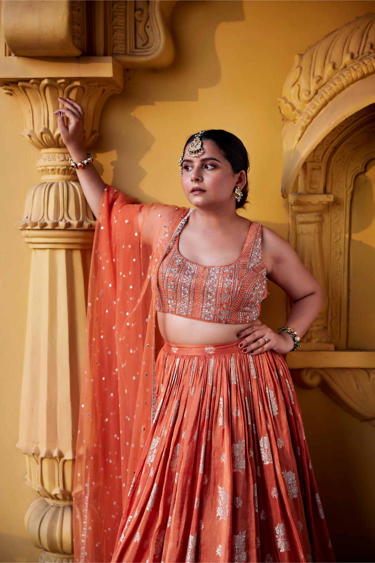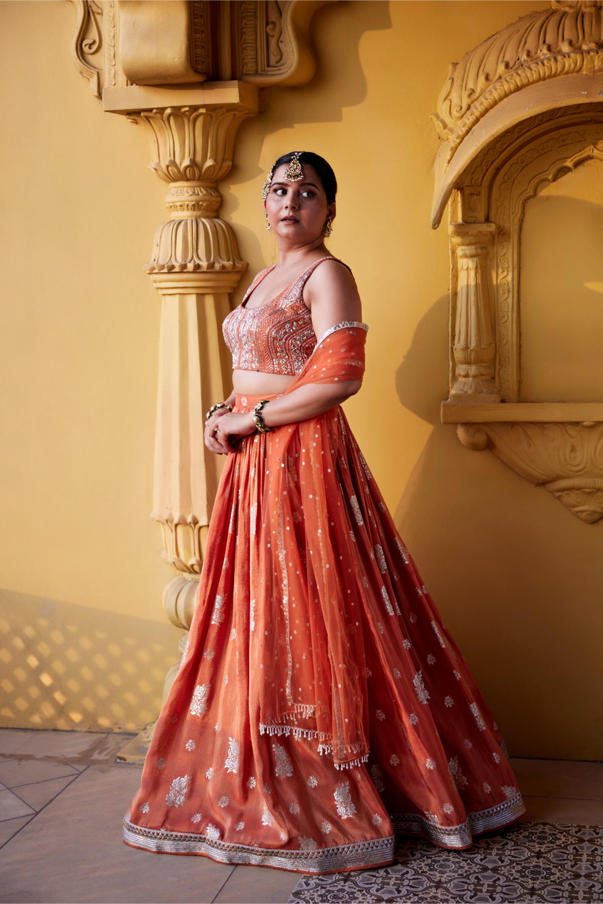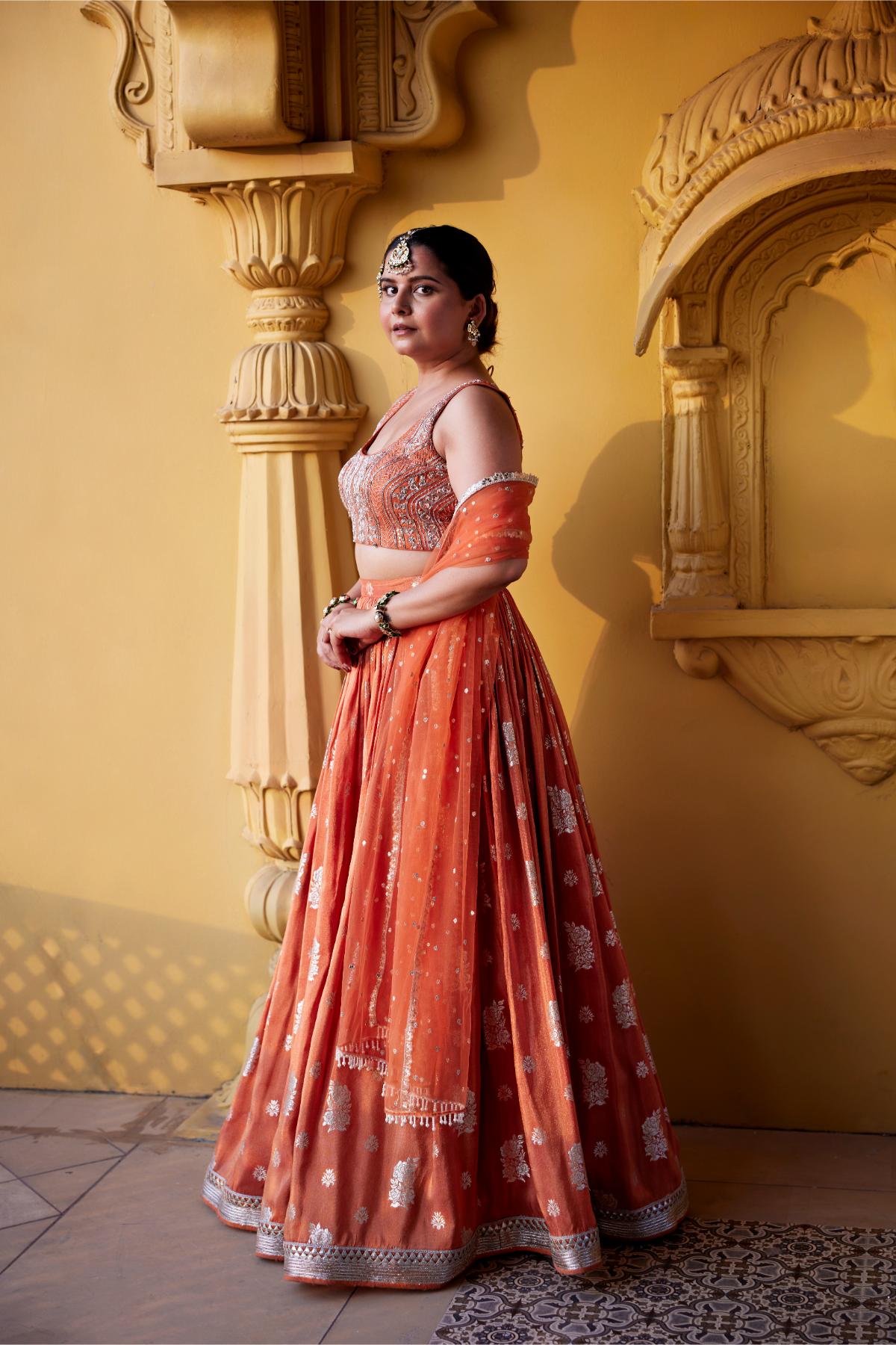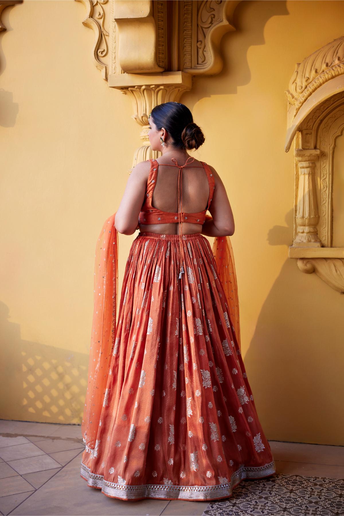 Glass Beads & Zardosi Embroidered Scoop Neck Blouse Paired With Rust Flared Jamewar Skirt And Tulle Dupatta