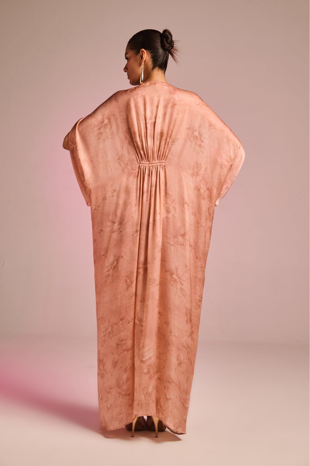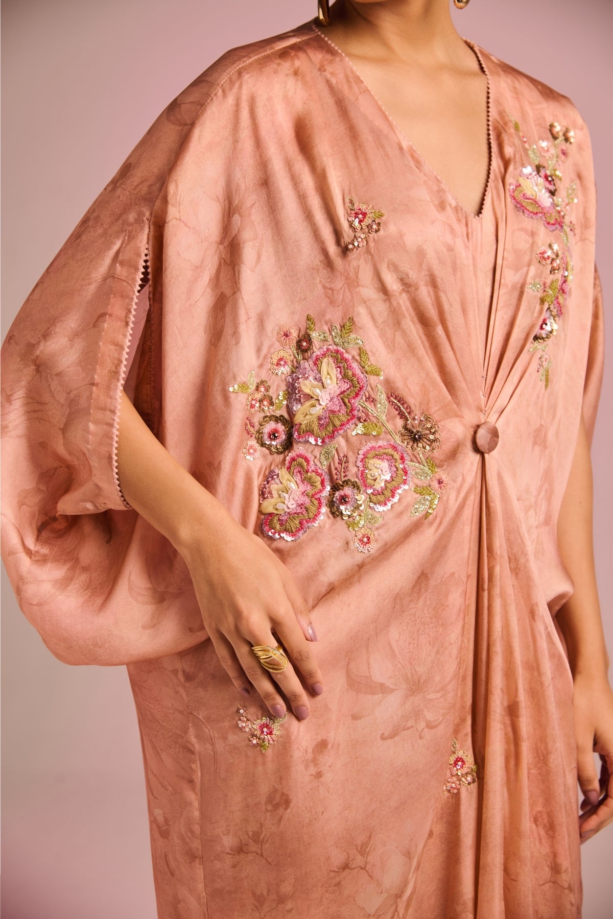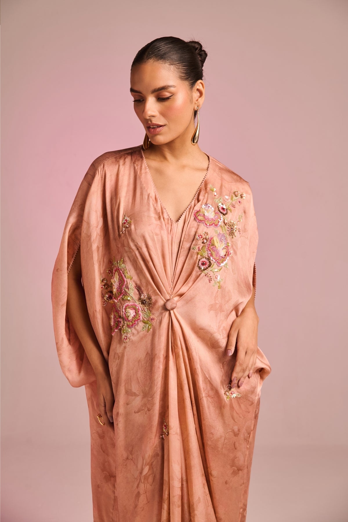 Embrace Elegance In The Enchanting Drape Kaftan, Featuring Delicate Sequine Floral Detailing Made With Hand Embroidery And V Shape Neckline. A Captivating Piece That Exudes Grace And Sophistication For Any Special Occasion.