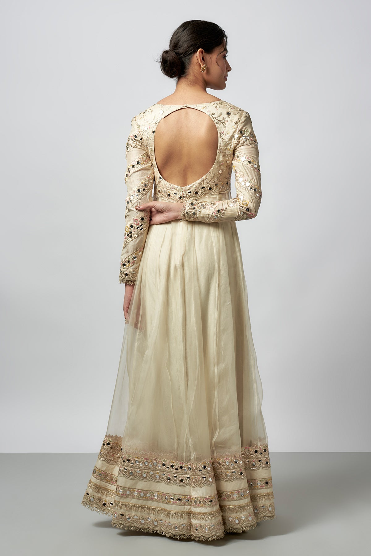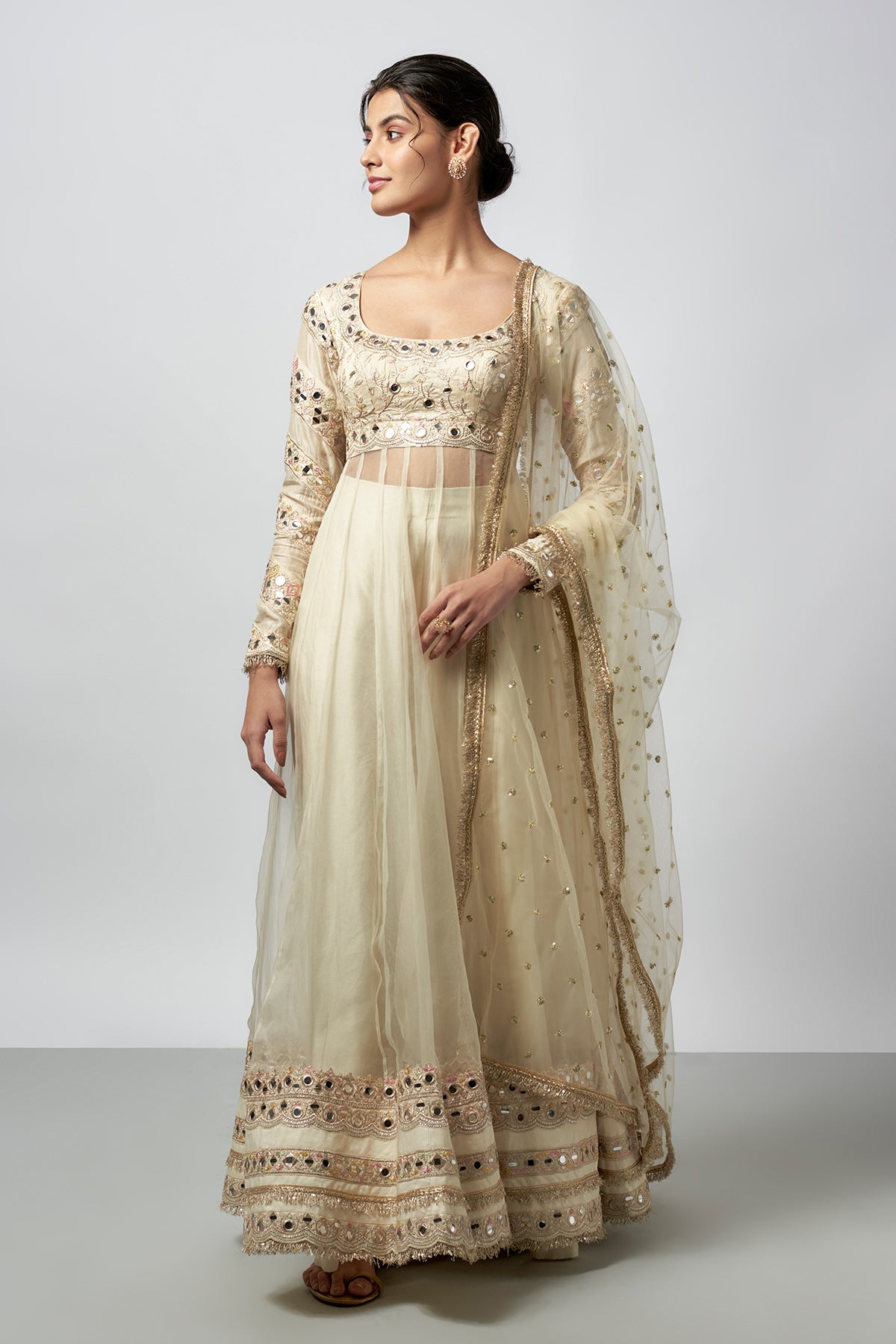 This Elegant Anarkali Features Intricate Embroidery With Mirror Detailing And Delicate Patterns. The Long Sleeves Mirror The Embroidery On The Bodice. A Matching Net Dupatta With Subtle Sequins Drapes Gracefully Over The Shoulder.
