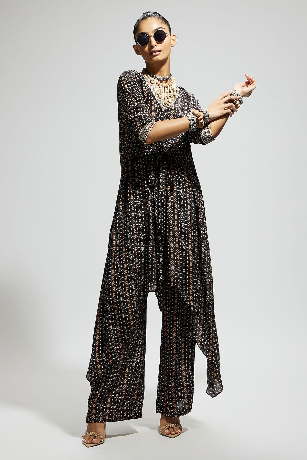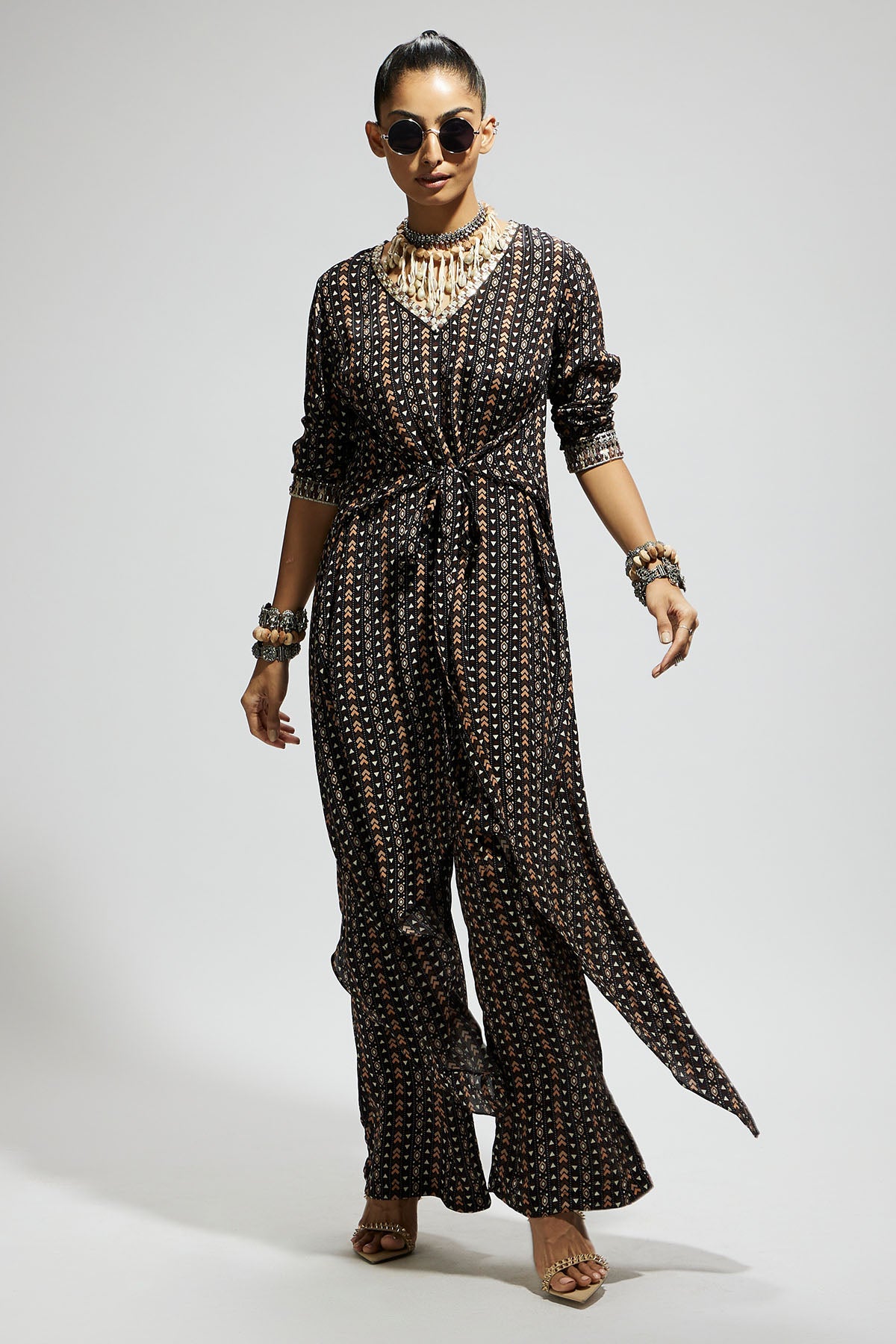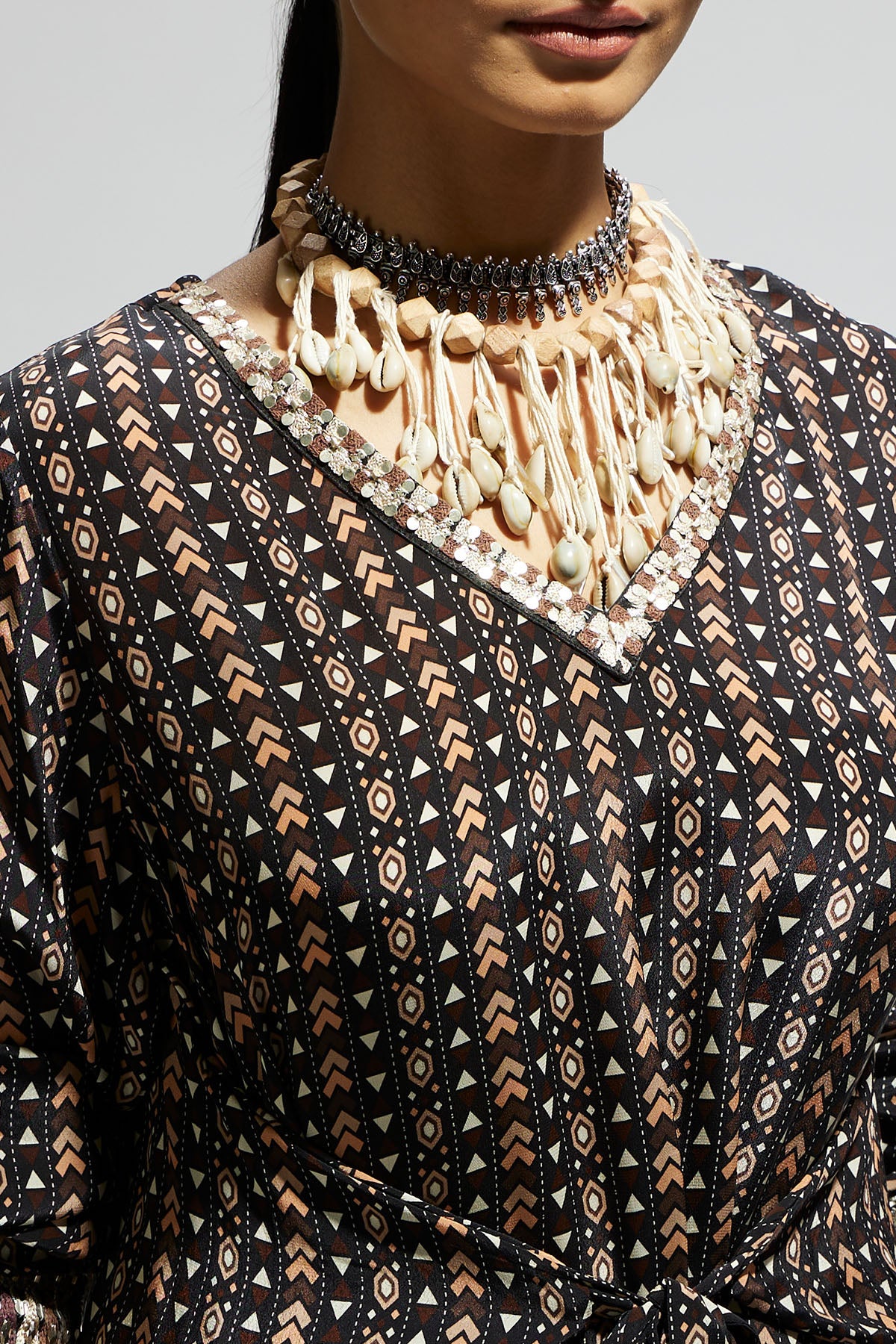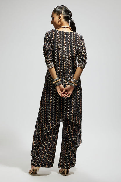 Black Boho Print Front Tie up Tunic